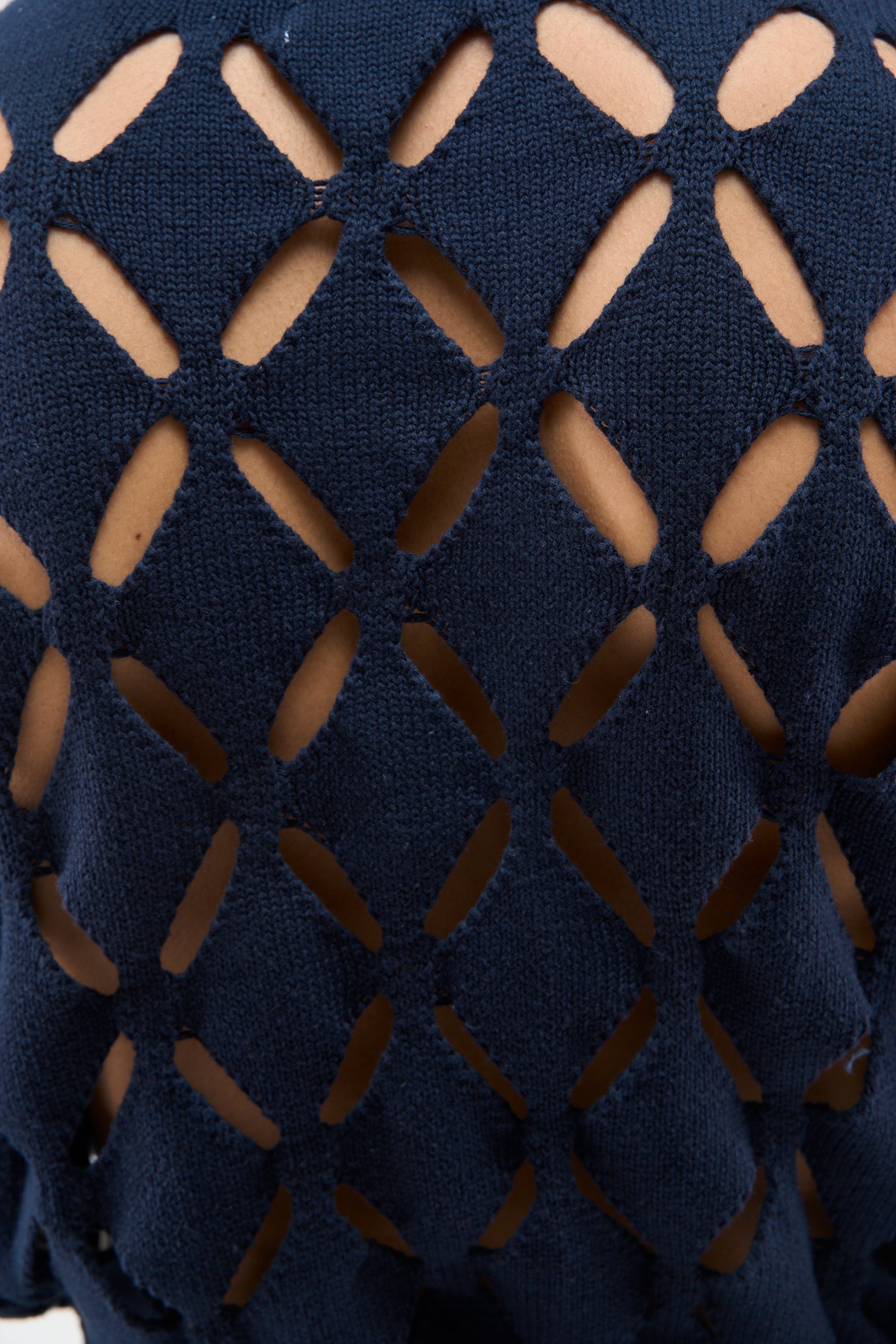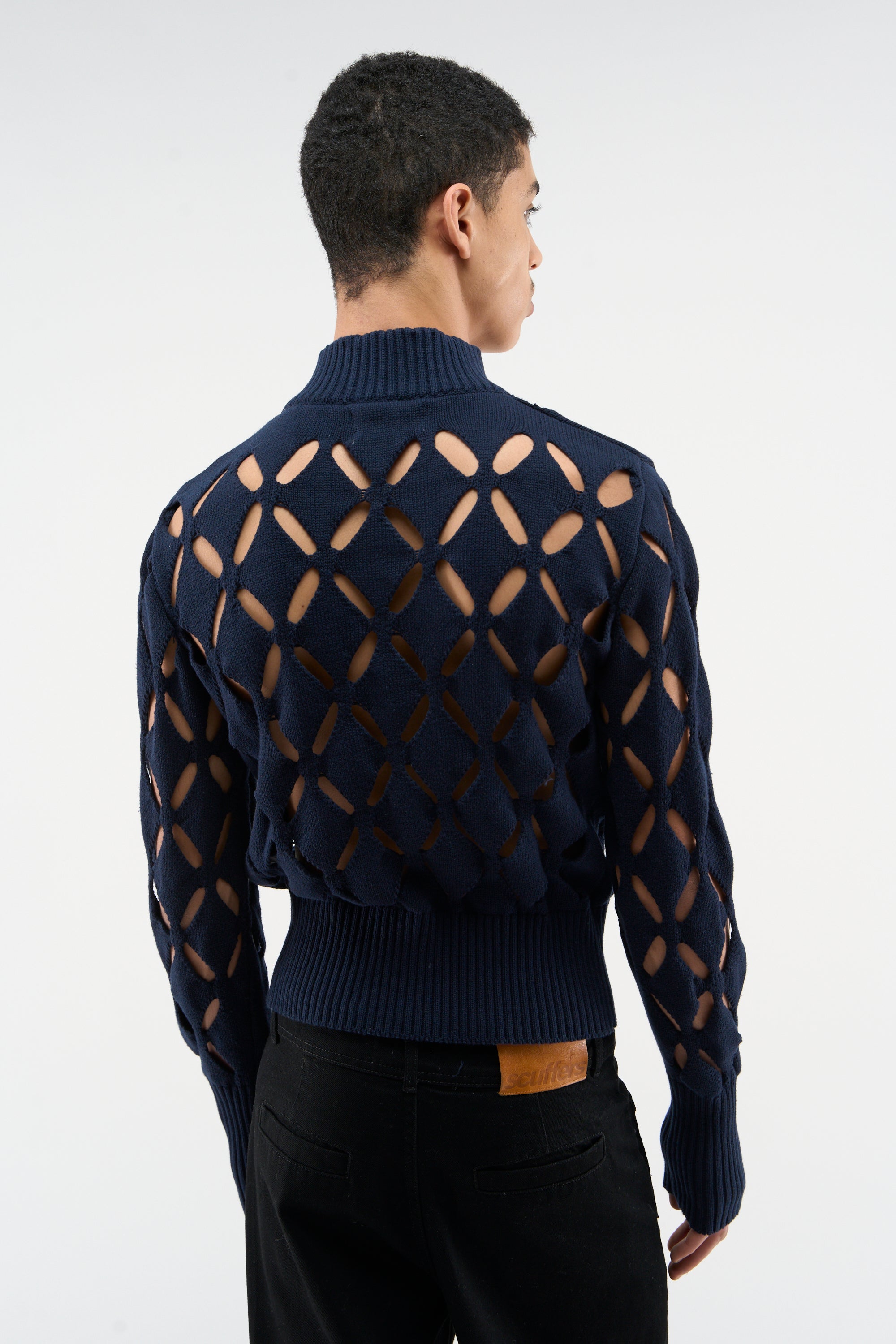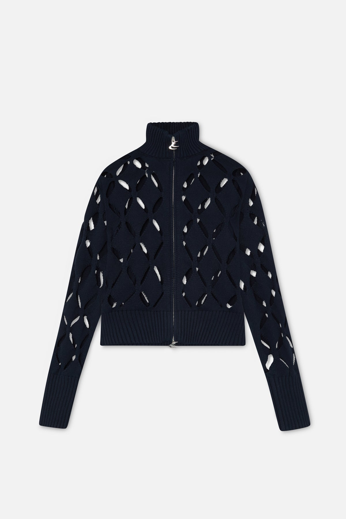 Navy Open-Knit Zip-Up Cardigan in soft cotton blend with a slim, cropped fit. Full zip closure with high ribbed collar and metal pull detail. All-over geometric cut-out pattern. Ribbed cuffs and hem for structure.