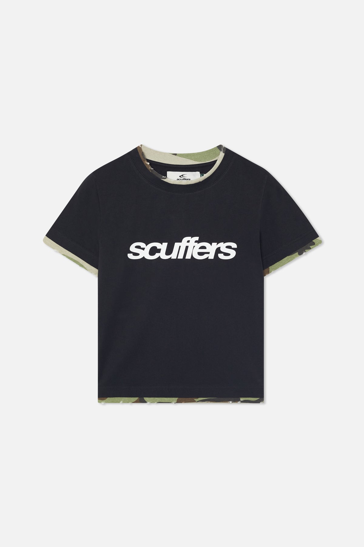 Black cropped t-shirt with a bold Scuffers logo printed in white across the chest. Features a crew neckline and camo-print contrast trim at the collar and hem. Fitted with a modern cropped length.