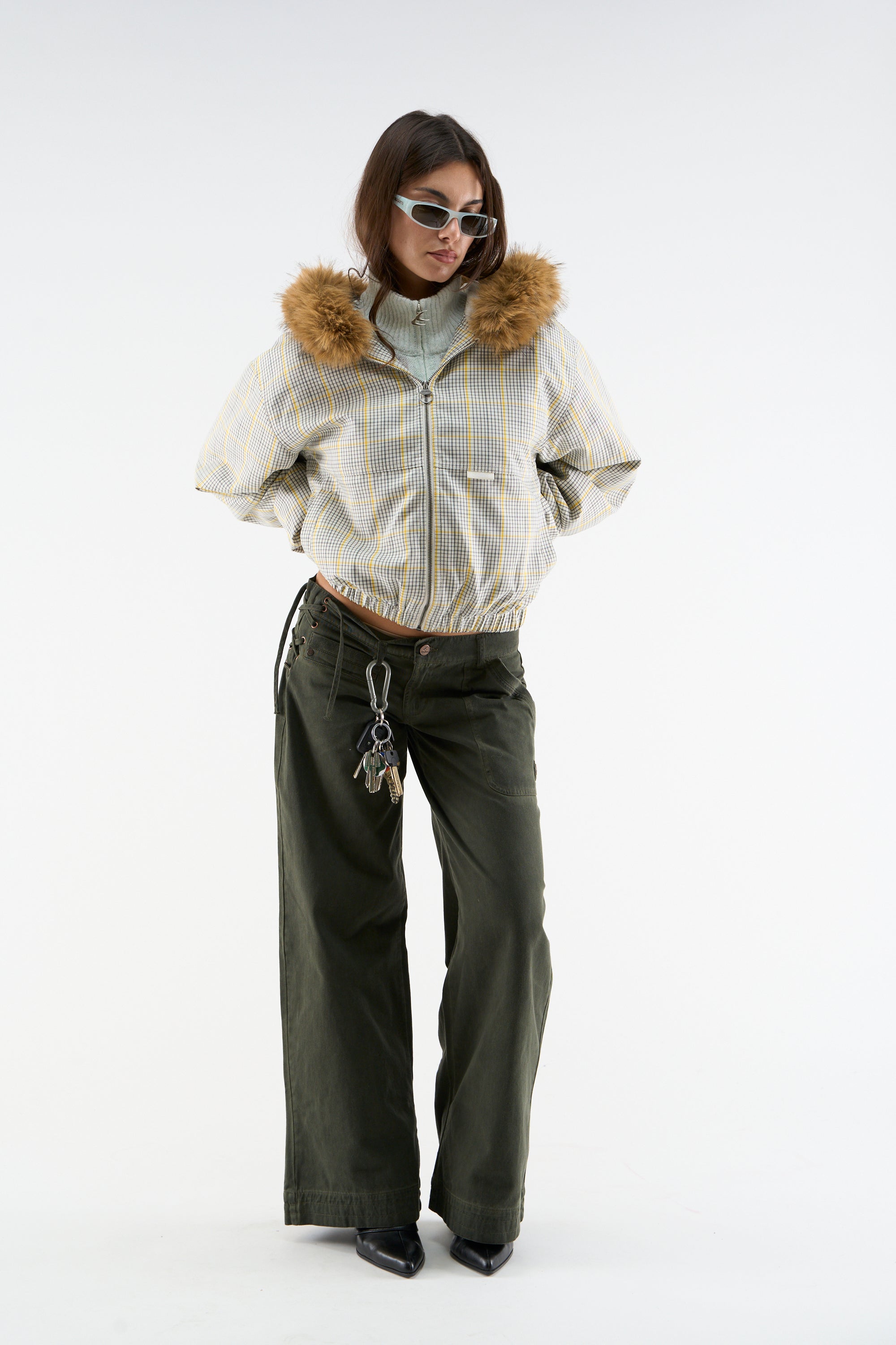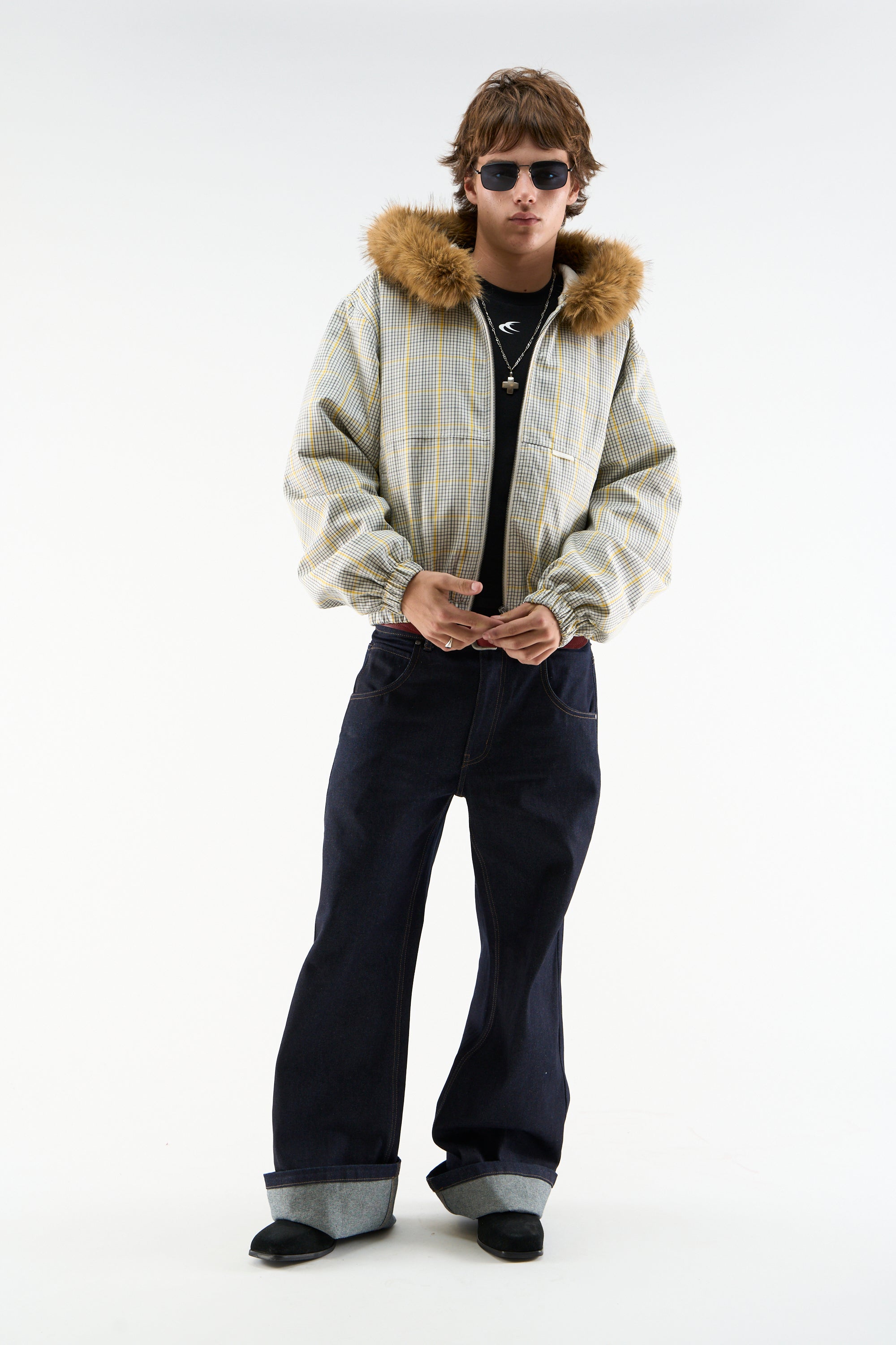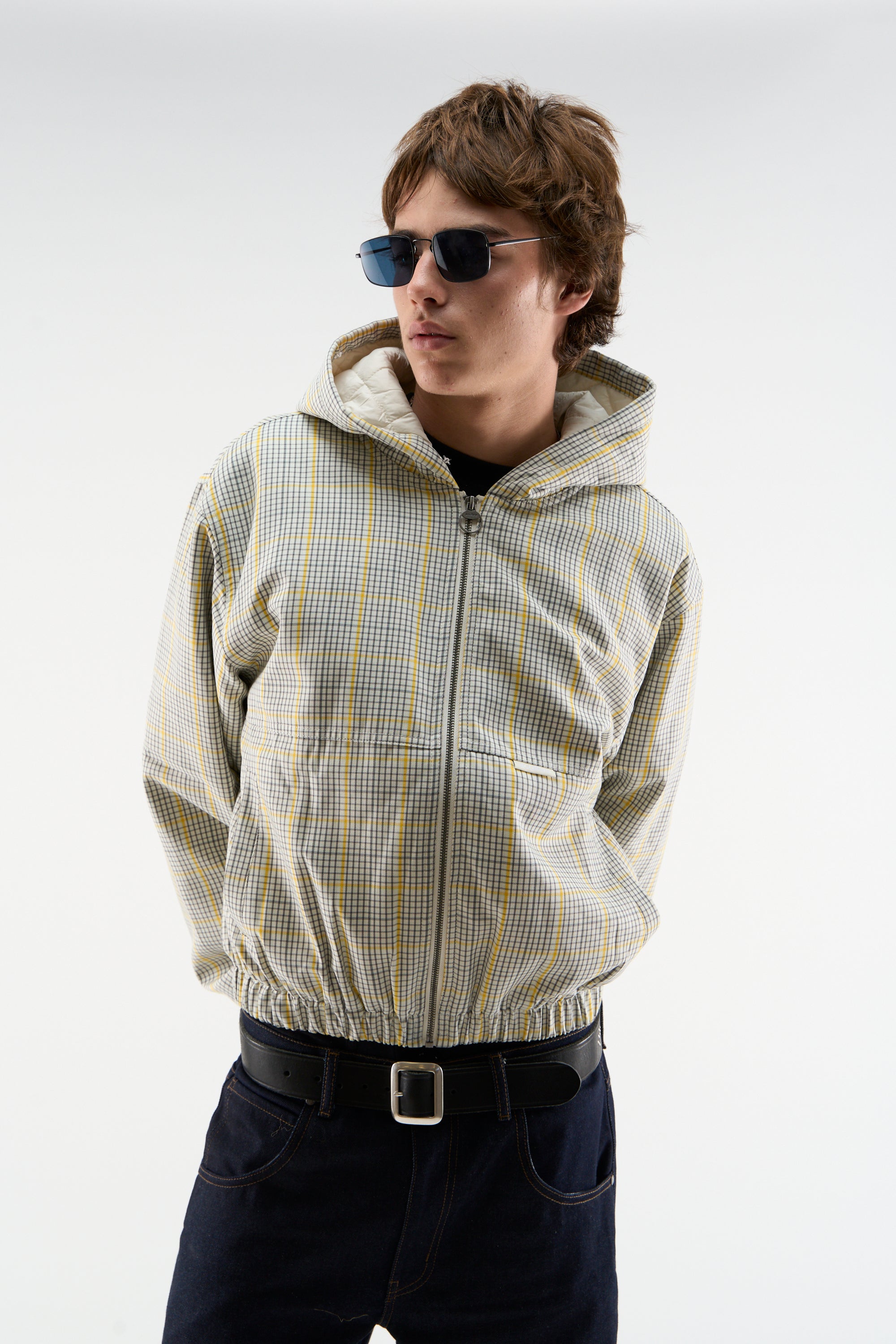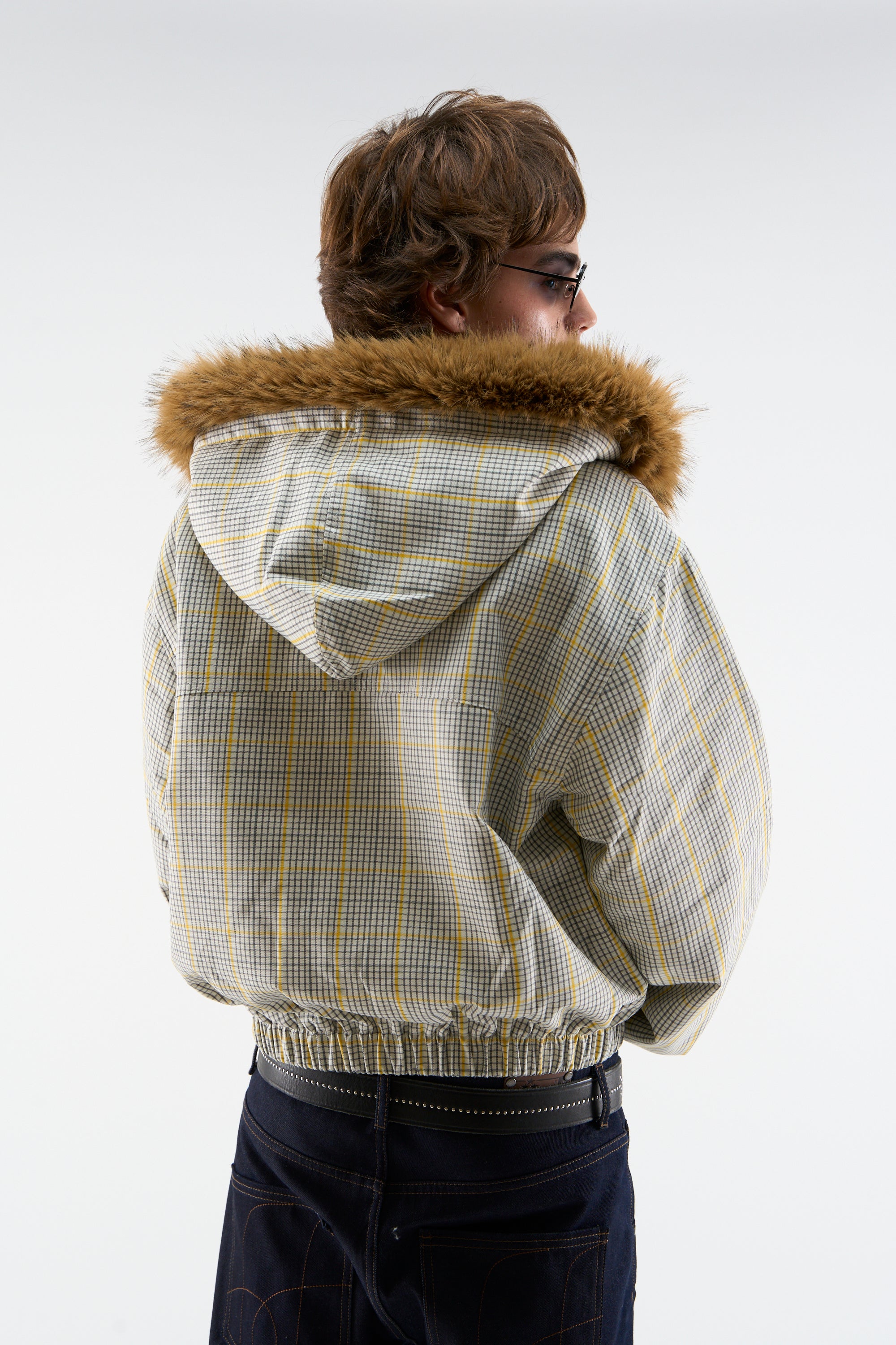 Plaid Hooded Jacket made from lightweight cotton blend with a grey, white, and yellow check pattern. Features a relaxed fit, full zip closure, and oversized hood trimmed with brown faux fur. Elasticated cuffs and hem, and small woven logo label on the front.