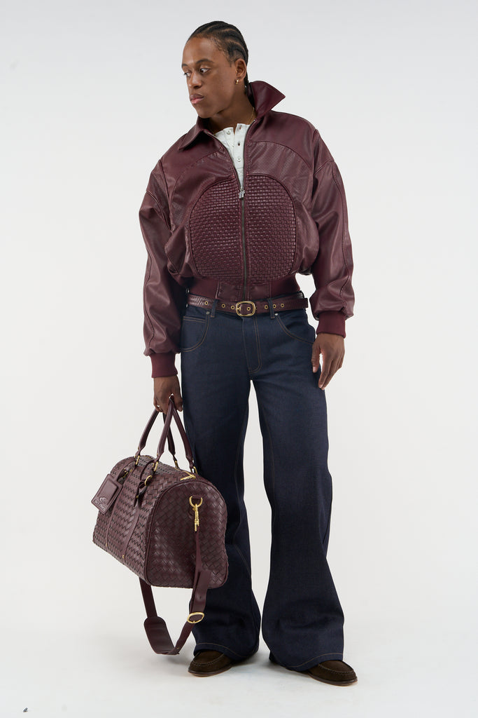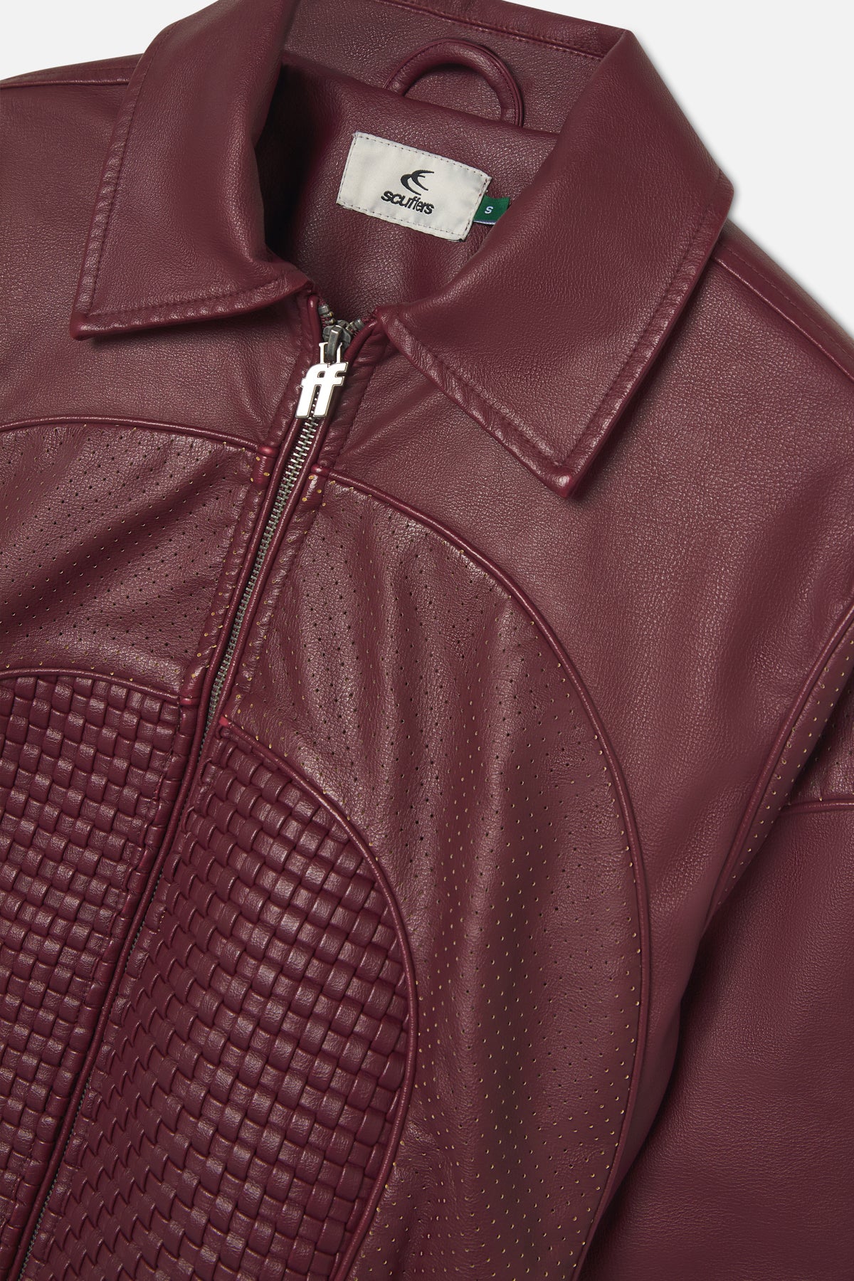 Burgundy Faux Leather Bomber Jacket with a modern, sporty design. Features a zip-up front, wide ribbed cuffs and hem, and a perforated panel with woven detailing on the front for added texture. The jacket has a classic collar and a subtle perforated logo on the back for a sleek finish. The relaxed fit and smooth faux leather material give it a stylish, edgy look.