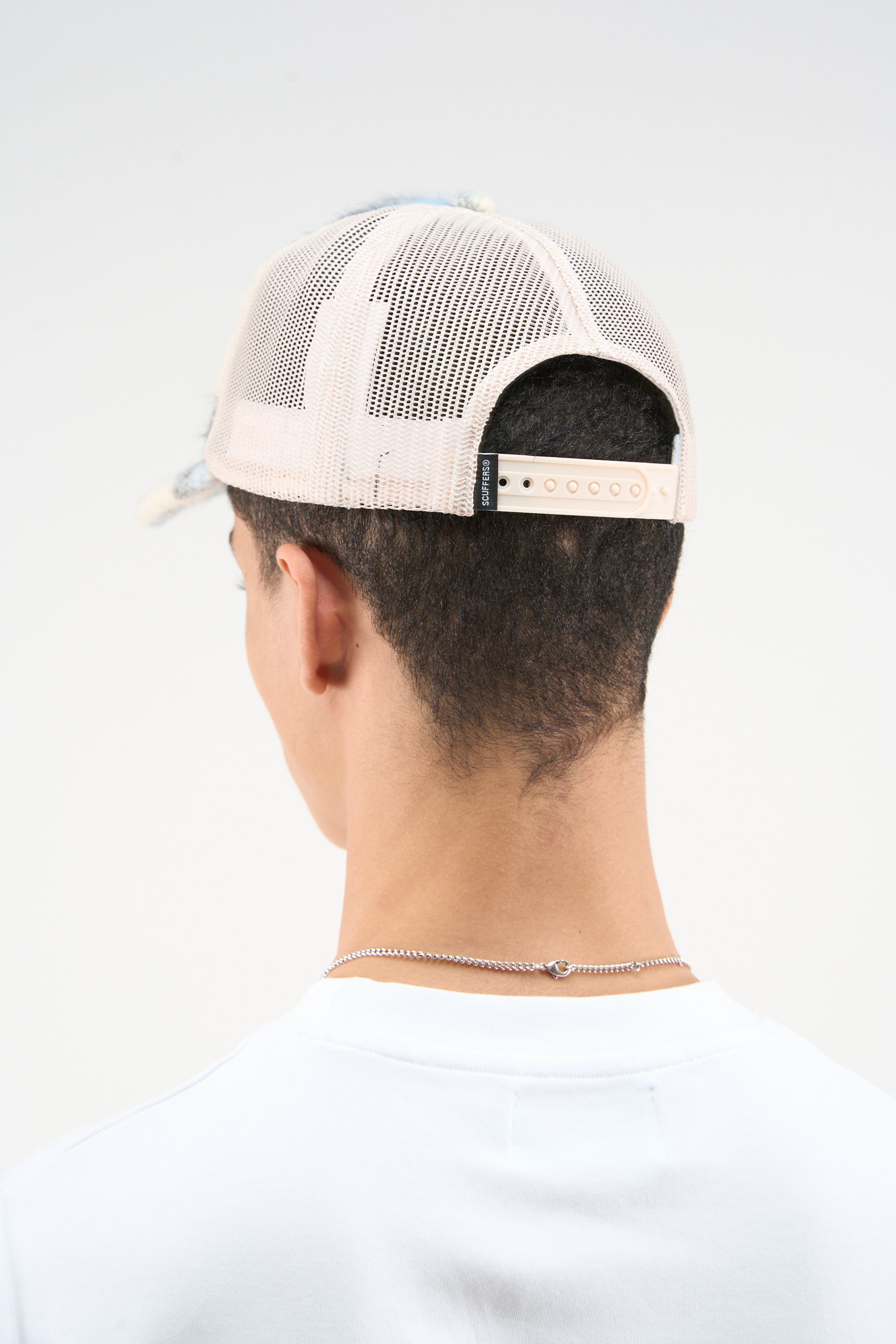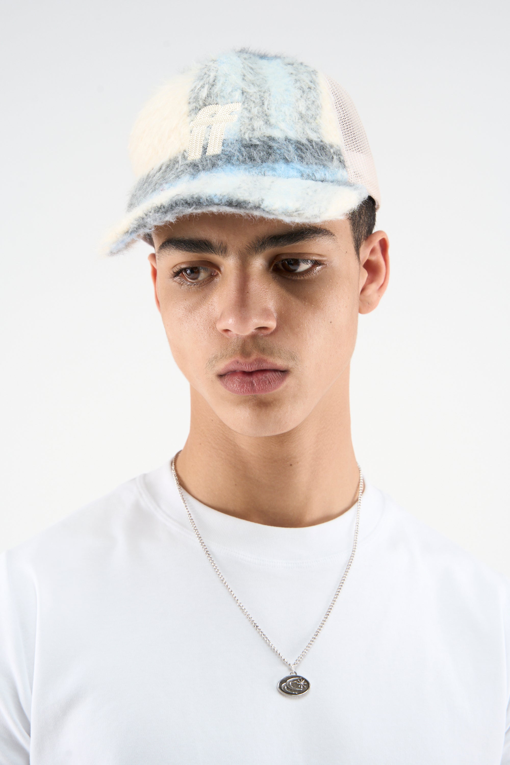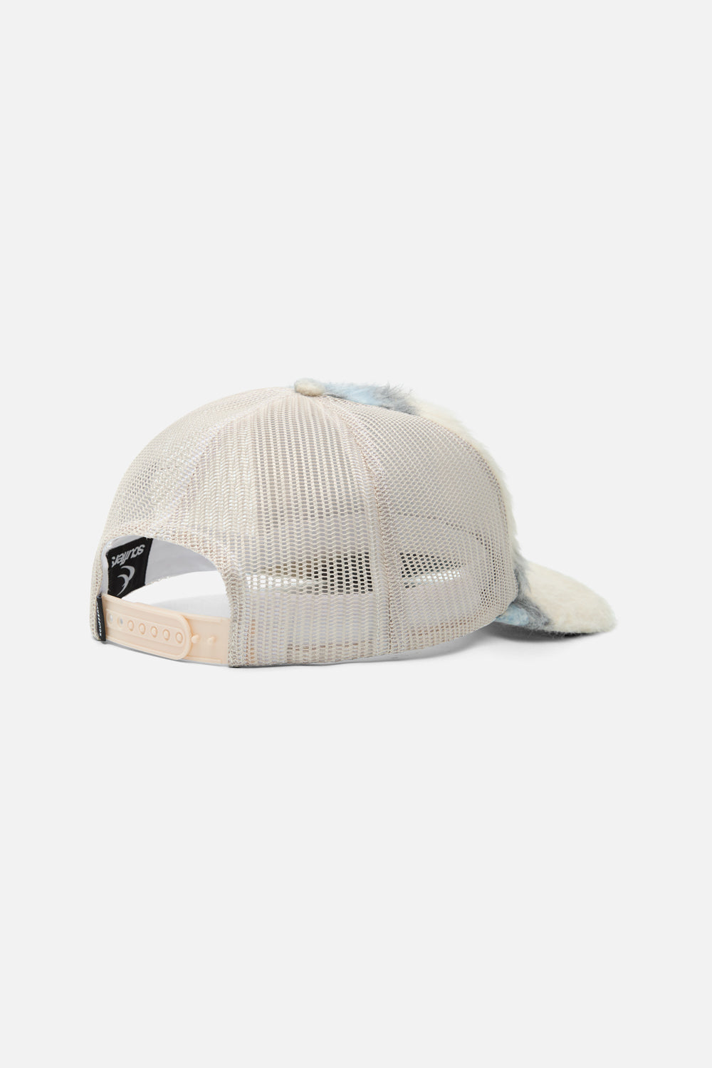 Fuzzy Patchwork Cap in Soft Blue and Cream. Made from a mix of plush materials for a cozy, textured feel. The front features a bold, metallic “ff” logo, adding a touch of shine. The cap showcases a unique patchwork design in varying shades of blue and cream, creating a soft, gradient effect. The back is designed with breathable mesh panels for comfort and a snapback closure for an adjustable fit.