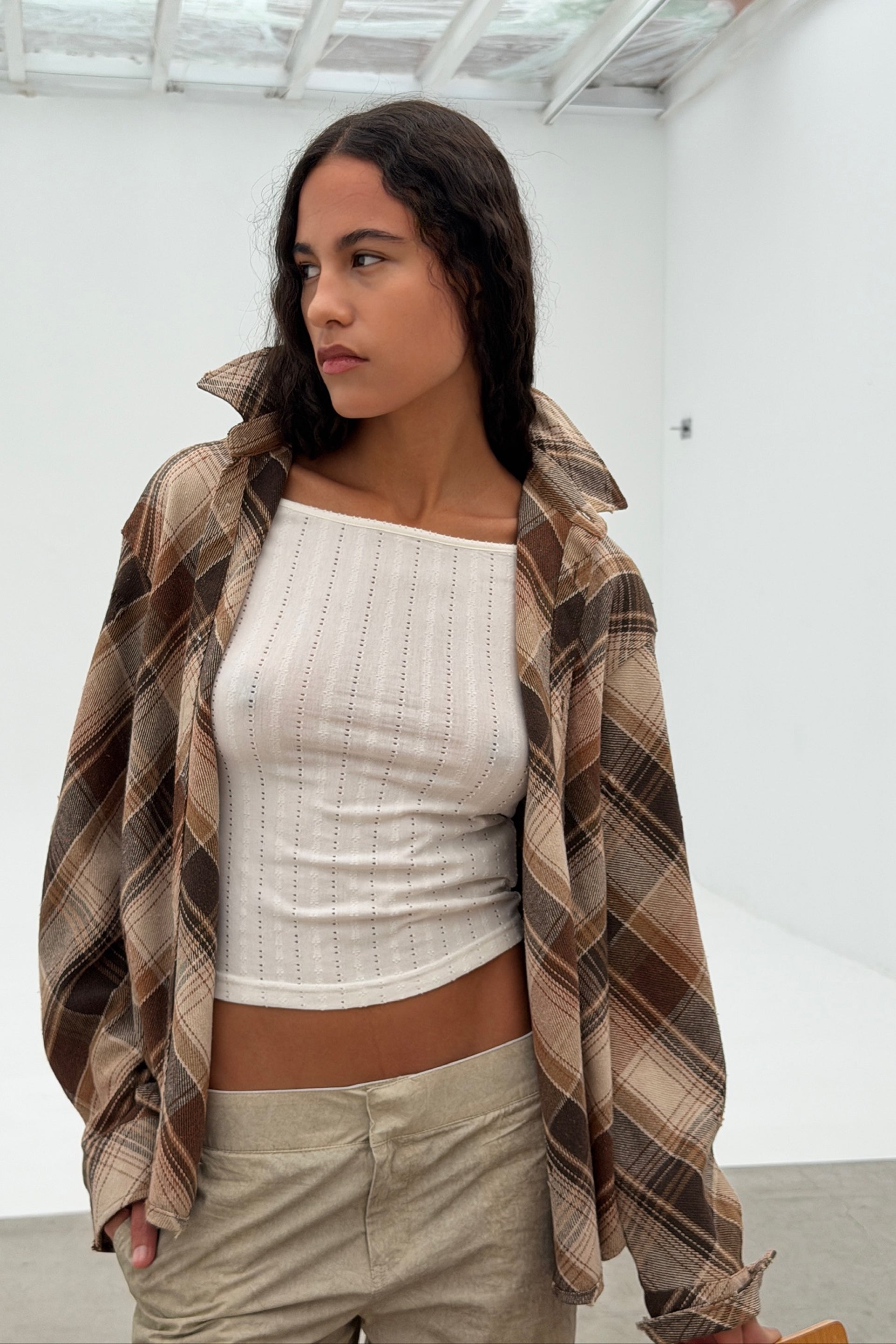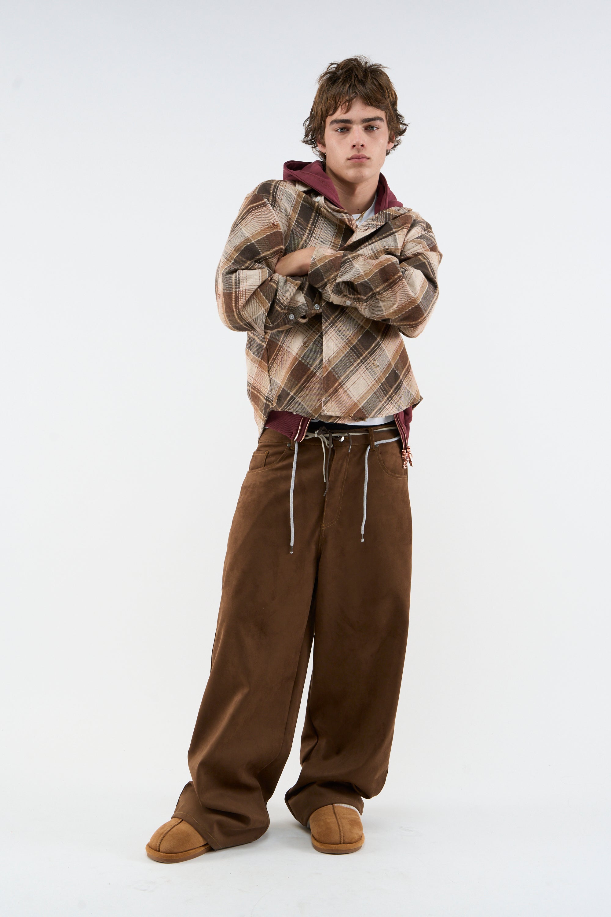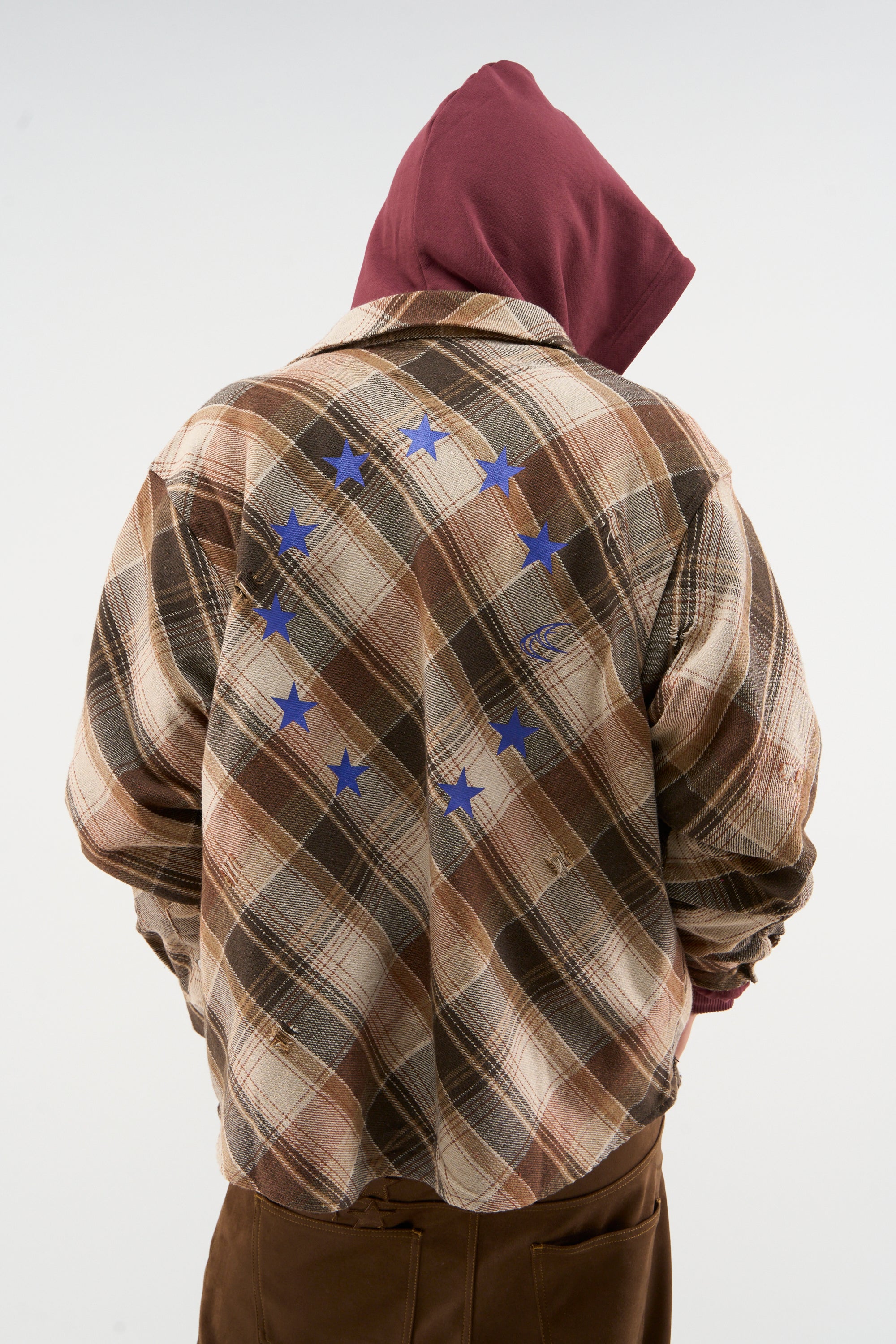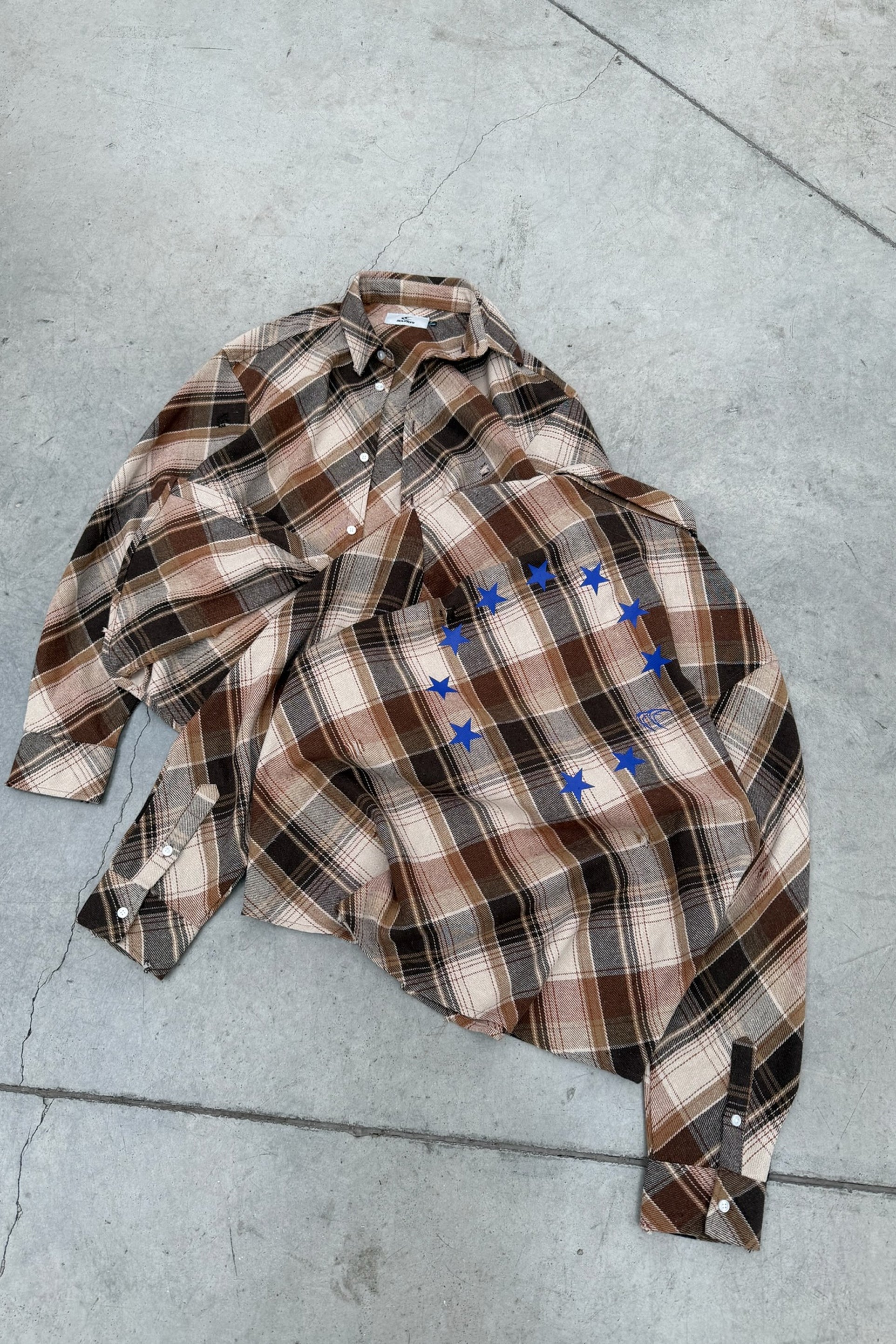 Brown Distressed Plaid Shirt in brushed cotton flannel with an oversized fit. Features all-over check pattern, button front closure, and small intentional abrasions throughout. Printed blue stars and Scuffers logo graphic on the back. Curved hem and button cuffs.