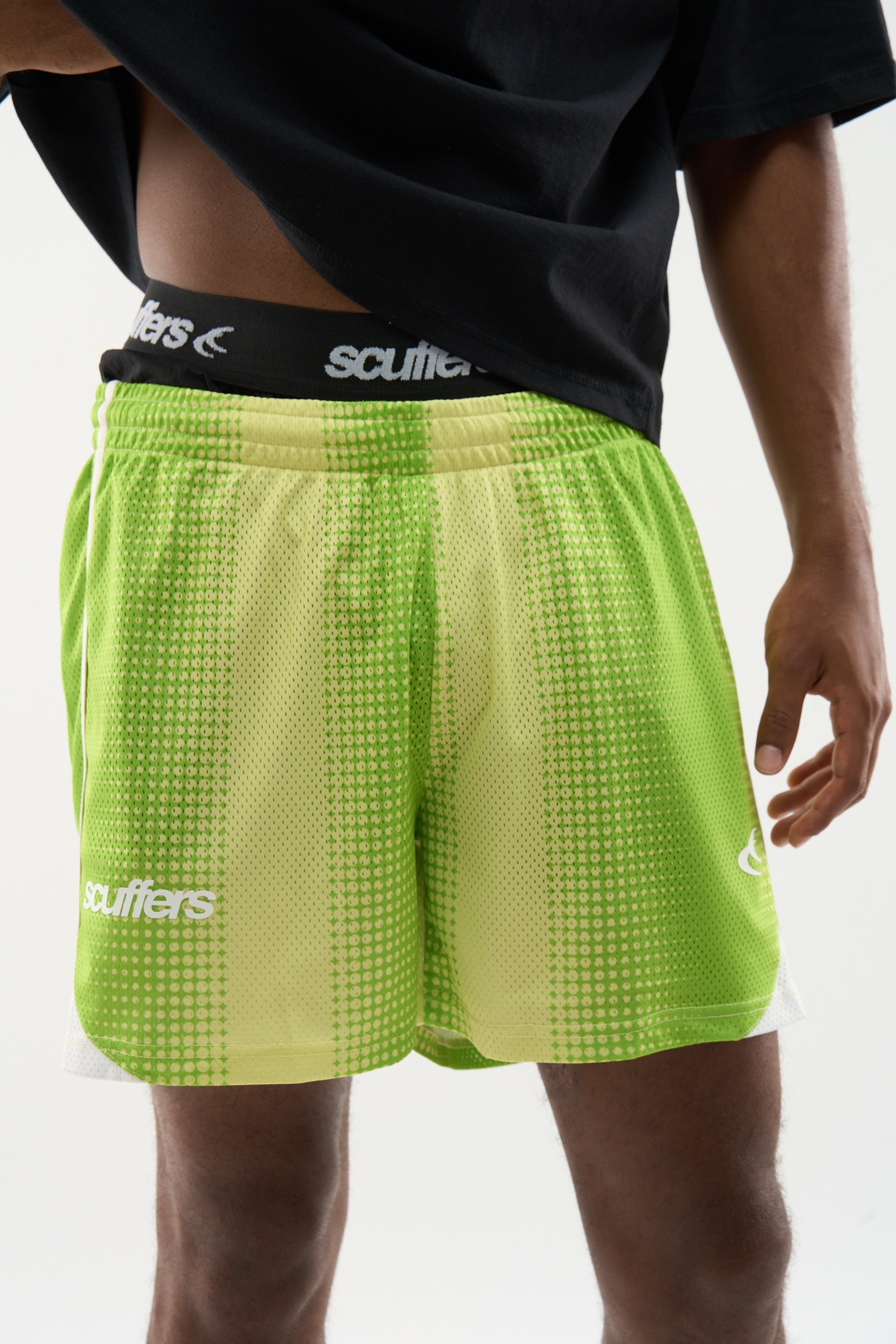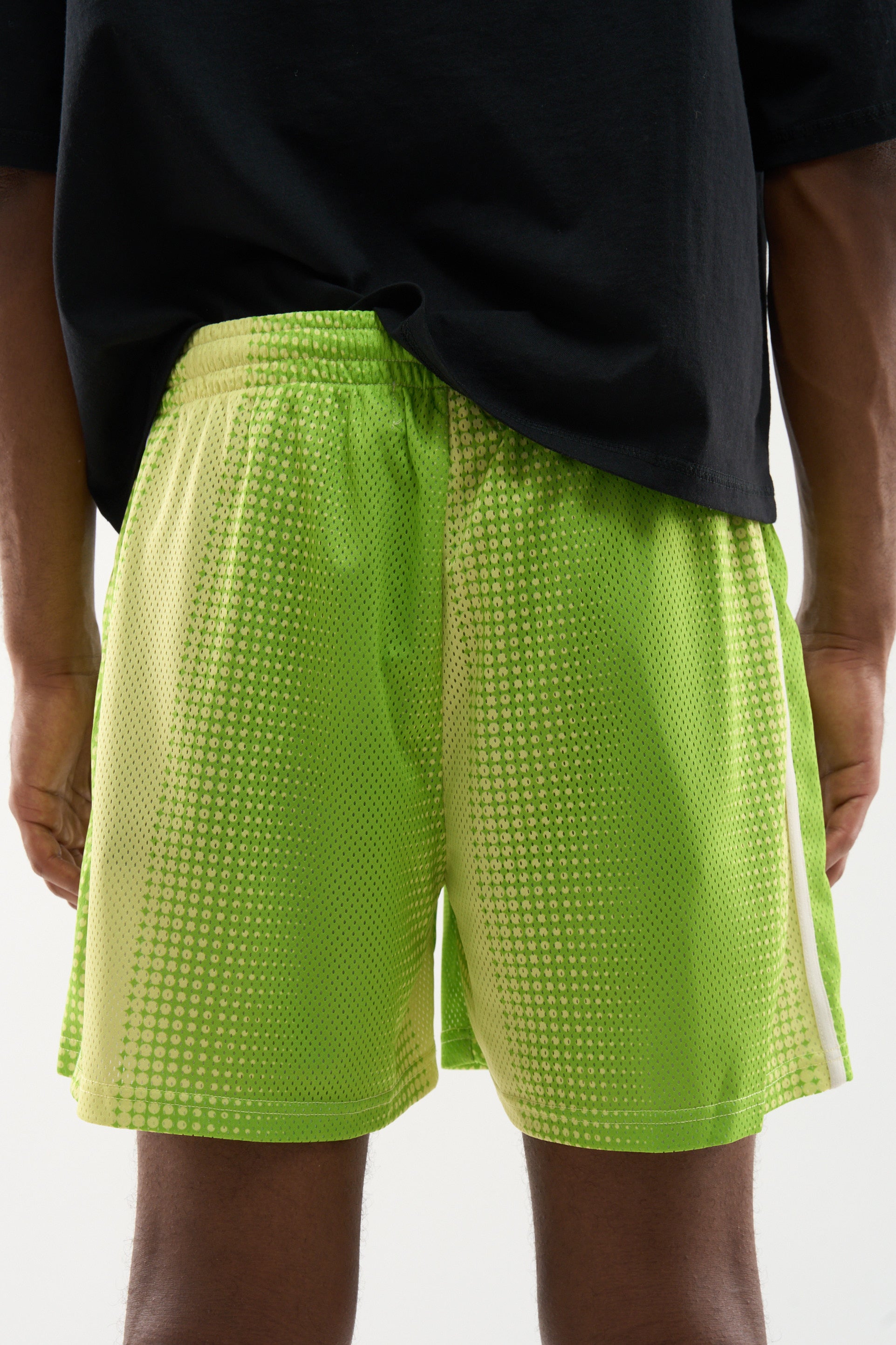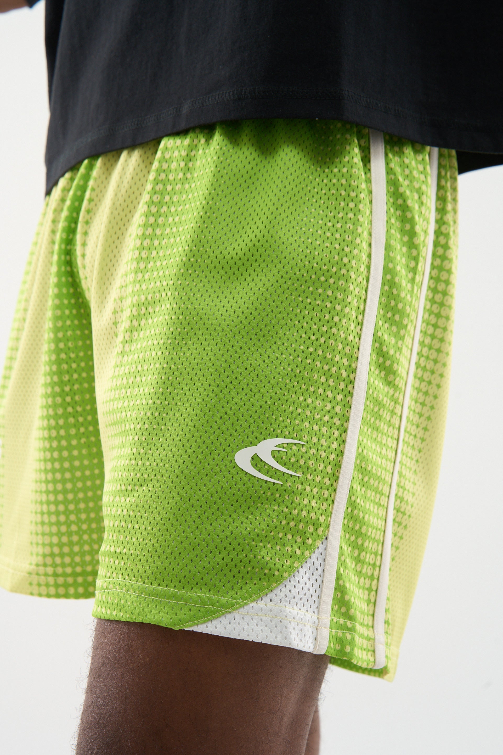 Green Mesh Shorts made from lightweight polyester with gradient dot pattern and contrast white side stripes. Mid-thigh length with elastic waistband and inner drawstring. Features dual logos on front hem.