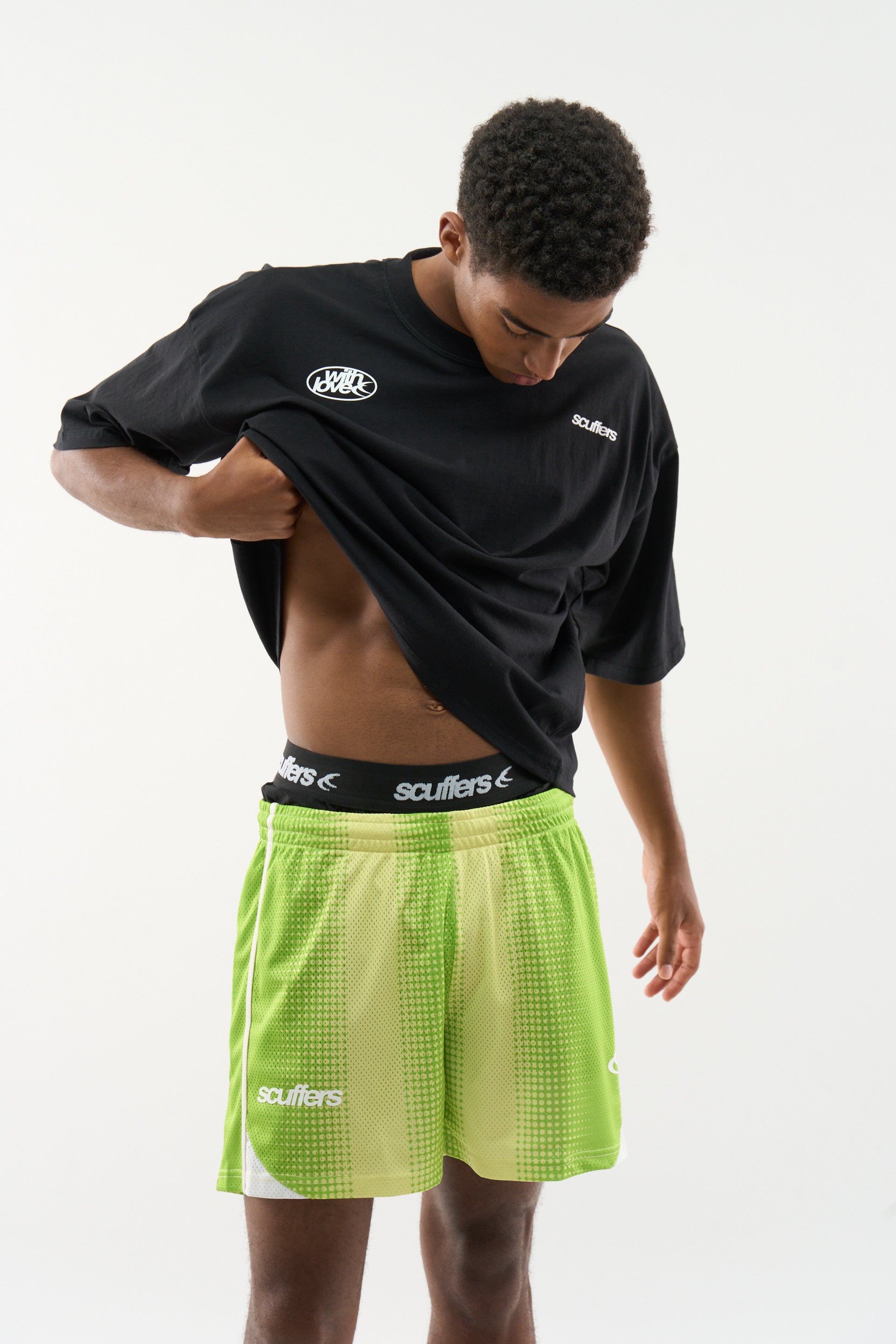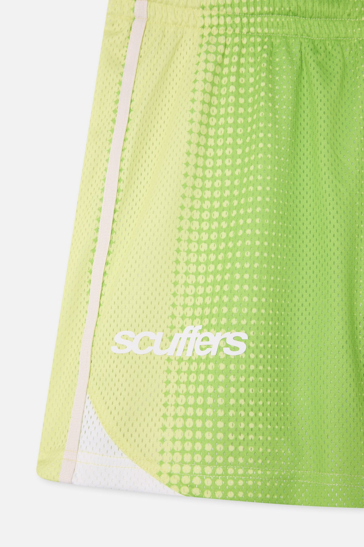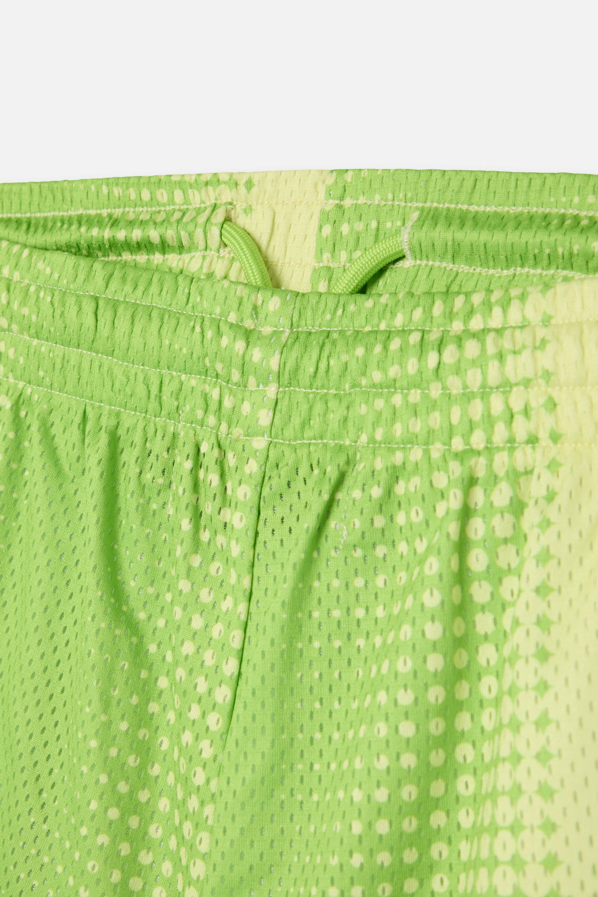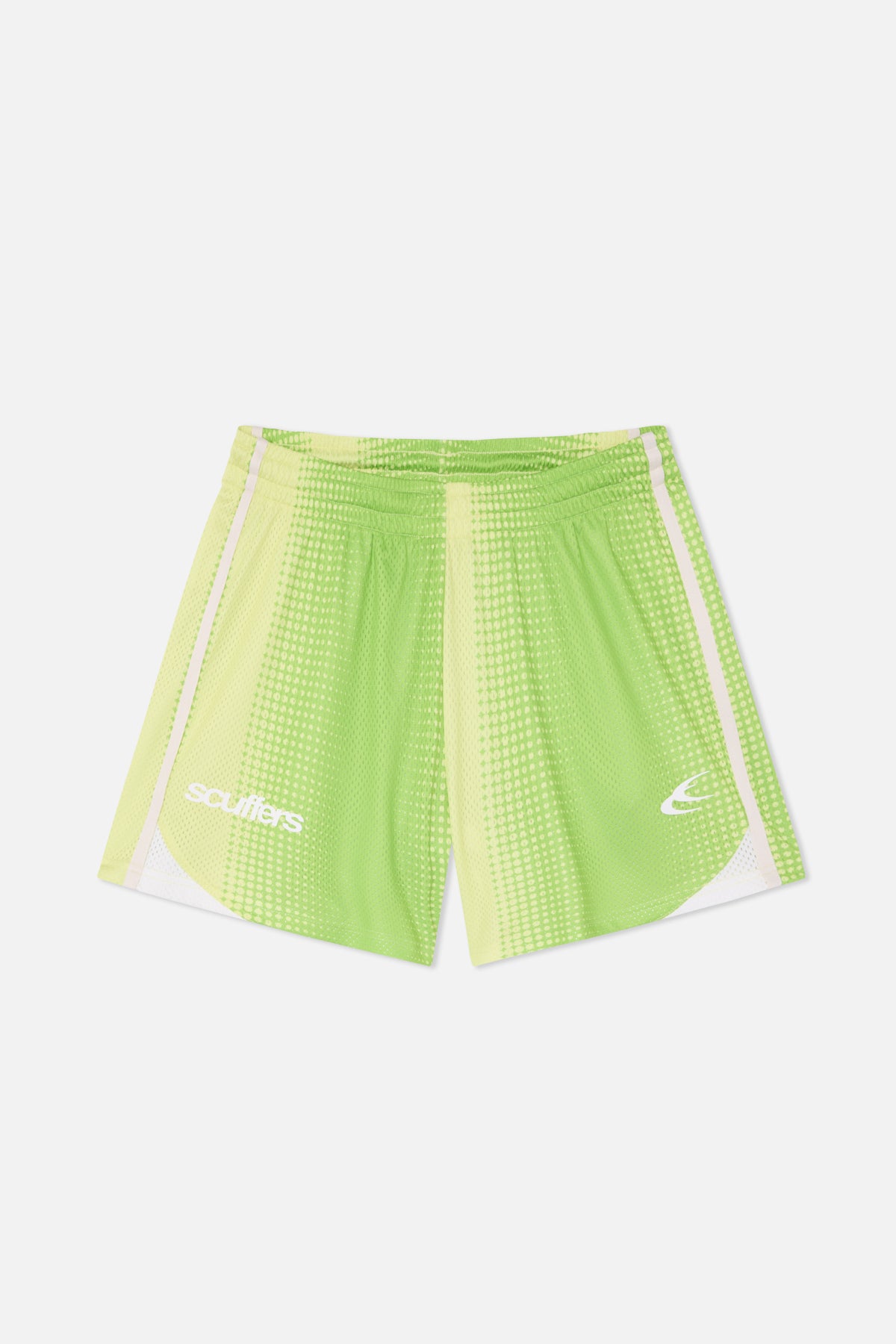 Green Mesh Shorts made from lightweight polyester with gradient dot pattern and contrast white side stripes. Mid-thigh length with elastic waistband and inner drawstring. Features dual logos on front hem.