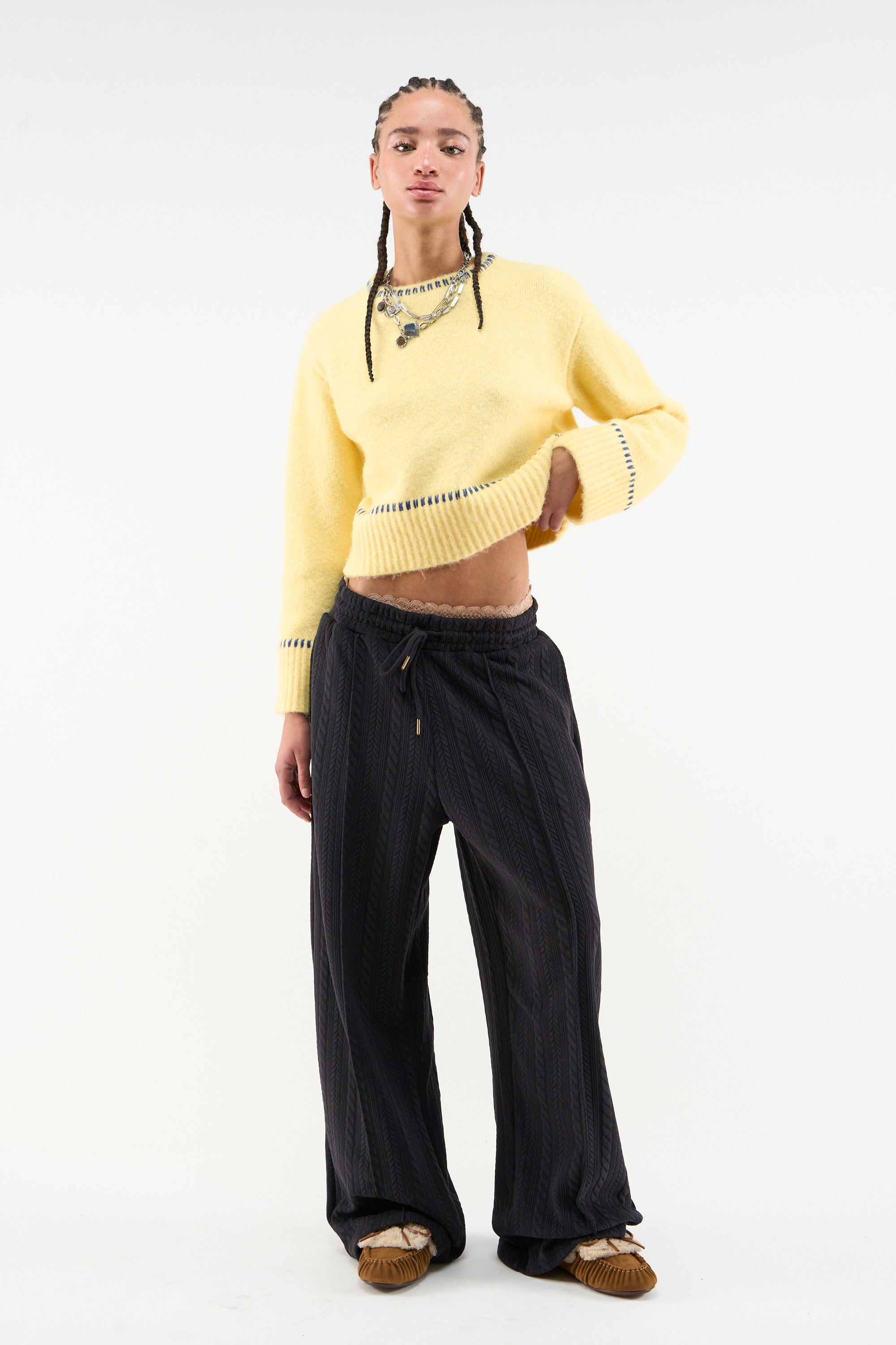 Yellow Sweater made from a brushed wool blend with a soft, textured finish. Features a relaxed fit, contrast blue stitch detailing at the collar, cuffs, and hem. Ribbed trim and Scuffers Studios label patch at back neck.