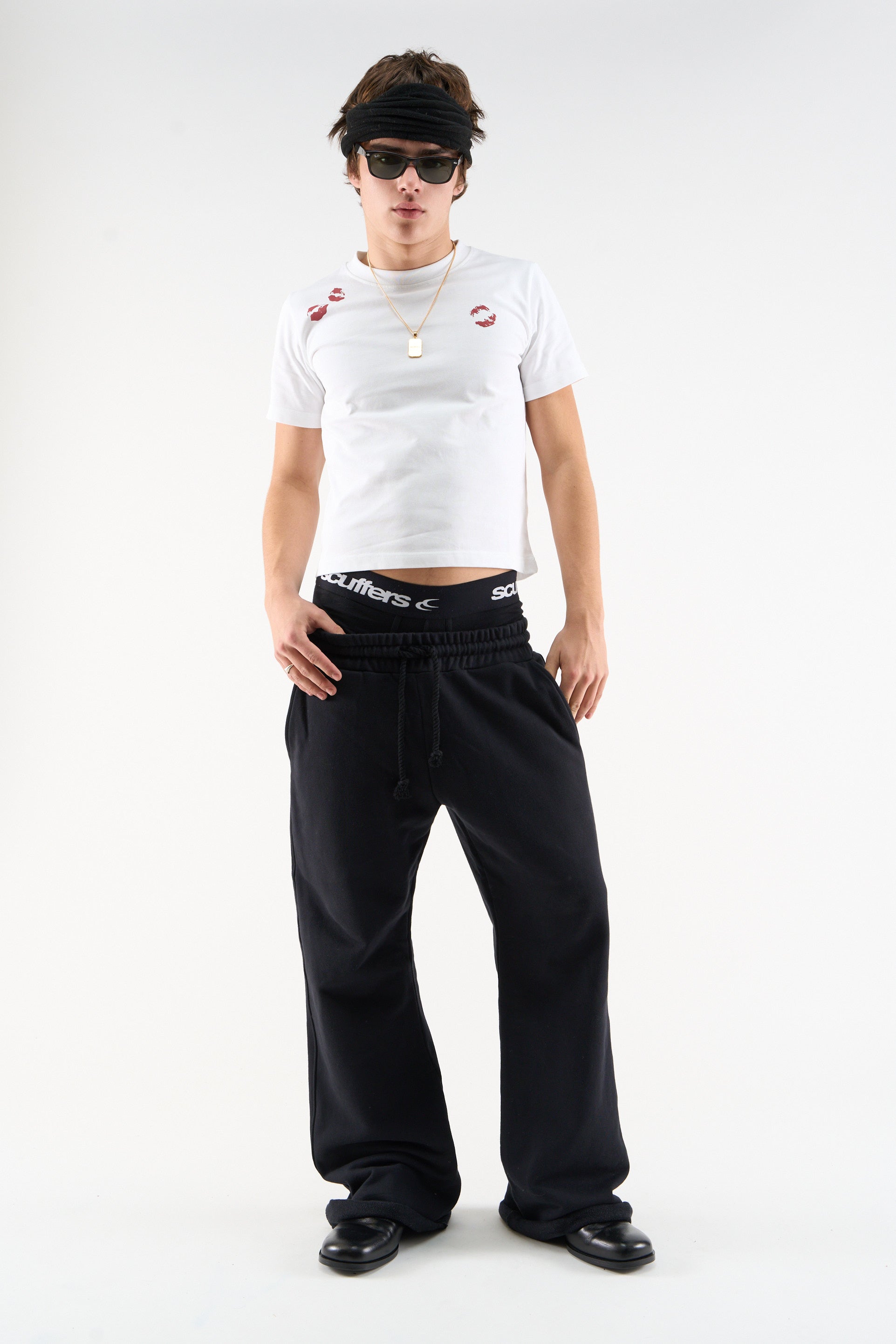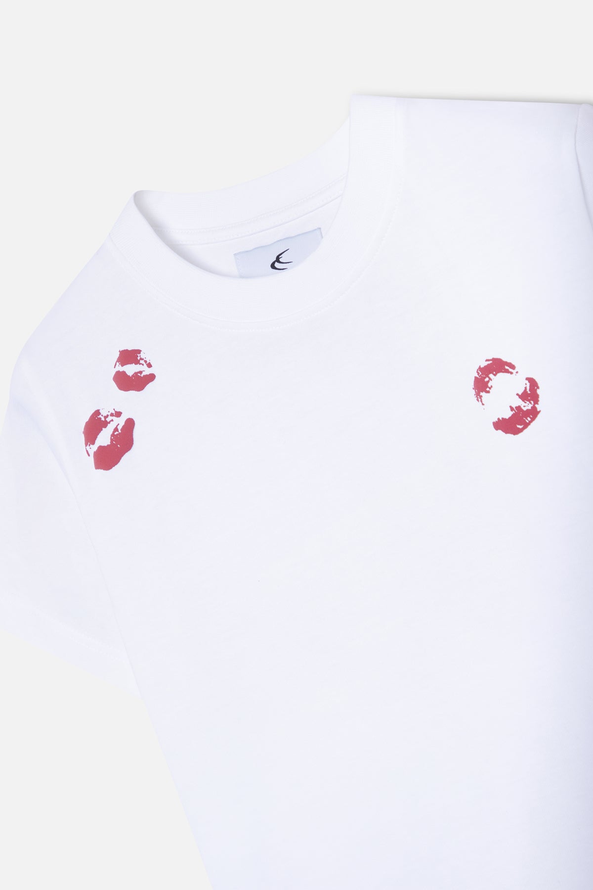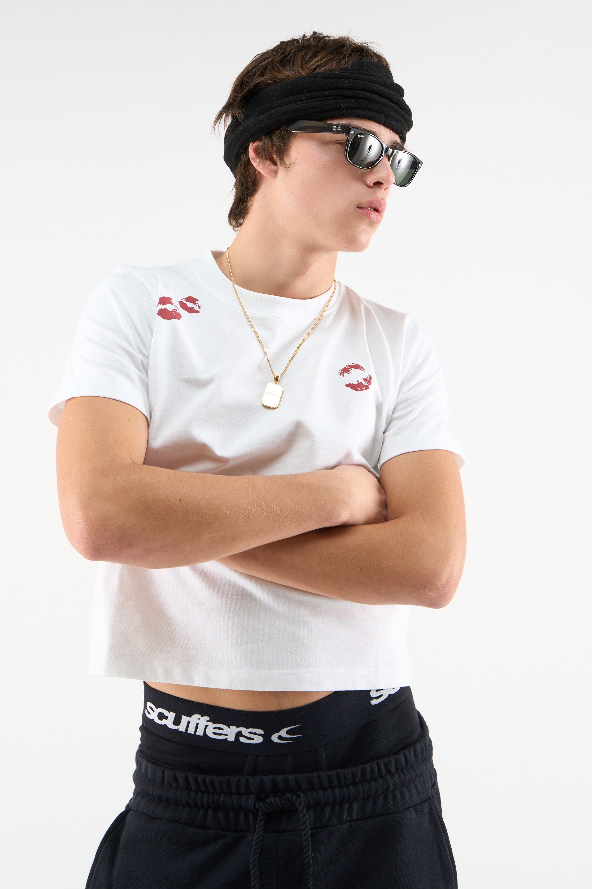 Fitted white cropped T-shirt featuring red kiss-print graphics on the front and a small Scuffers® logo on the back. Made from soft cotton with a classic crewneck and short sleeves.