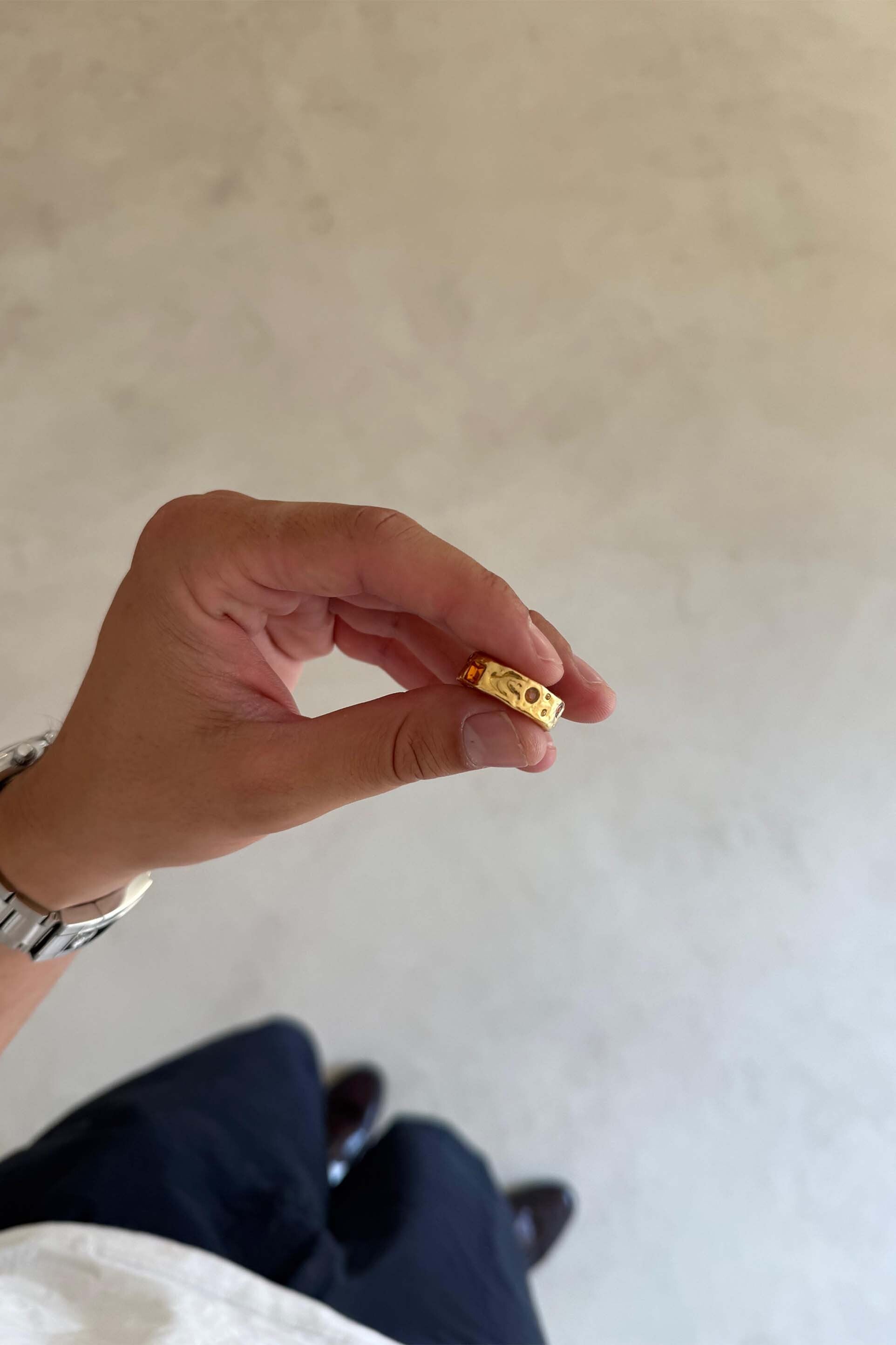 Gold Statement Ring made brass with a polished, irregular band design. Set with mixed-shape orange stones and engraved Scuffers logo on the inner band. Subtle wave motif embossed along the outer edge.