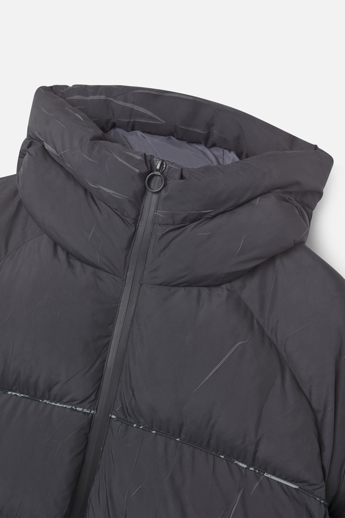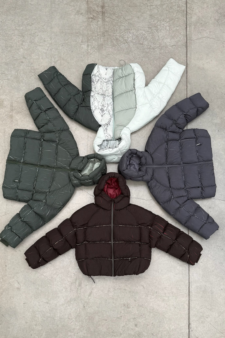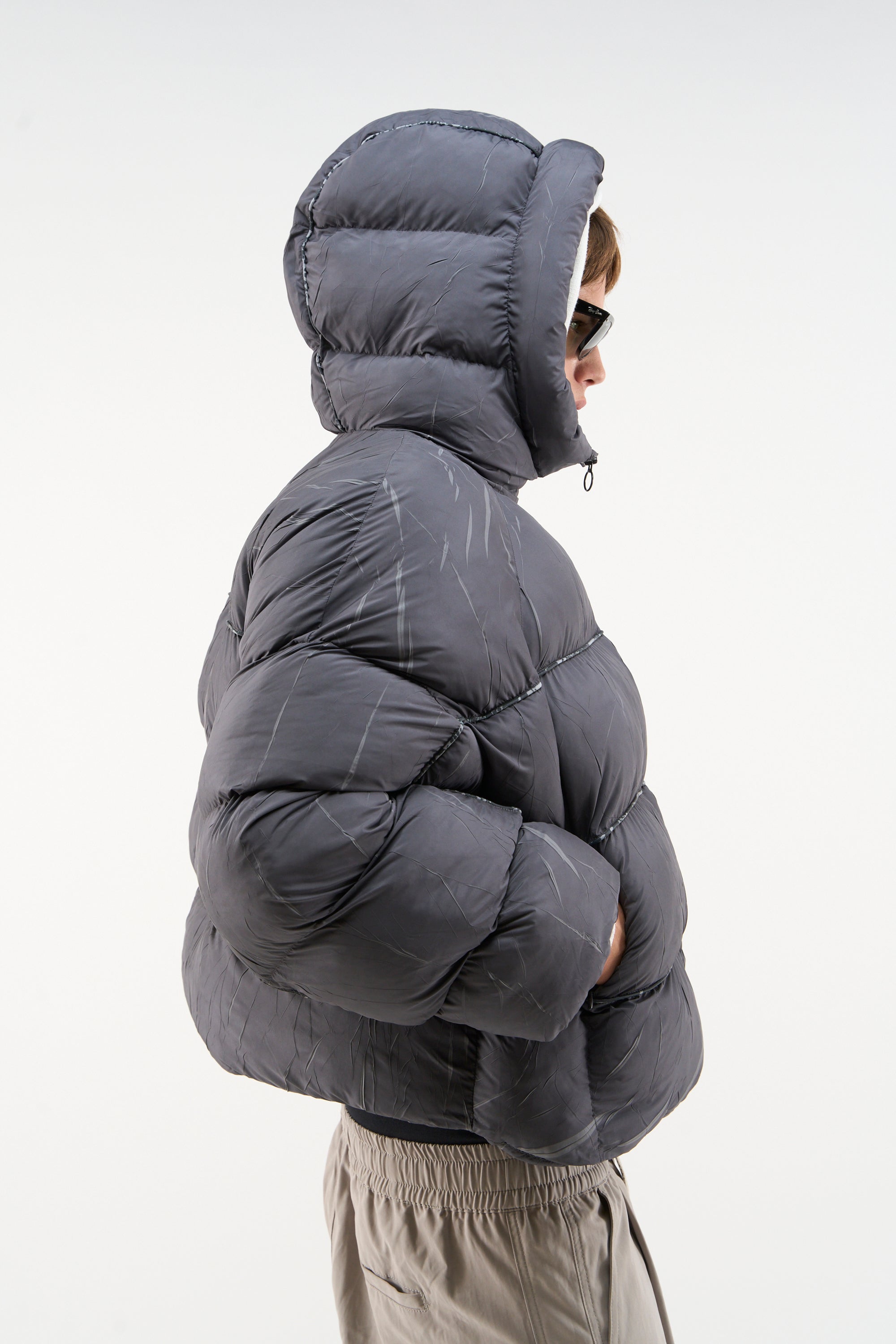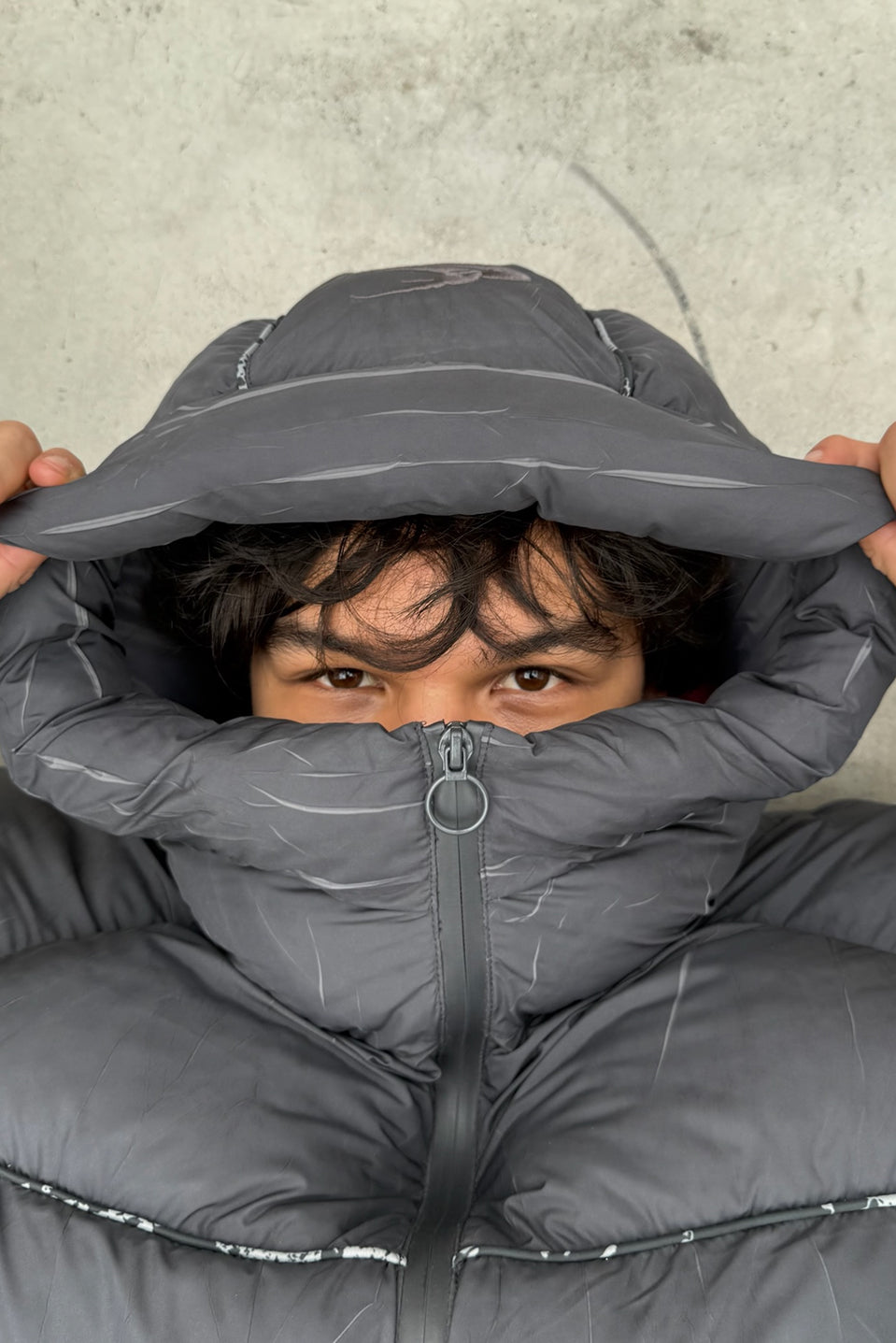 Dark Grey Puffer Jacket with a padded synthetic outer and full lining. Features a zip-up front, two side pockets, and a subtle Scuffers logo tag. The hood is built-in, offering extra warmth and protection. The jacket is designed with a relaxed fit and a modern, boxy silhouette. Distinctive streaked pattern across the fabric adds texture and visual interest.