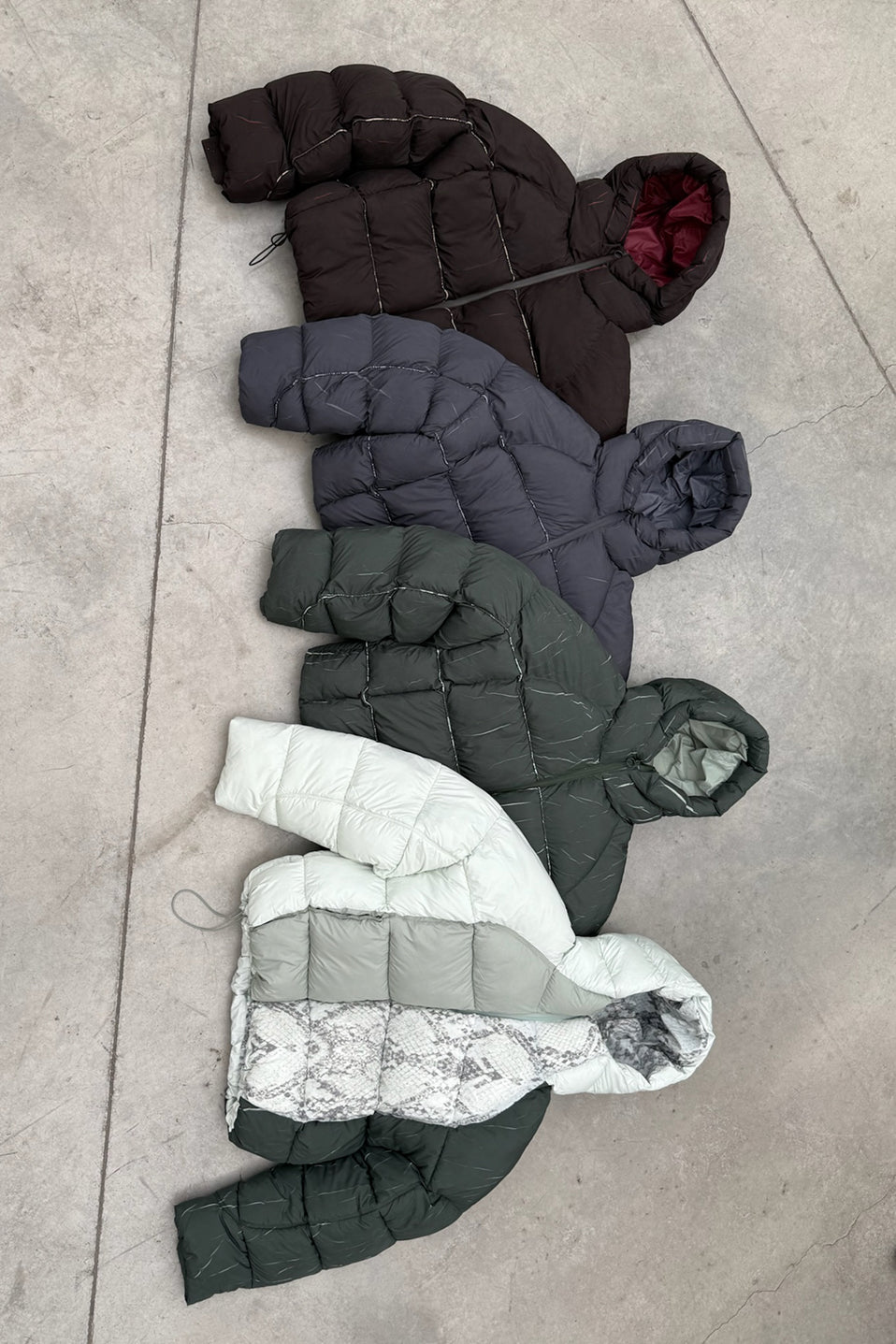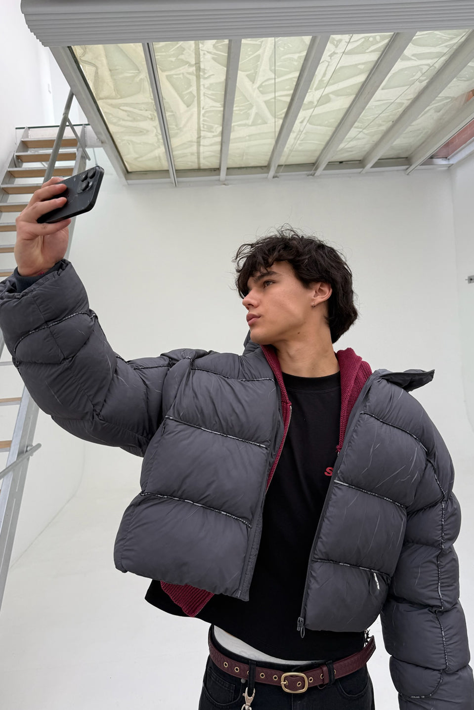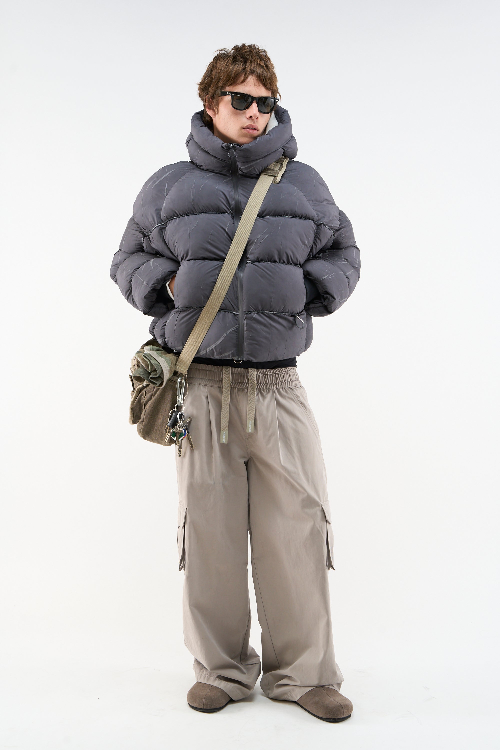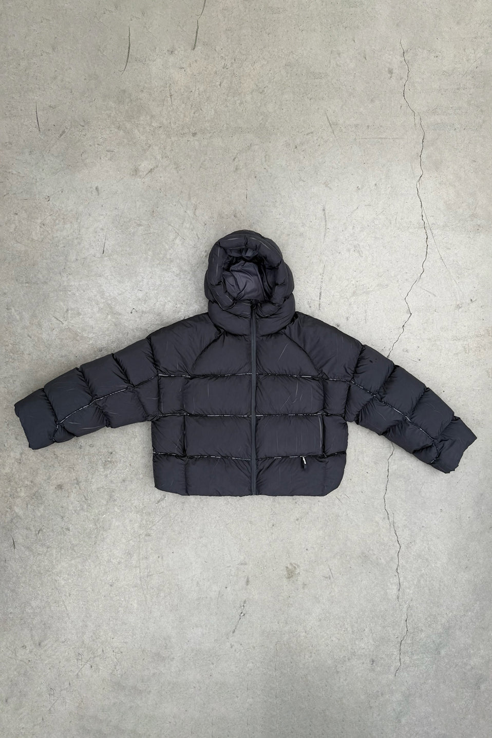 Dark Grey Puffer Jacket with a padded synthetic outer and full lining. Features a zip-up front, two side pockets, and a subtle Scuffers logo tag. The hood is built-in, offering extra warmth and protection. The jacket is designed with a relaxed fit and a modern, boxy silhouette. Distinctive streaked pattern across the fabric adds texture and visual interest.