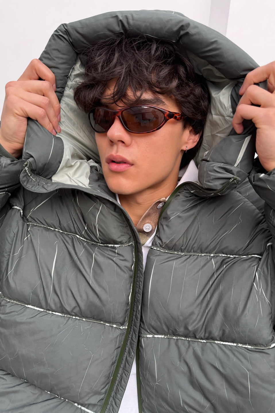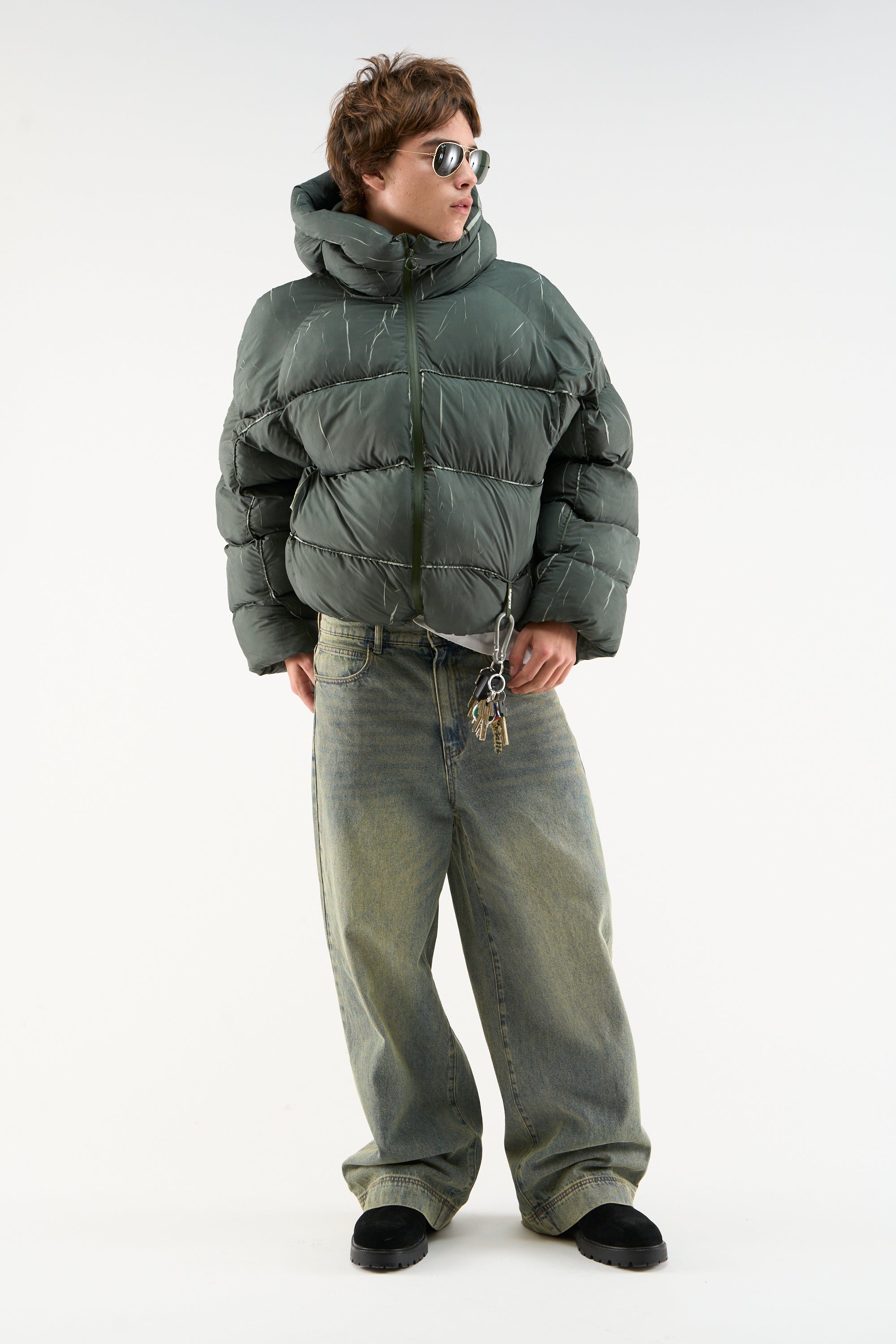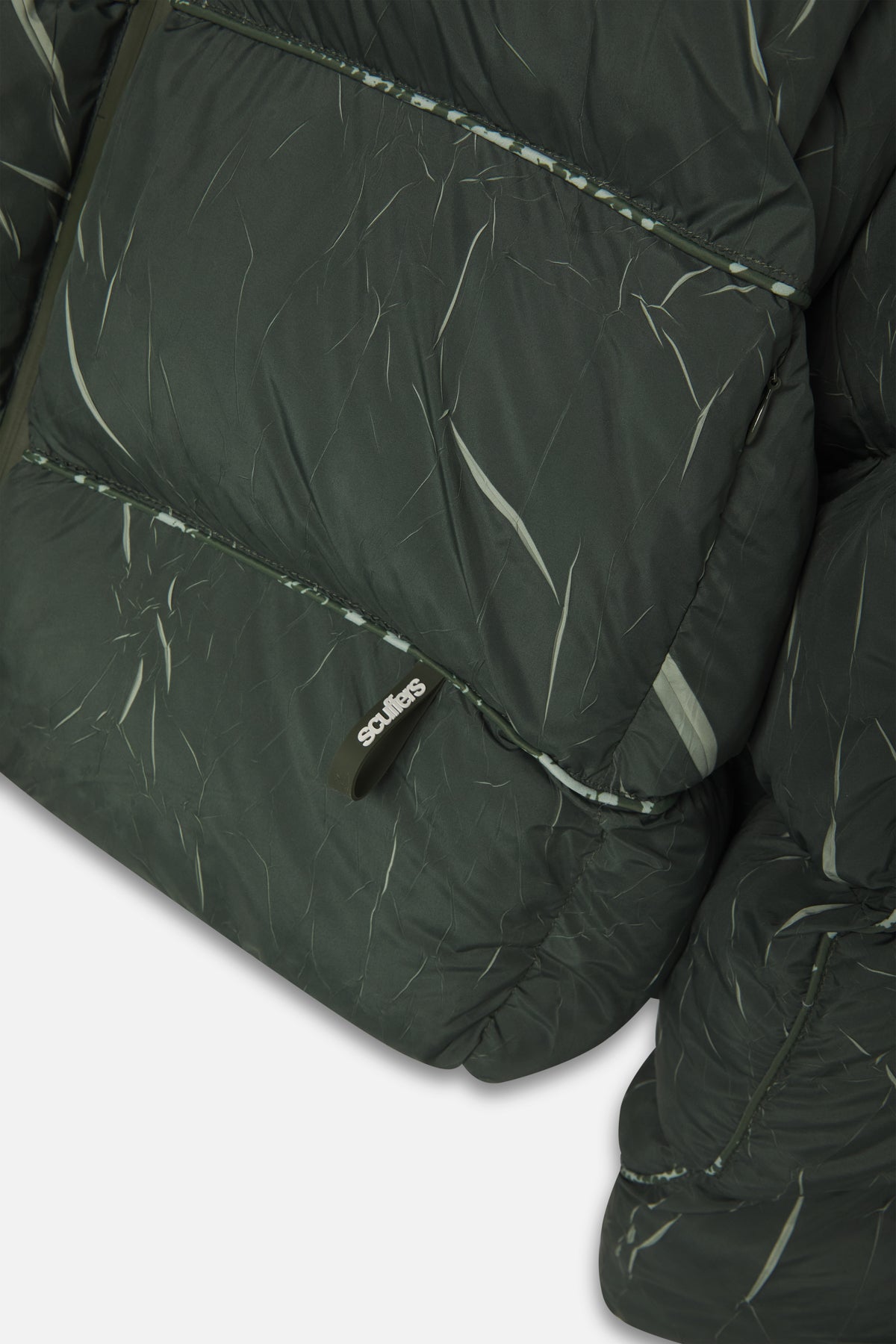 Green Puffer Jacket with a padded synthetic outer and full lining. Features a zip-up front, two side pockets, and a subtle Scuffers logo tag. The hood is built-in, offering extra warmth and protection. The jacket is designed with a relaxed fit and a modern, boxy silhouette. Distinctive streaked pattern across the fabric adds texture and visual interest.