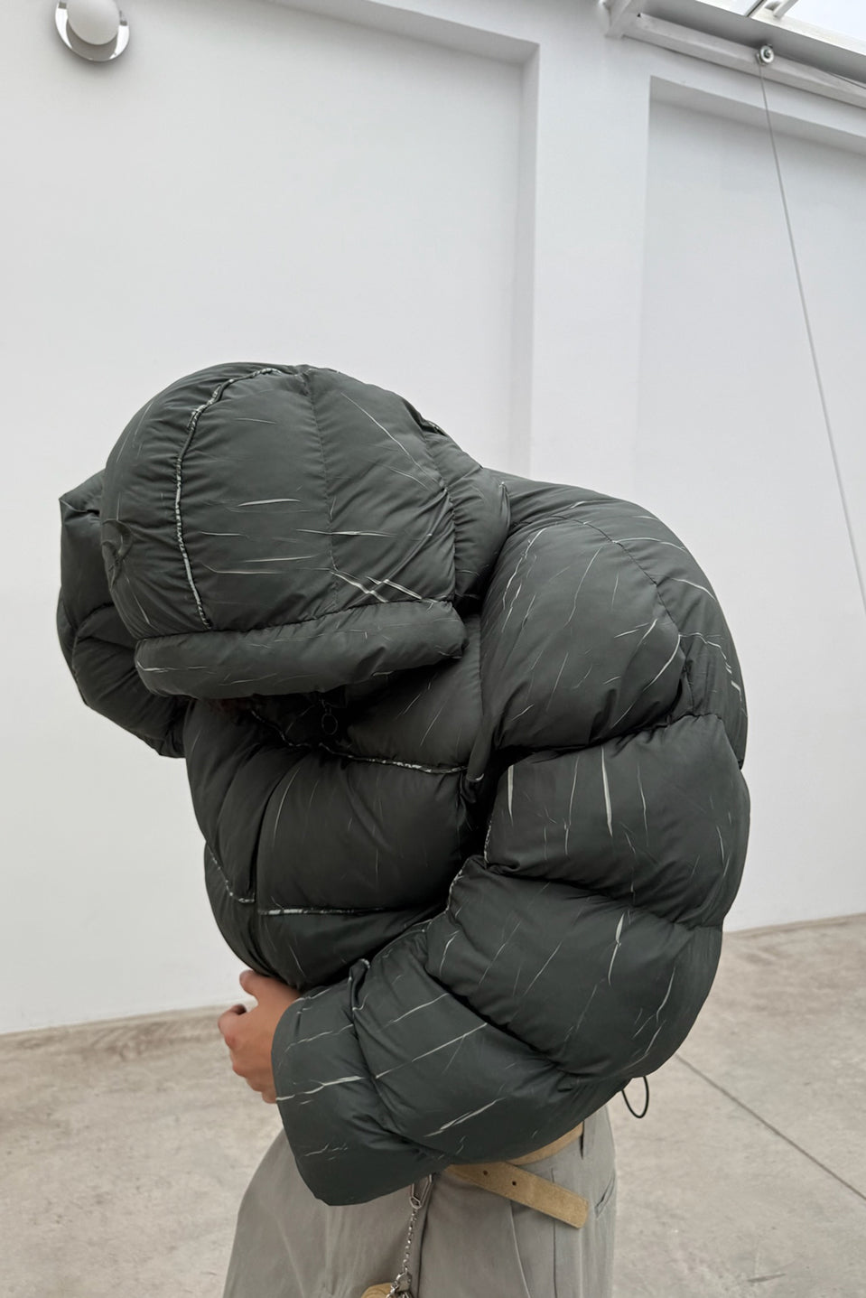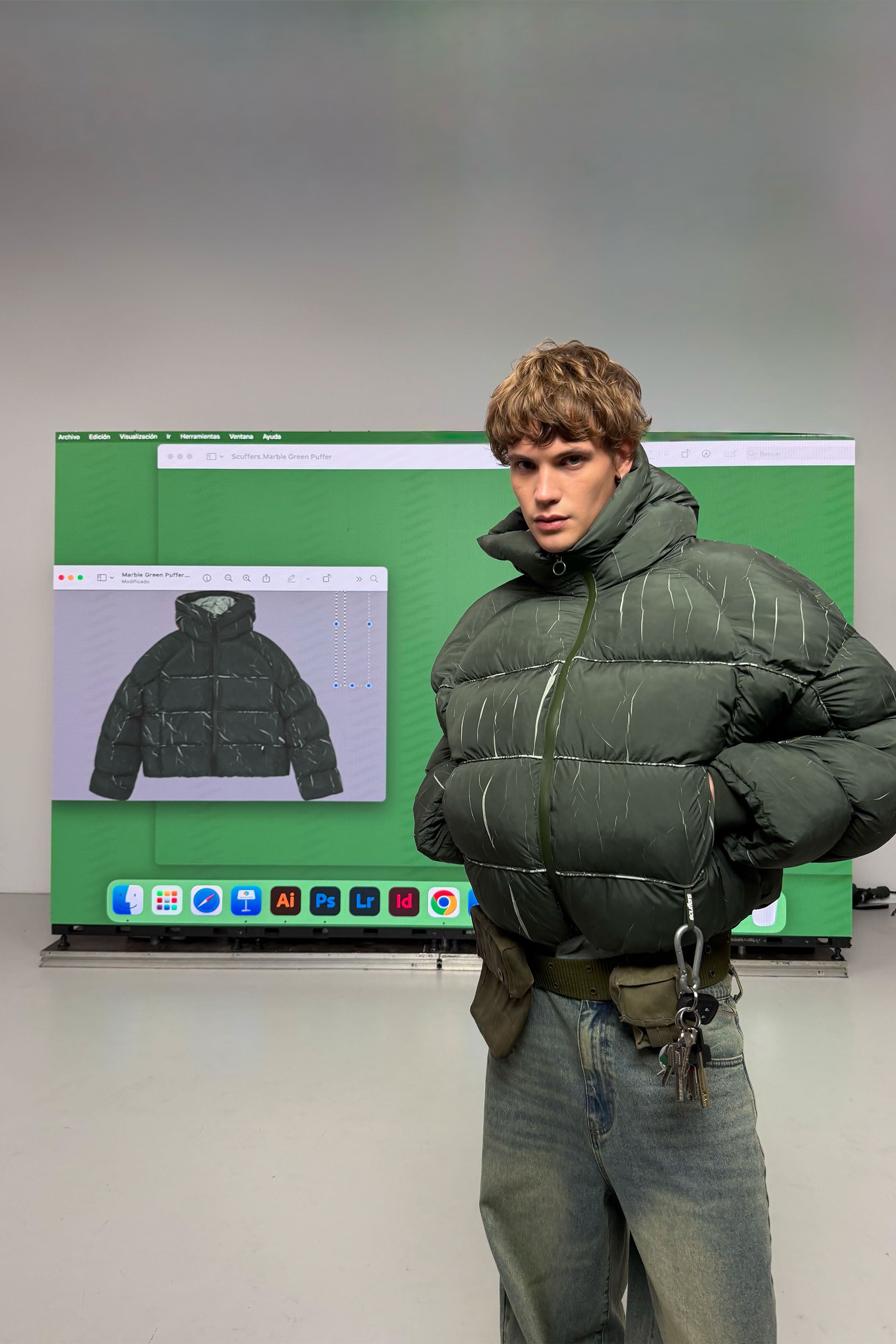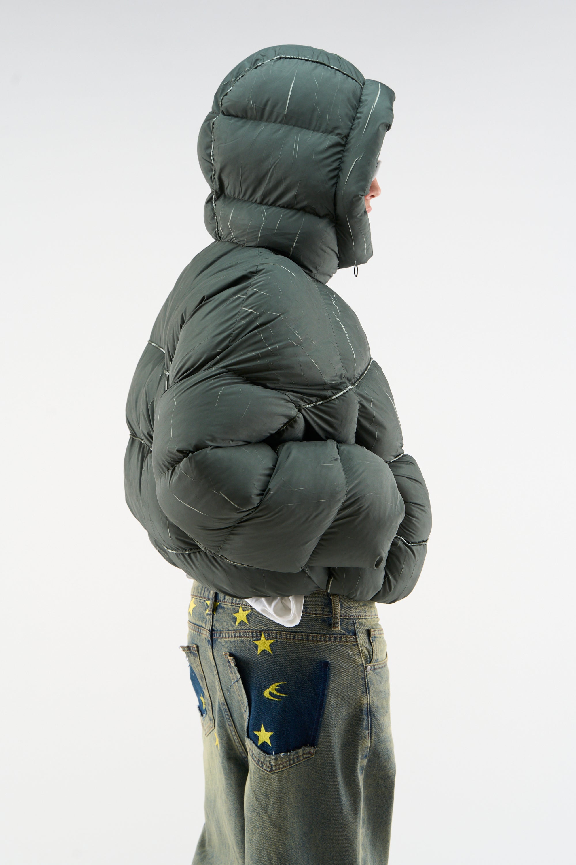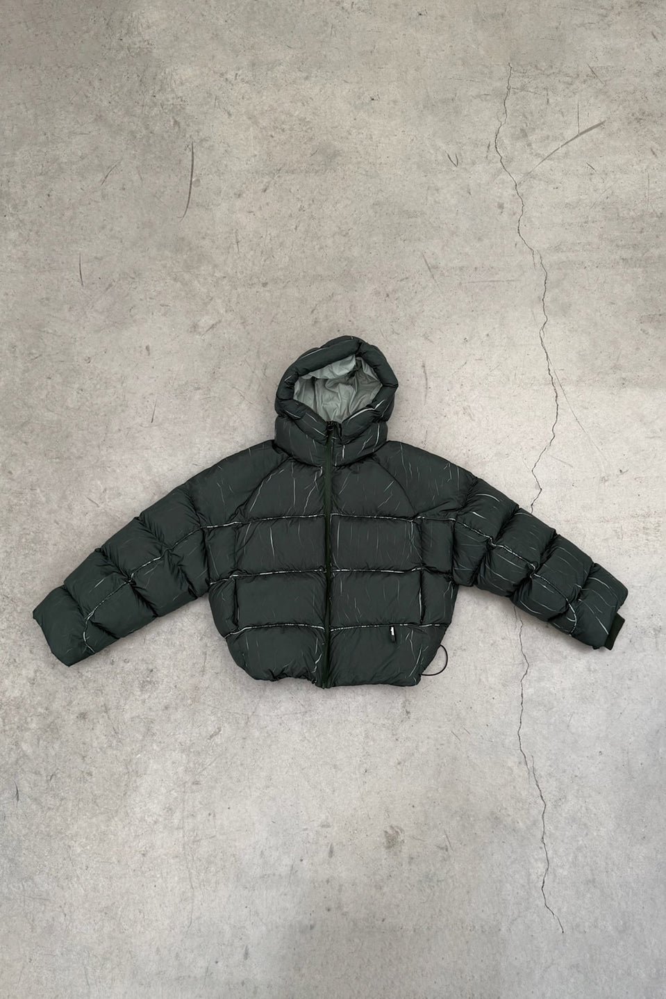 Green Puffer Jacket with a padded synthetic outer and full lining. Features a zip-up front, two side pockets, and a subtle Scuffers logo tag. The hood is built-in, offering extra warmth and protection. The jacket is designed with a relaxed fit and a modern, boxy silhouette. Distinctive streaked pattern across the fabric adds texture and visual interest.