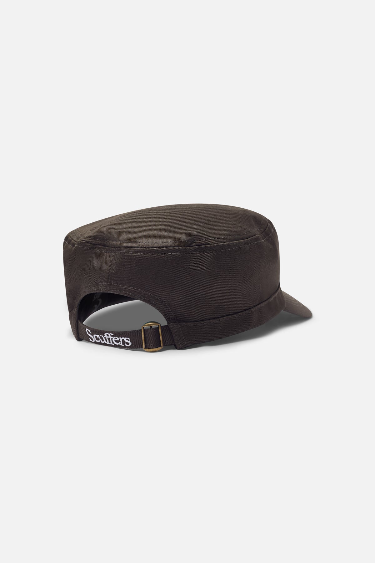 Dark military-style cap in structured cotton twill with a curved brim and flat crown. Front finished with silver-tone crescent and star hardware. Adjustable back strap with metal buckle and Scuffers embroidery.