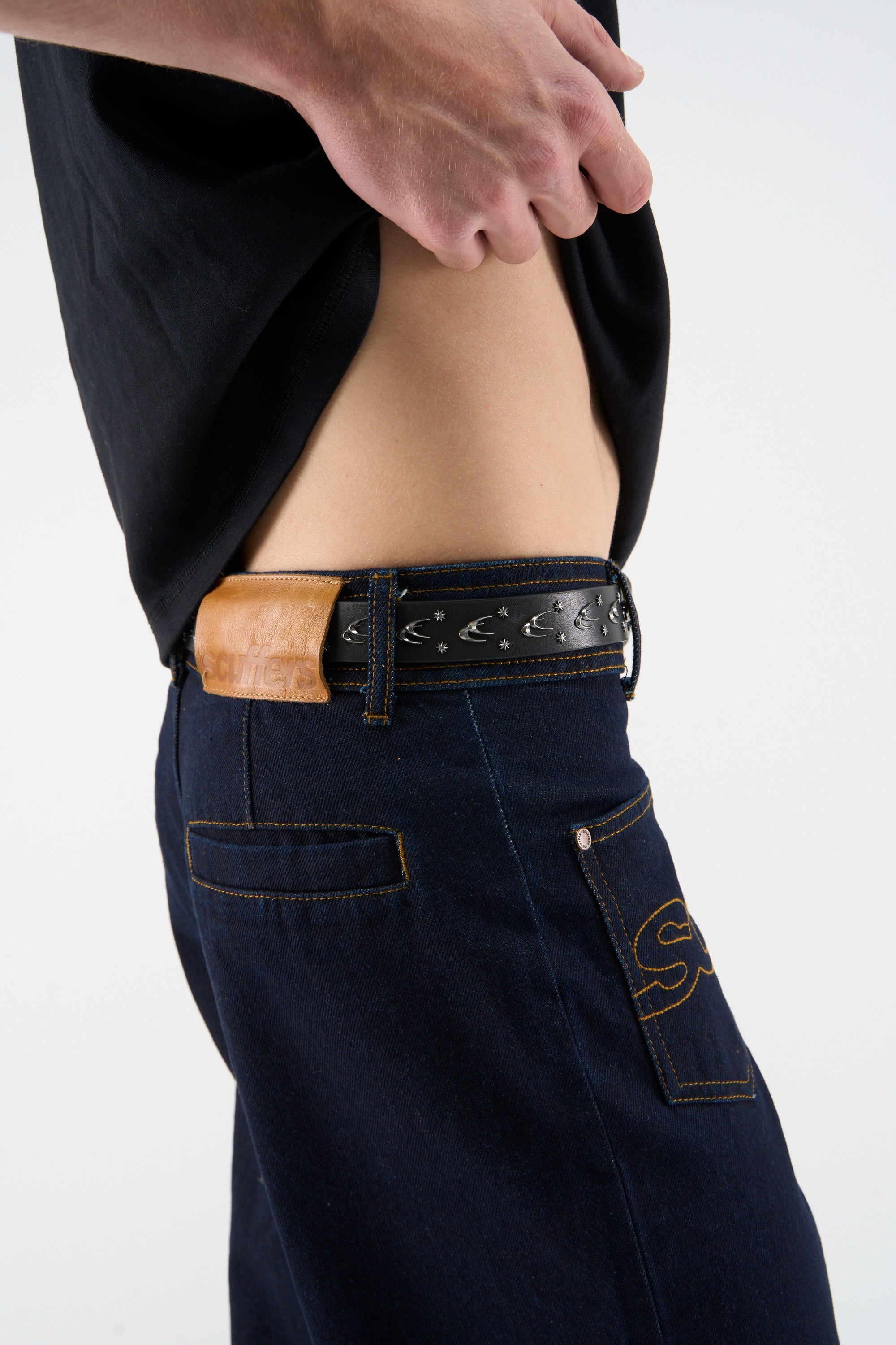 Black leather-look belt with a smooth finish and gunmetal buckle. Crescent and star metal detailing along the strap, with punched adjustment holes and a pointed tip.