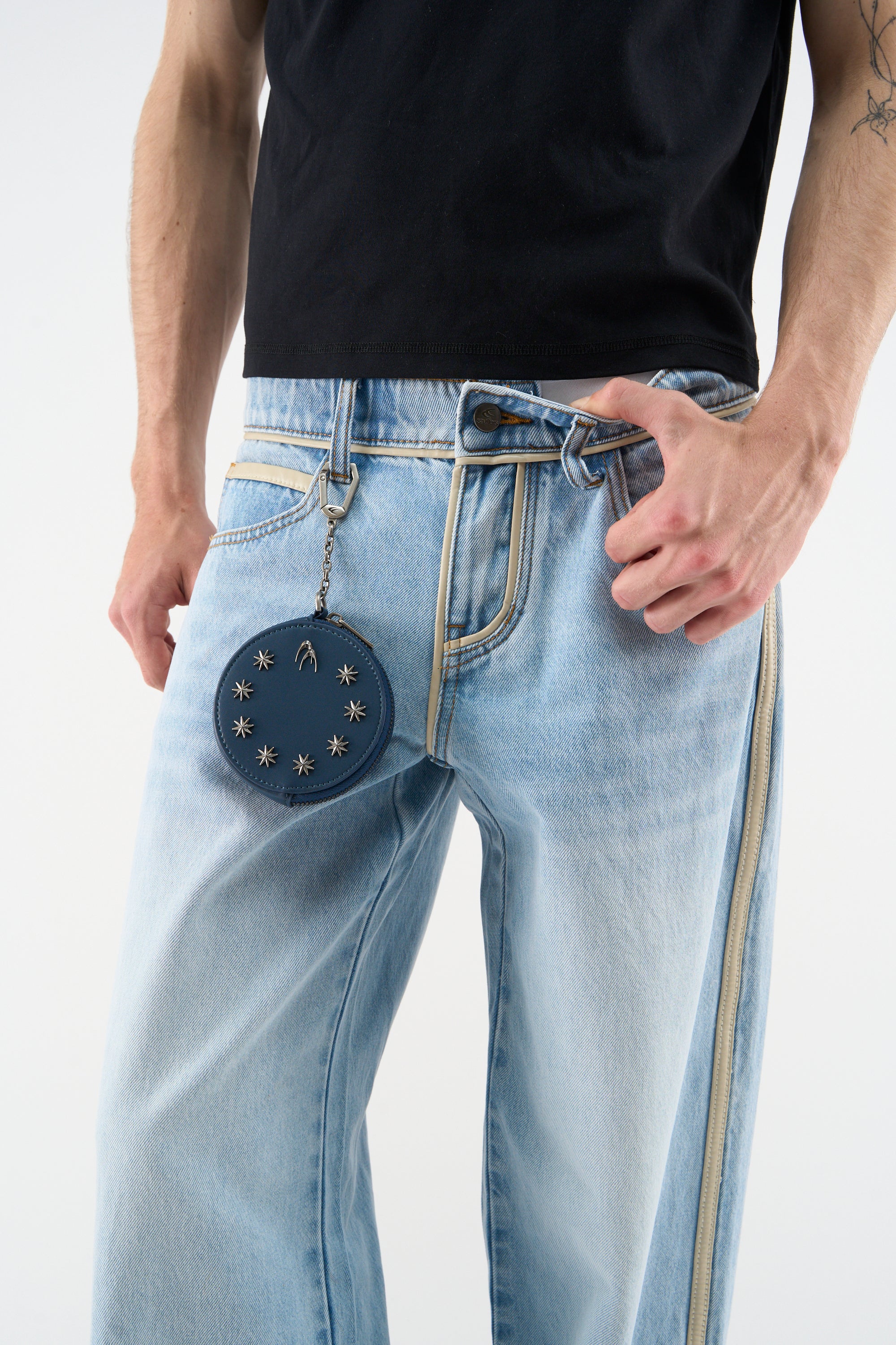 Blue round coin pouch in smooth faux leather with a full zip-around closure. Front finished with silver-tone star studs and Scuffers crescent hardware; clean back. Attached metal chain with carabiner clip for keys or belt loops.