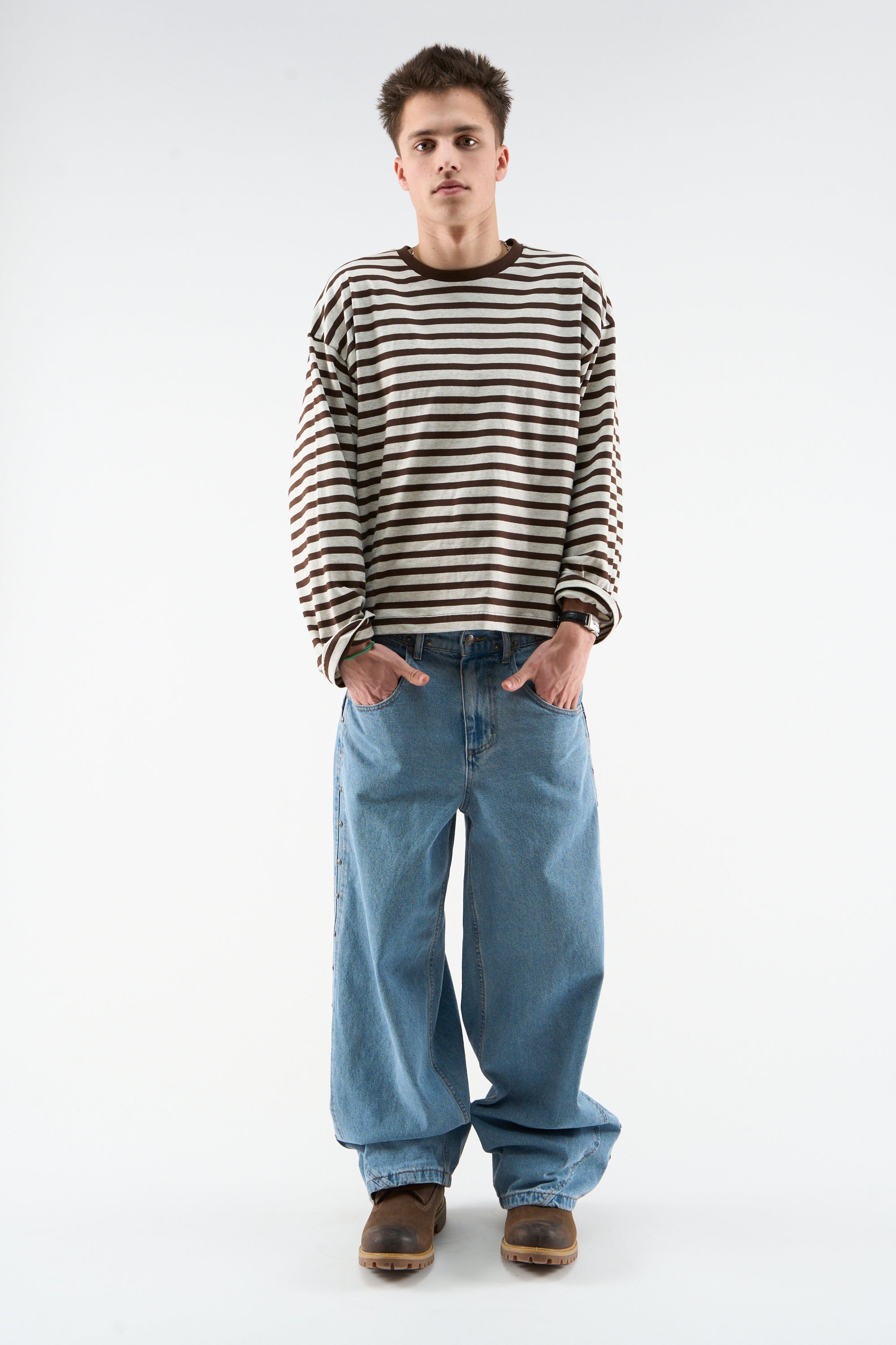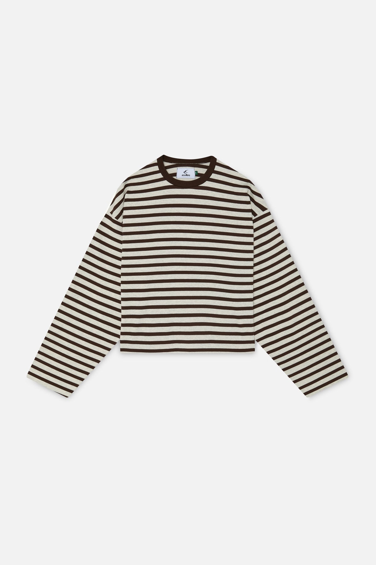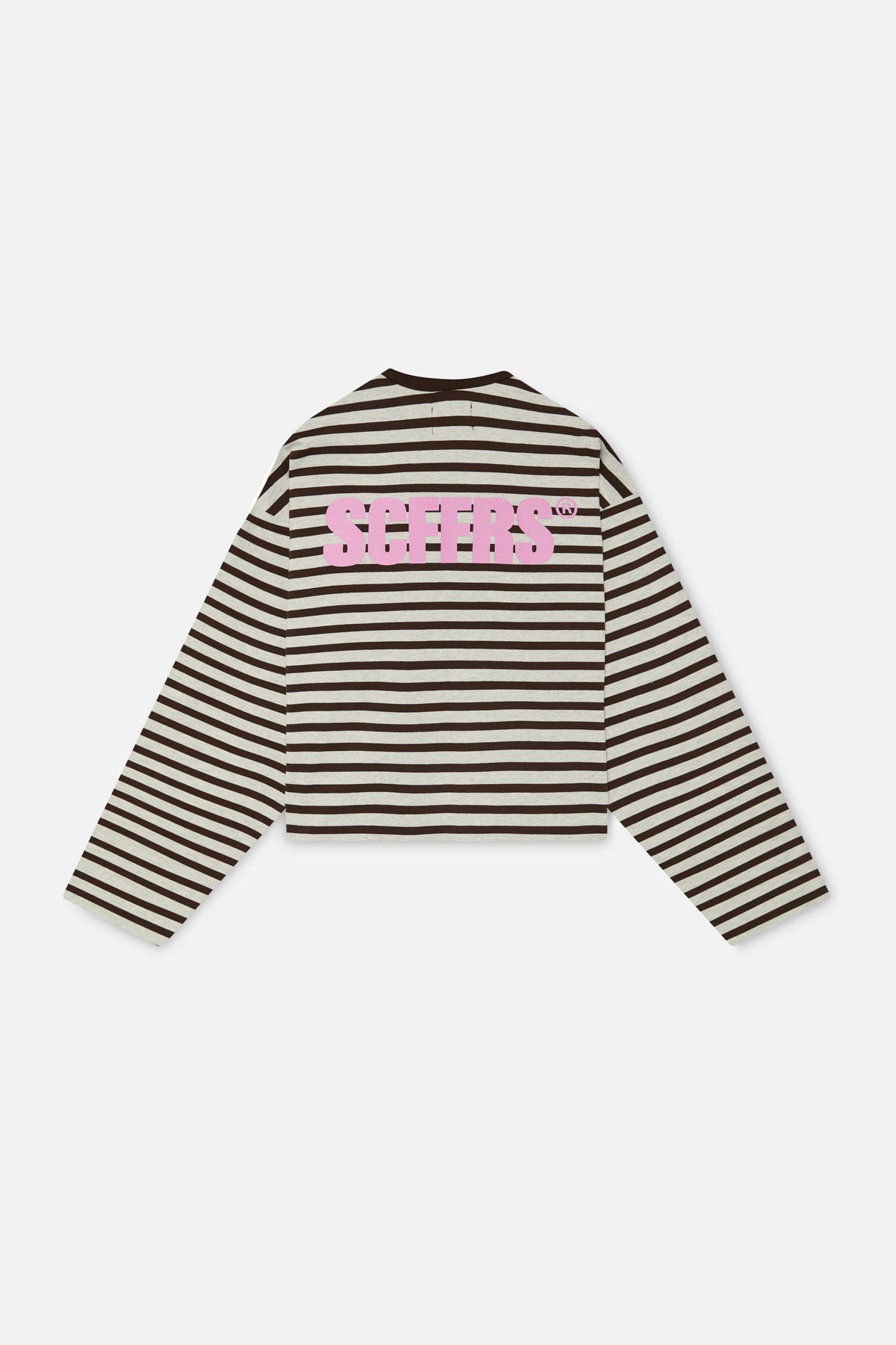 Brown striped long sleeve t-shirt in an oversized fit. Ribbed crewneck collar and dropped shoulders. Bold SCFFRS® logo printed on the back in pink.