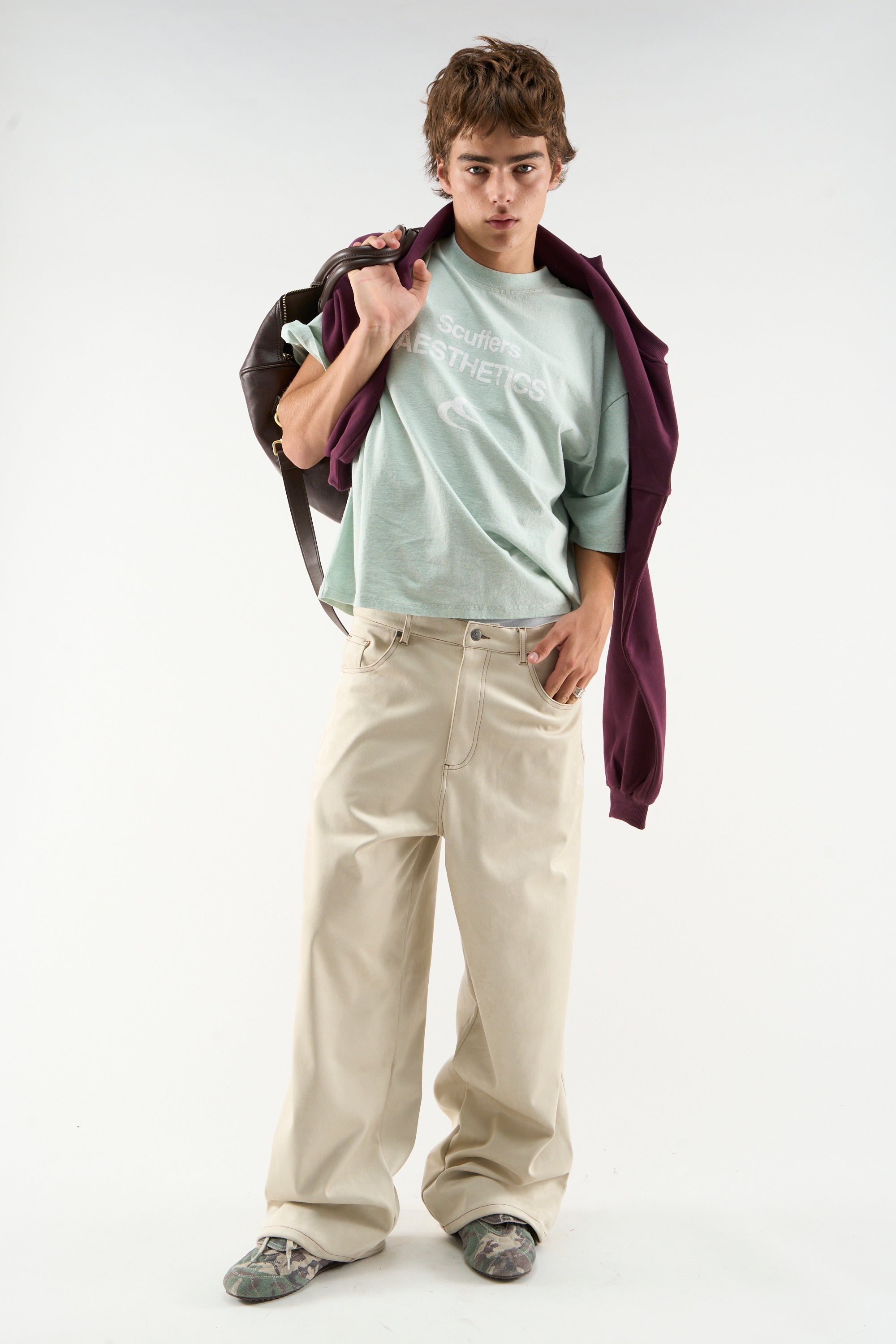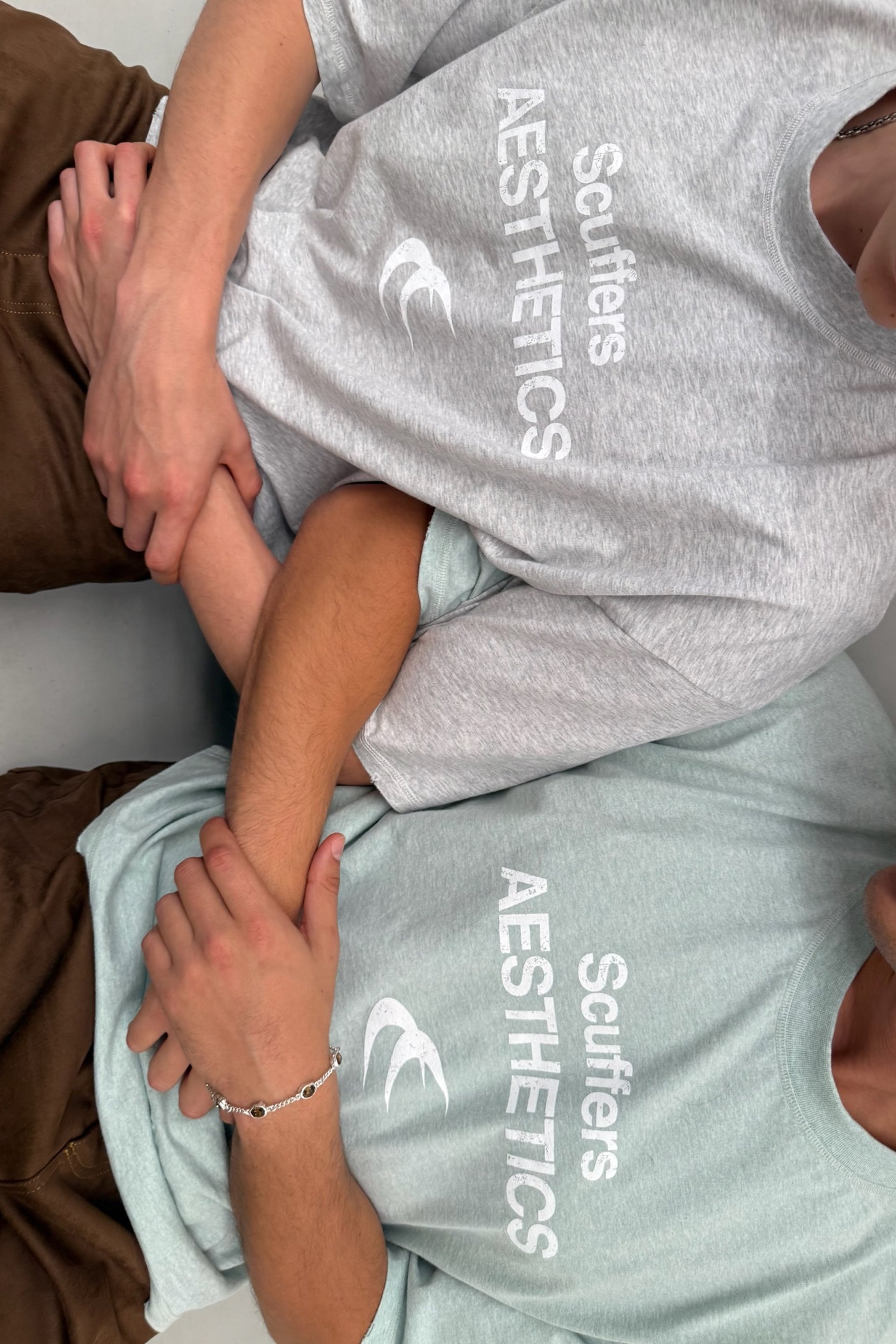 Nobrand Light Green T-Shirt made from soft cotton fabric, featuring bold "Scuffers AESTHETICS" text on the front in contrasting white. The relaxed fit and minimalistic design make it a versatile piece, perfect for casual wear. A classic style with a modern touch.