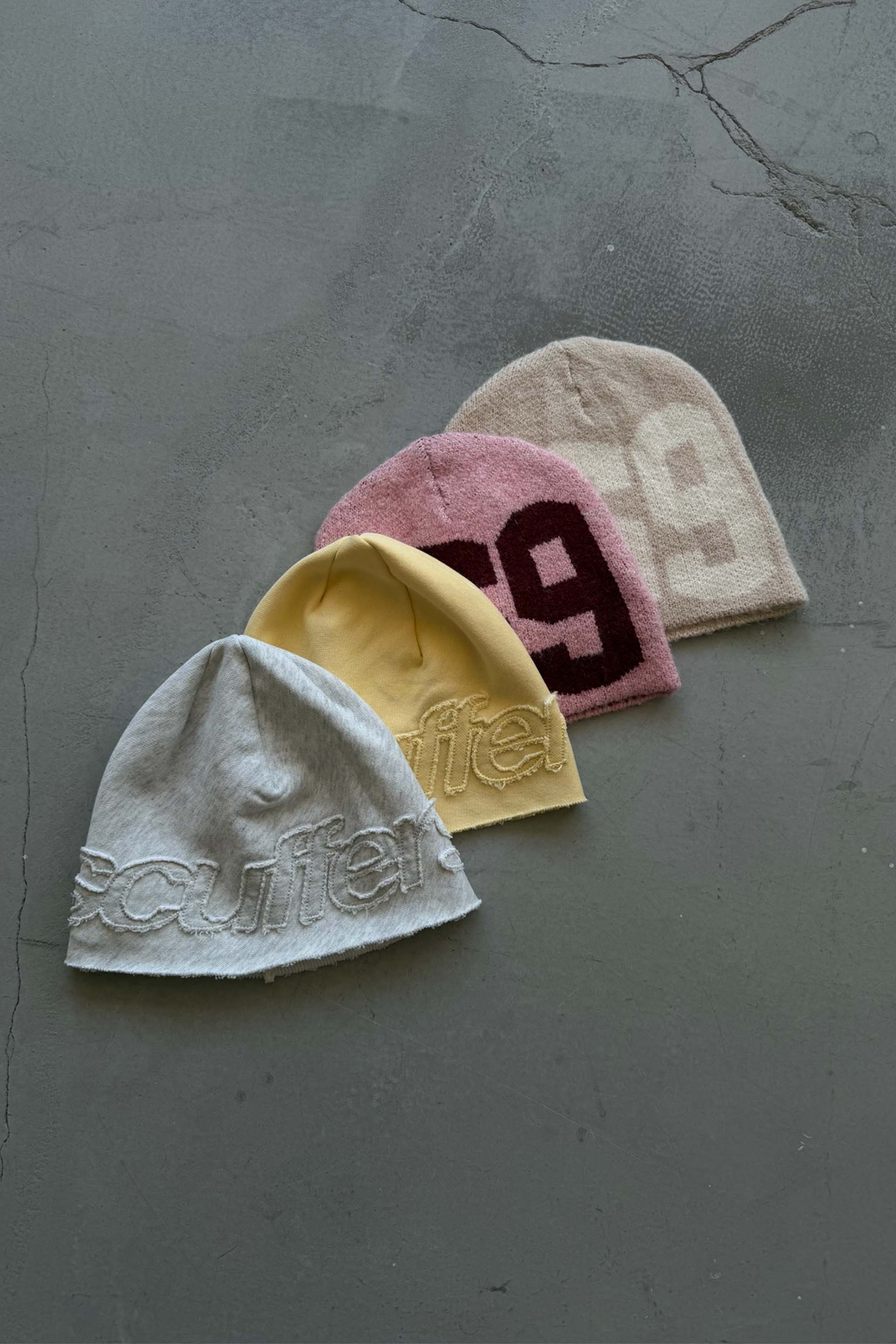 Beige Knit Beanie – Soft acrylic blend with contrast intarsia “69” graphic on front. Seamless crown with fine rib texture. Lightweight and fitted design.