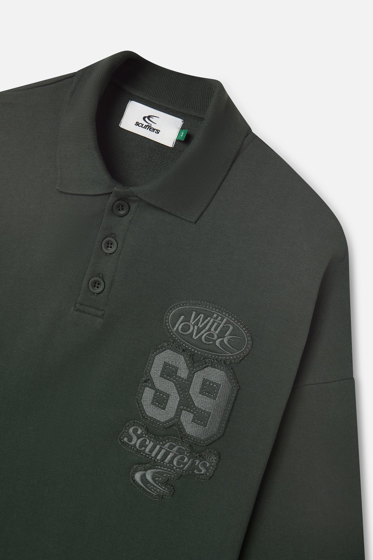 Green Long Sleeve Polo Shirt in cotton piqué with a relaxed fit. Features a classic collar, three-button placket, and tonal varsity-style embroidery on the chest including "S9", "Scuffers", and "with love" motifs. Straight hem and set-in sleeves.