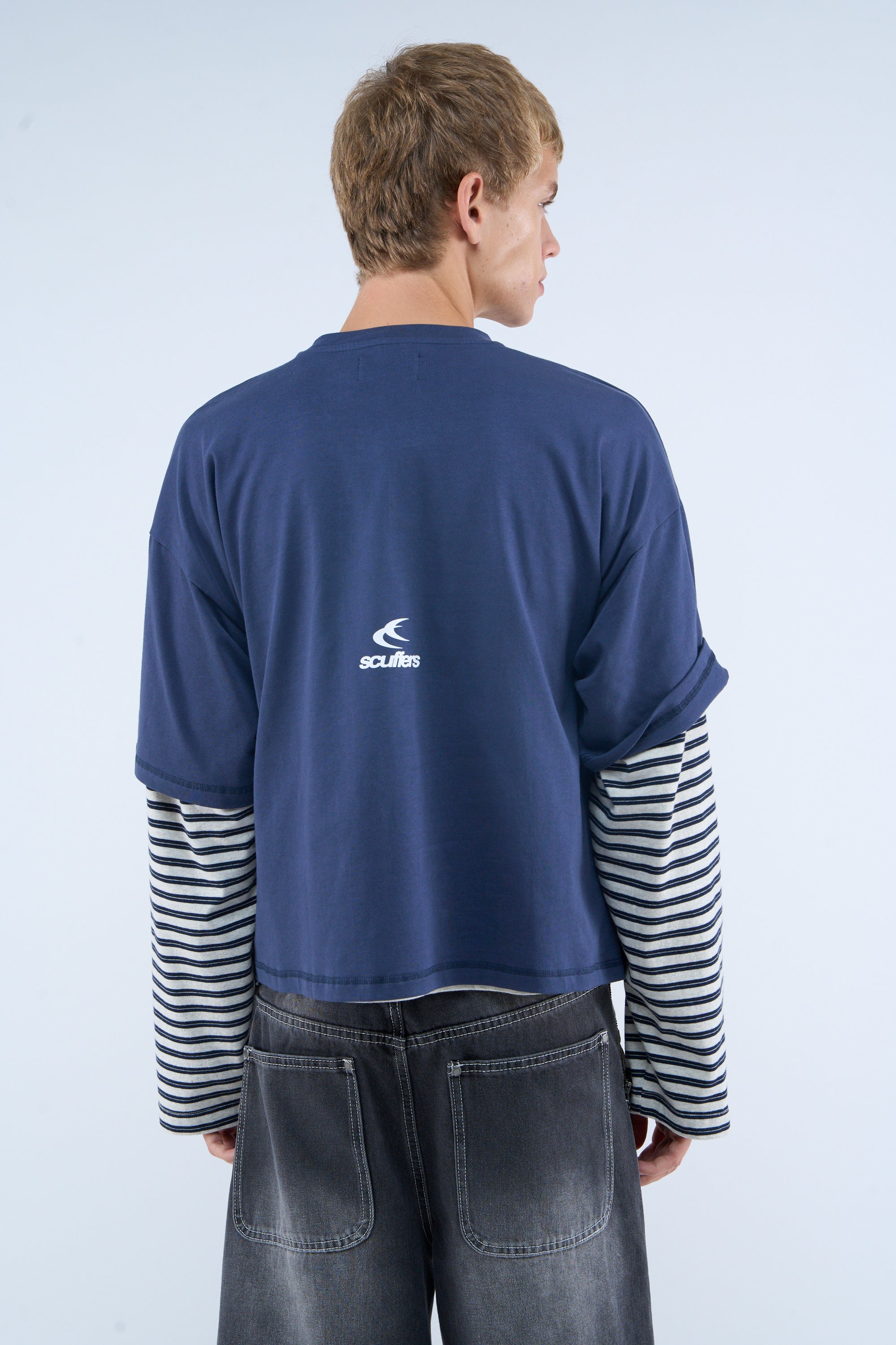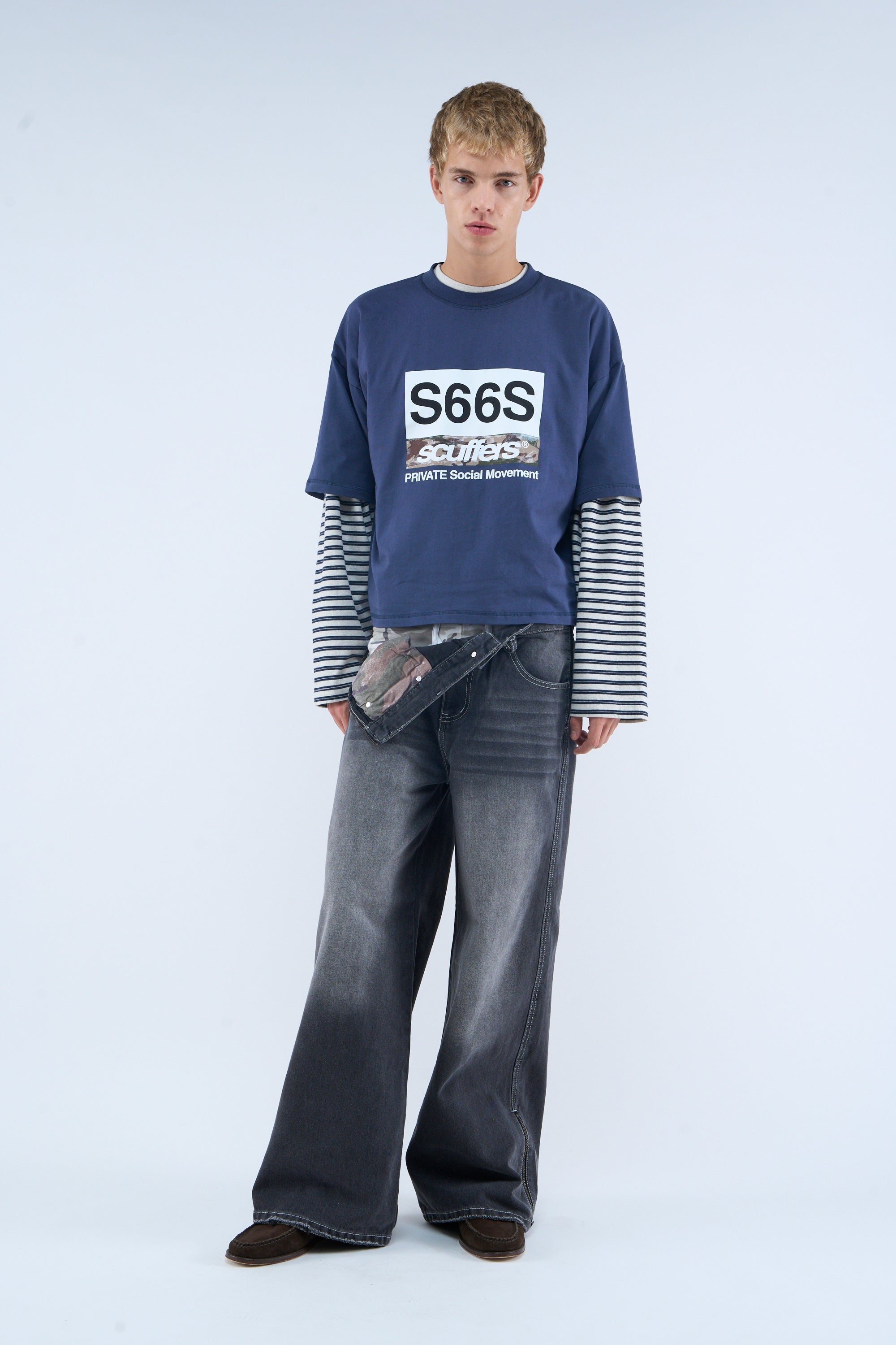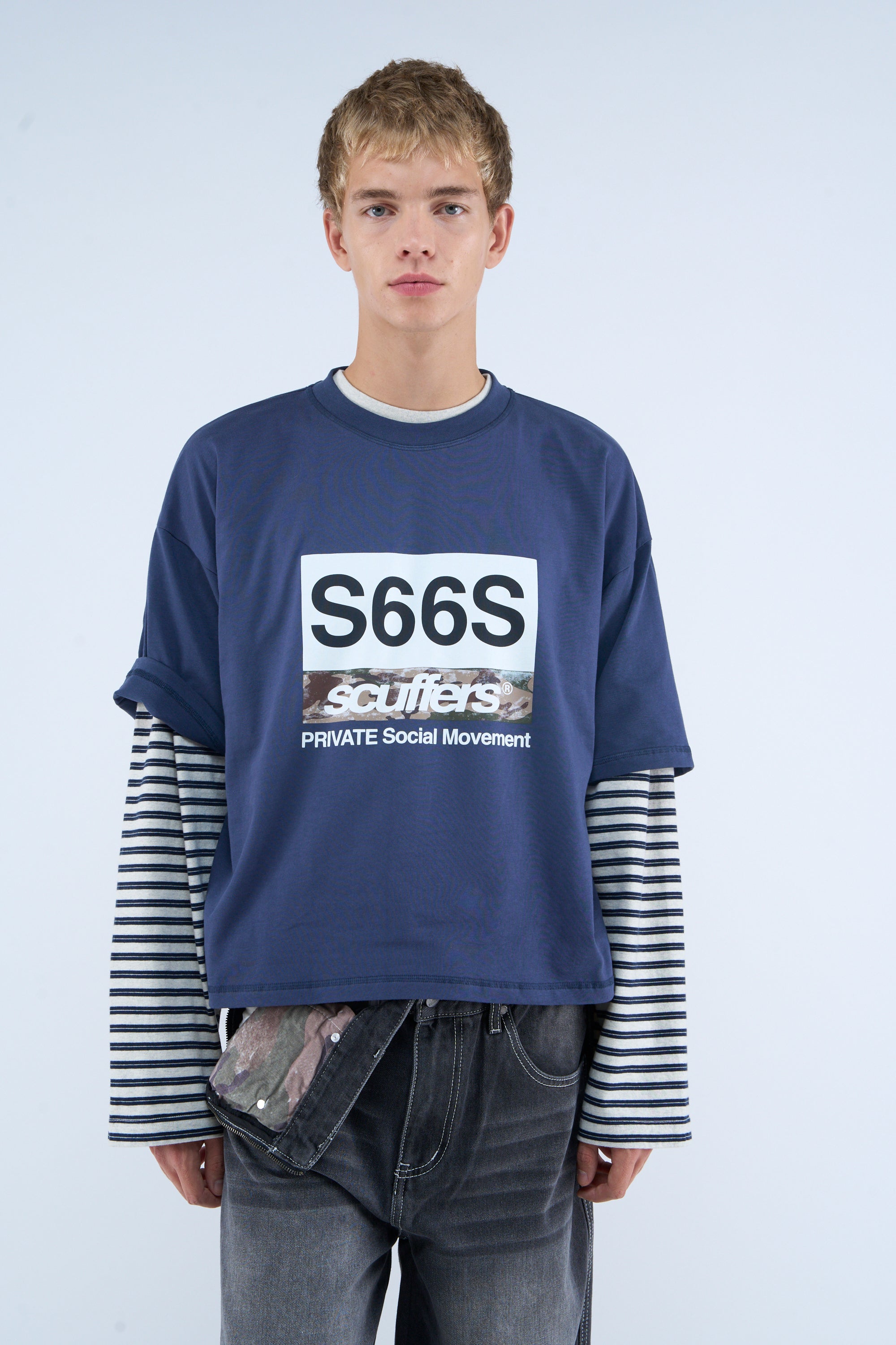 Navy T-Shirt made from cotton jersey with a soft finish. Features a boxy fit, ribbed crew neck, and bold front graphic with “S66S” in large black lettering and “scuffers” with a camouflage print below. The text “PRIVATE Social Movement” is printed underneath in smaller white letters. Short sleeves with a relaxed, dropped shoulder fit. A small "scuffers" logo is featured on the back near the neck.