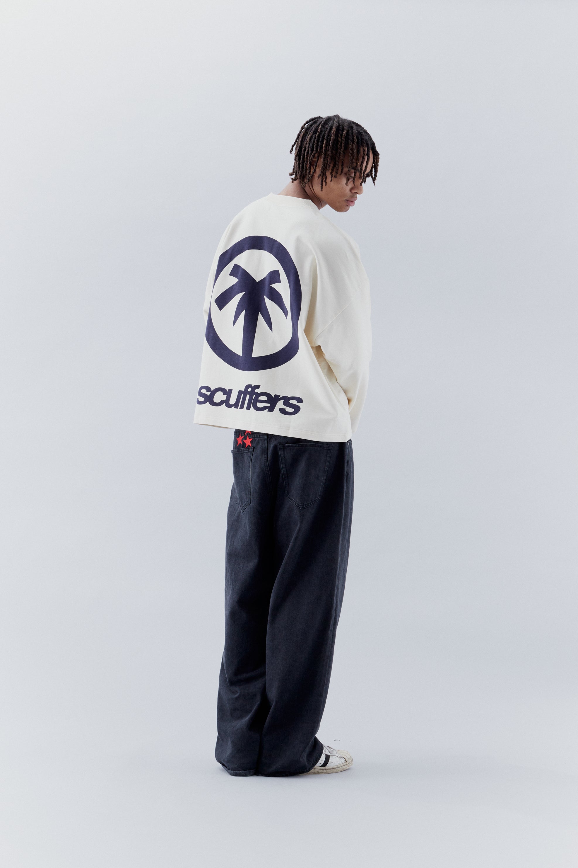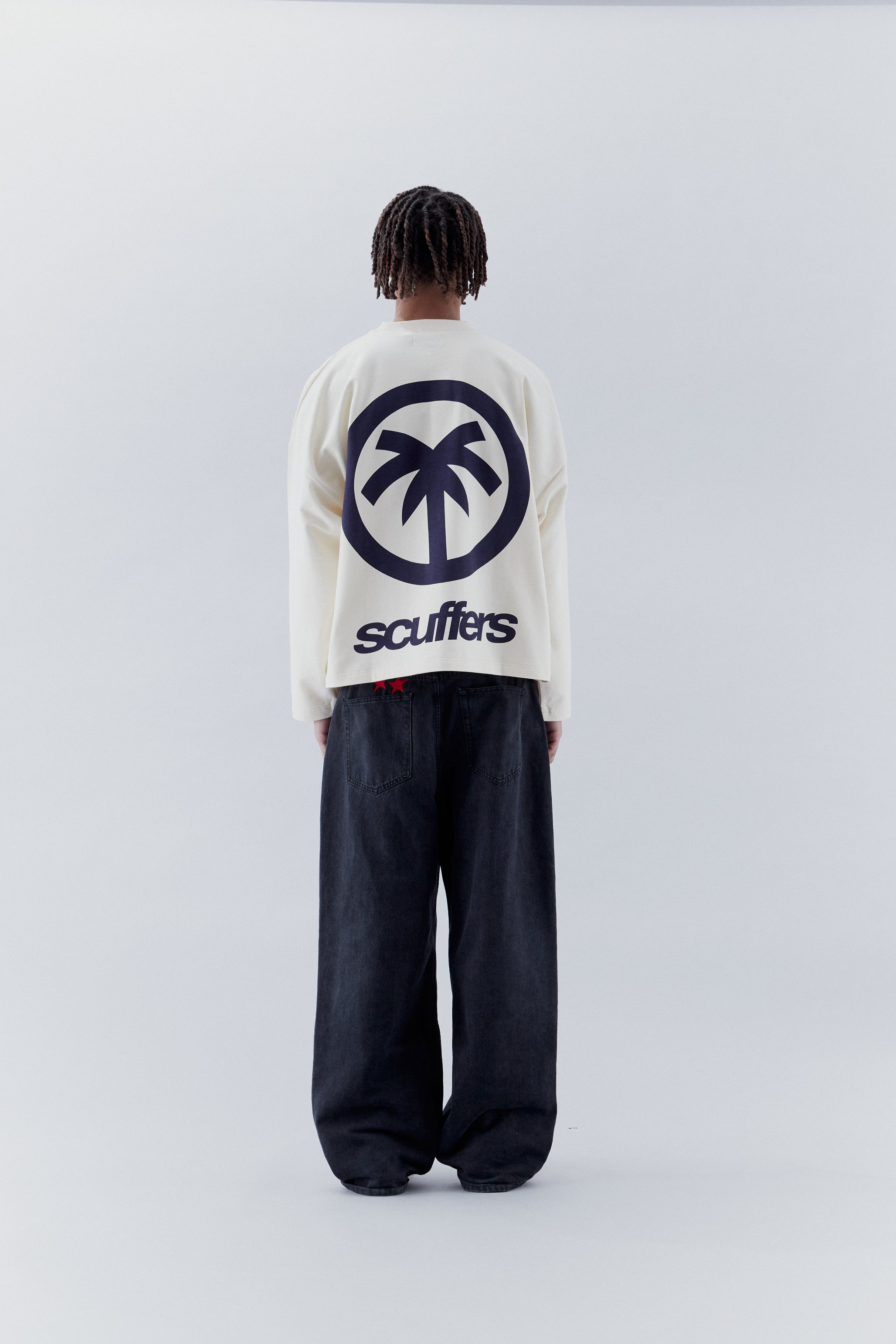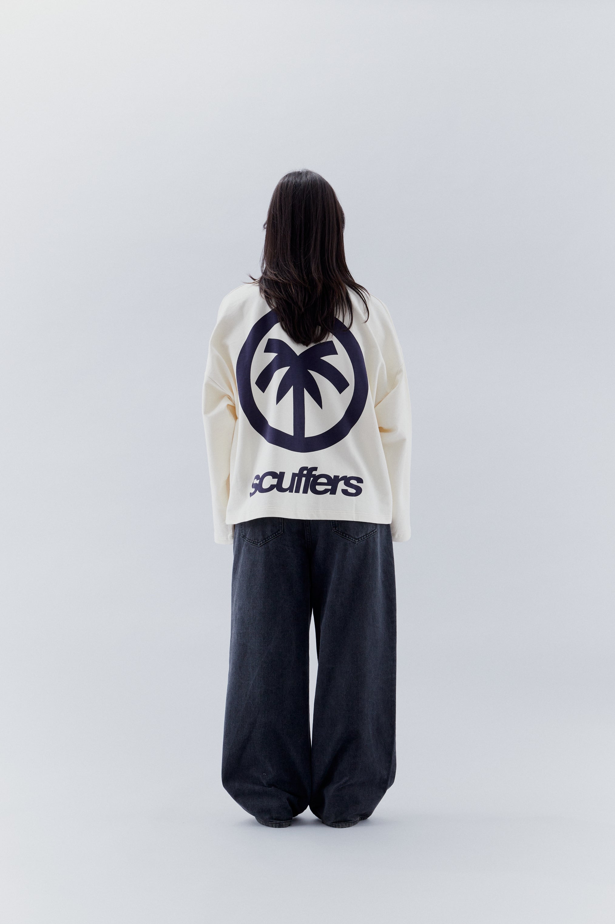 Oversized crewneck sweatshirt in ecru. ’Not Ibiza Yet’, 'Everyday Urban Aesthetics Scuffers studios' and 'Scuffers' logos screen-printed on the left and right side of the sweatshirt and our Palm design on the back of the sweatshirt in black color.