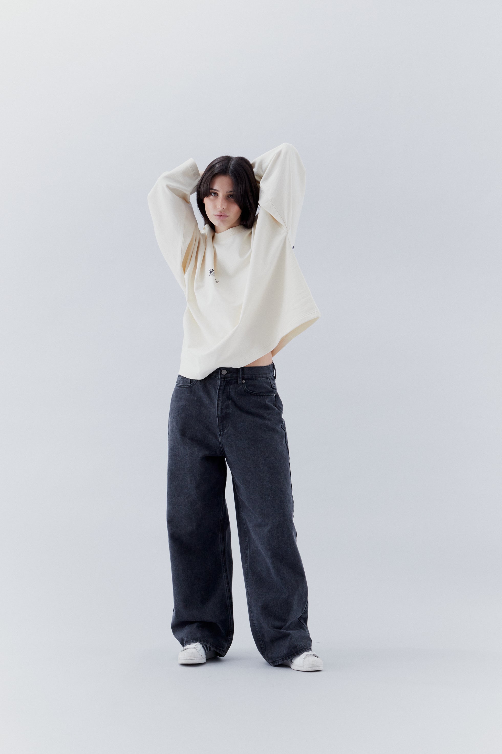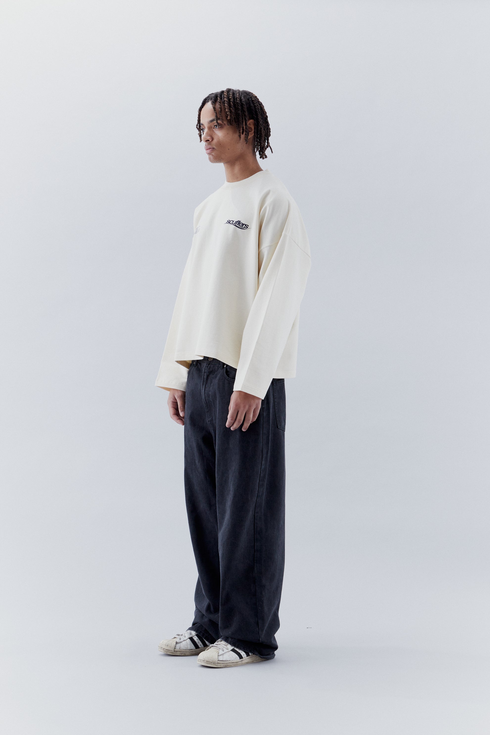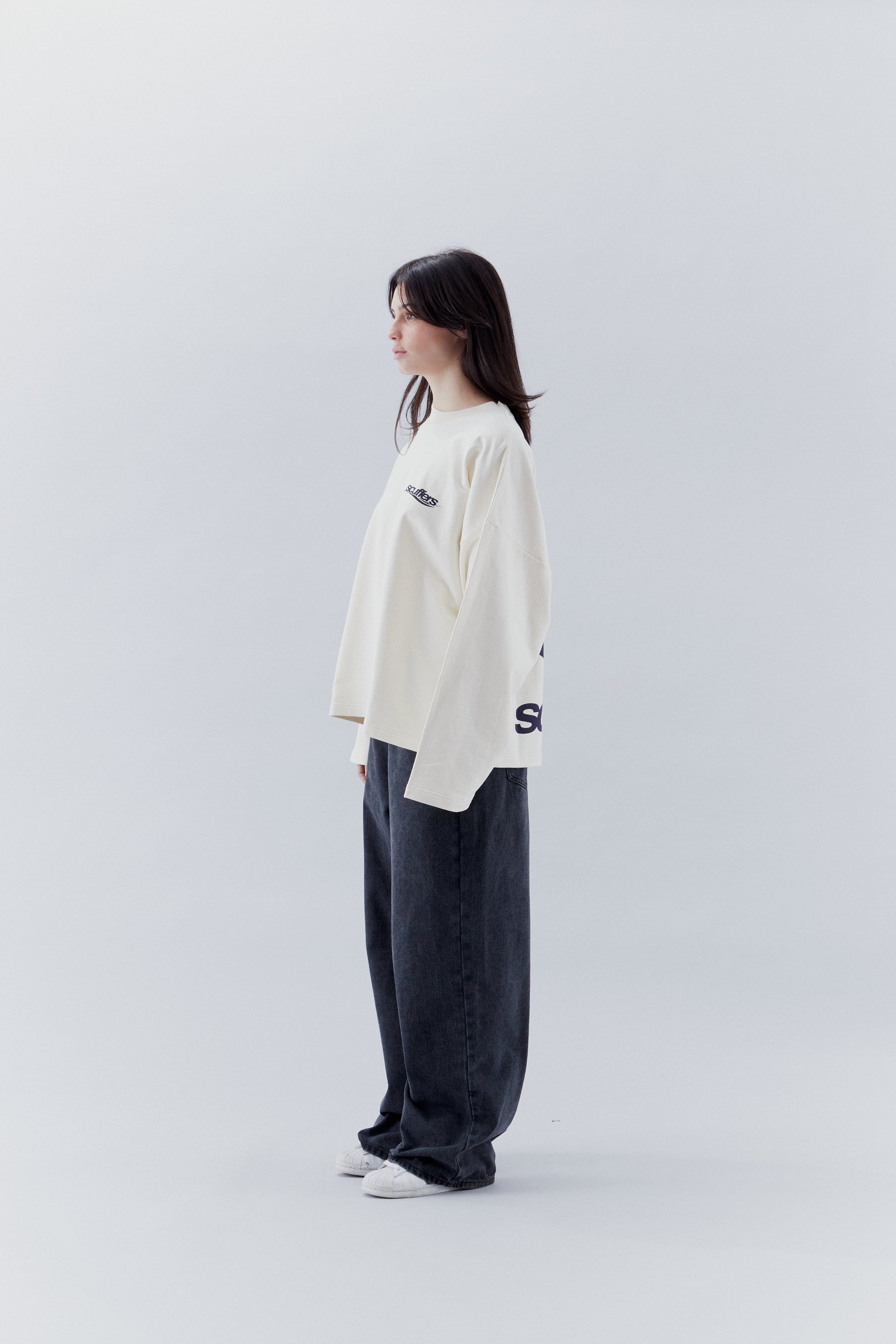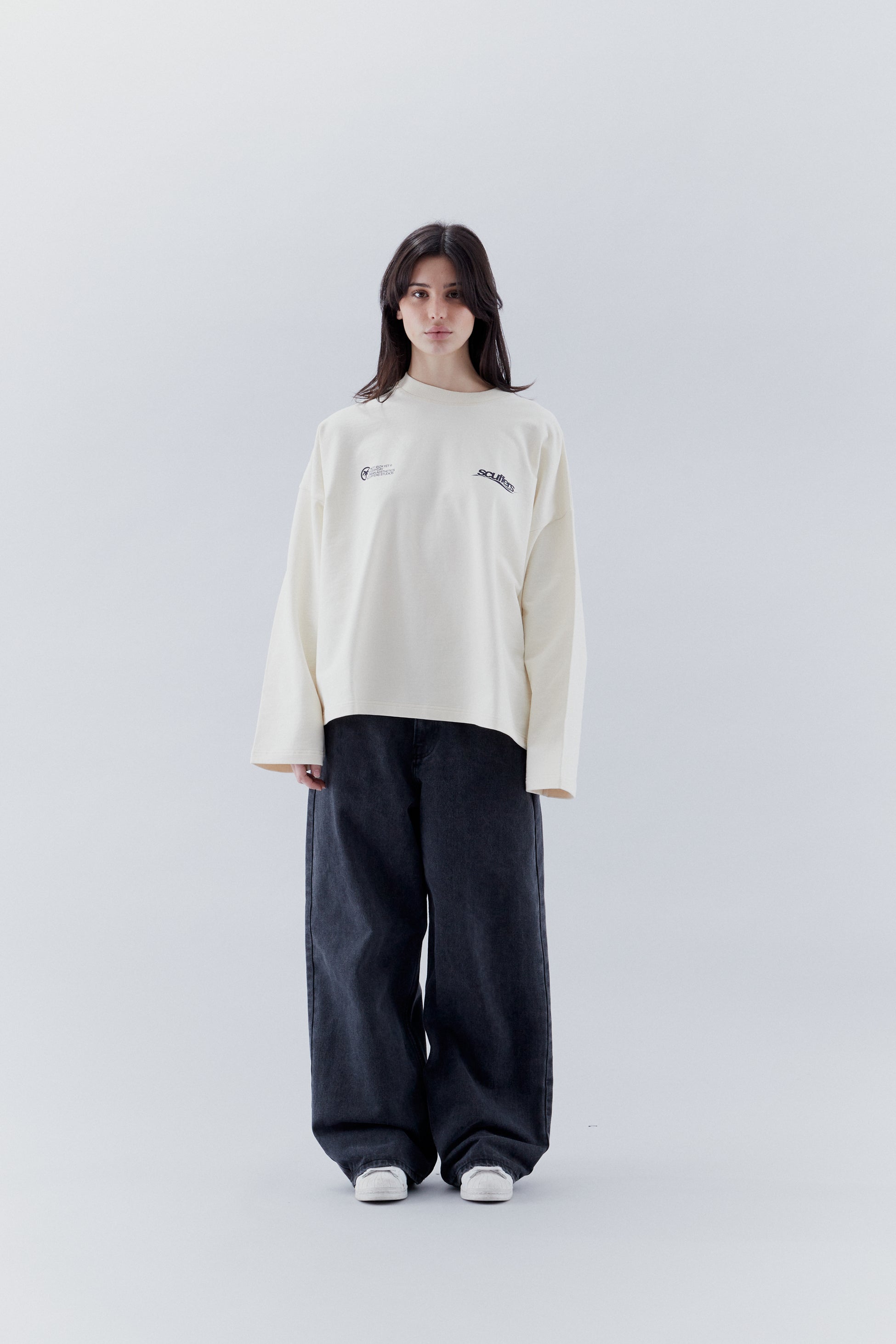 Oversized crewneck sweatshirt in ecru. ’Not Ibiza Yet’, 'Everyday Urban Aesthetics Scuffers studios' and 'Scuffers' logos screen-printed on the left and right side of the sweatshirt and our Palm design on the back of the sweatshirt in black color.