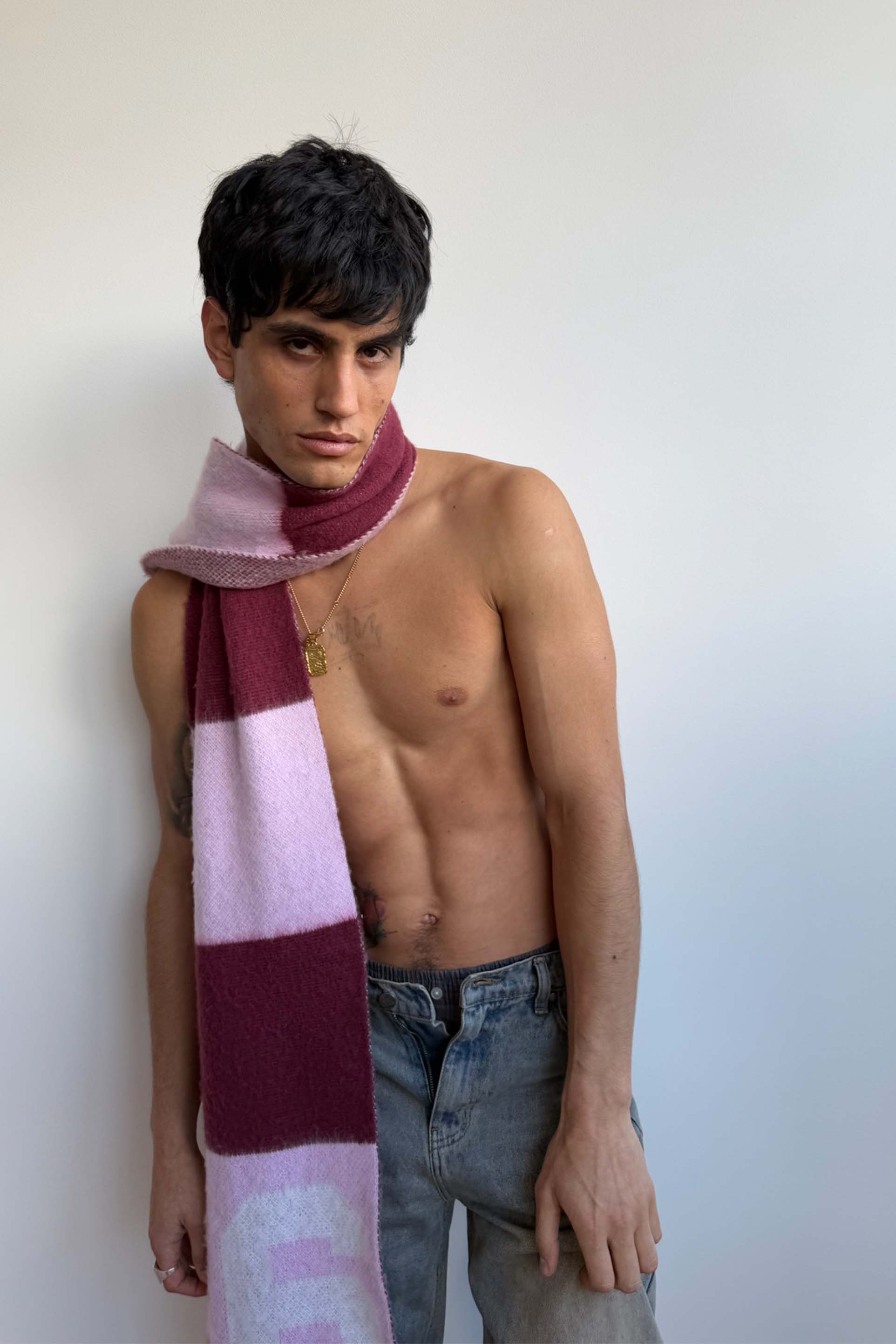 Pink and Burgundy Striped Scarf – Soft brushed knit with alternating wide stripes and long fringe ends. Features bold intarsia “6” graphic and woven Scuffers Studios label. Mid-weight acrylic blend. Rectangular shape.