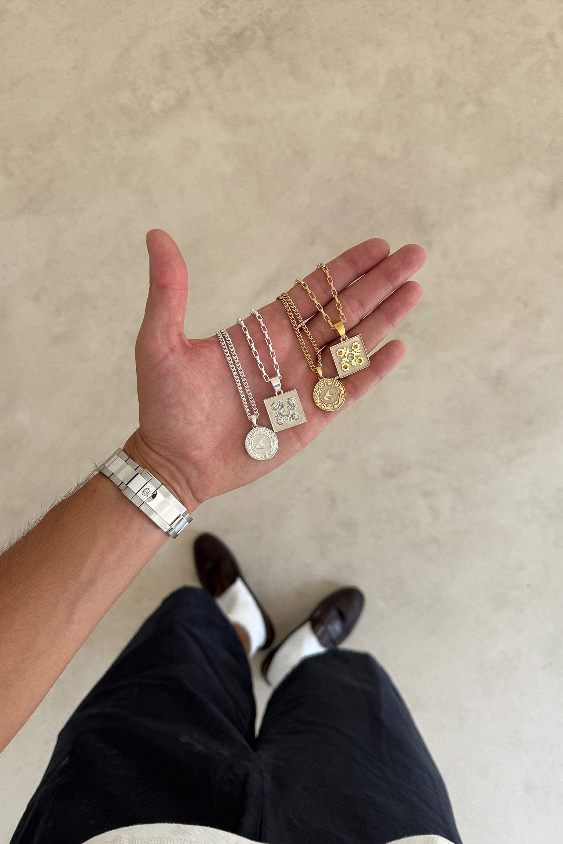 Floral Square Pendant Necklace made from brass. Features a square charm with raised floral detailing and central Scuffers “S” emblem. Paperclip-style adjustable chain with lobster clasp and engraved logo tag.