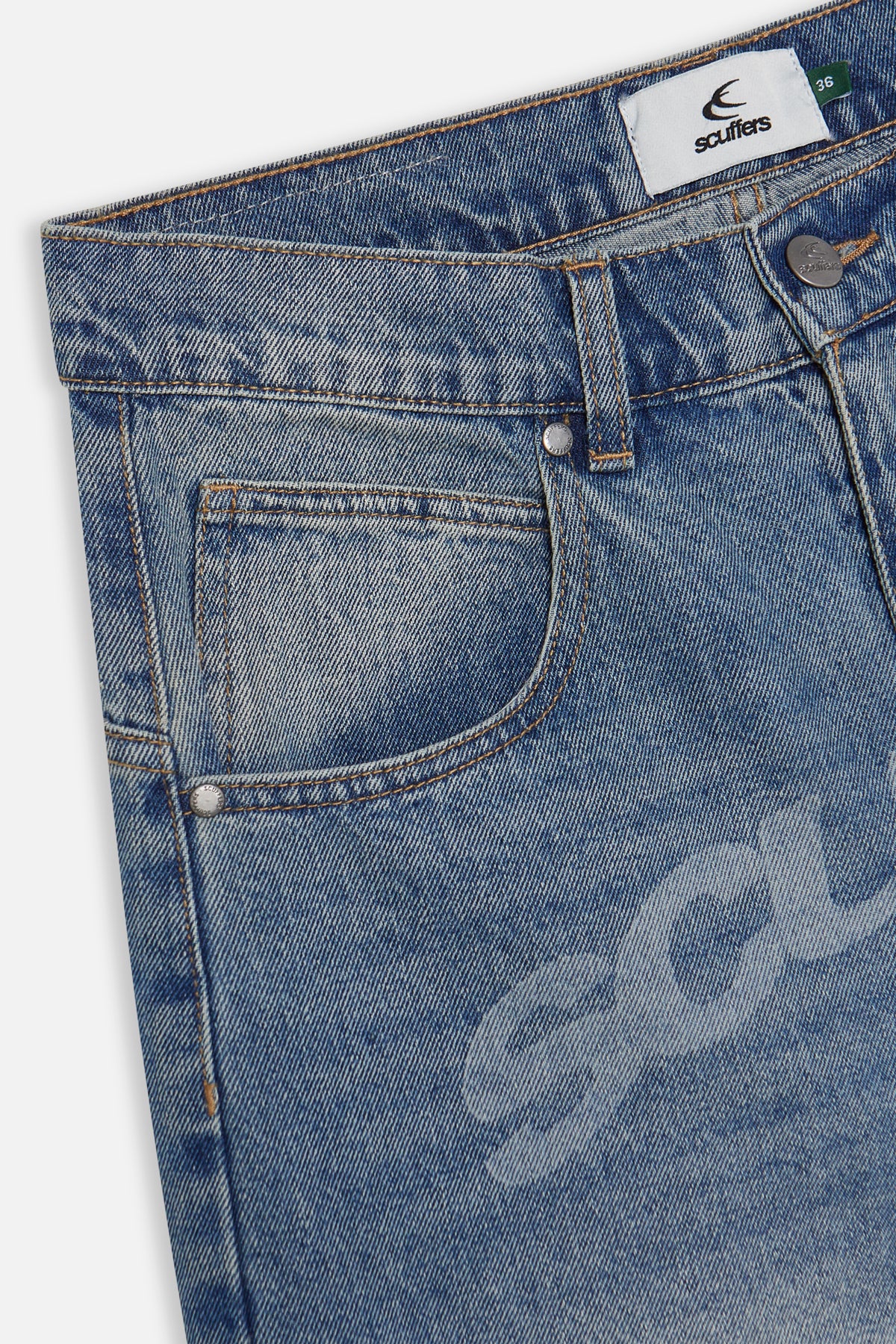 Washed Denim Jeans in mid-blue cotton with a wide-leg fit. Features faded Scuffers logo across front, contrast stitching, and embroidered rear pocket detailing. Classic 5-pocket construction with zip fly and metal button closure.