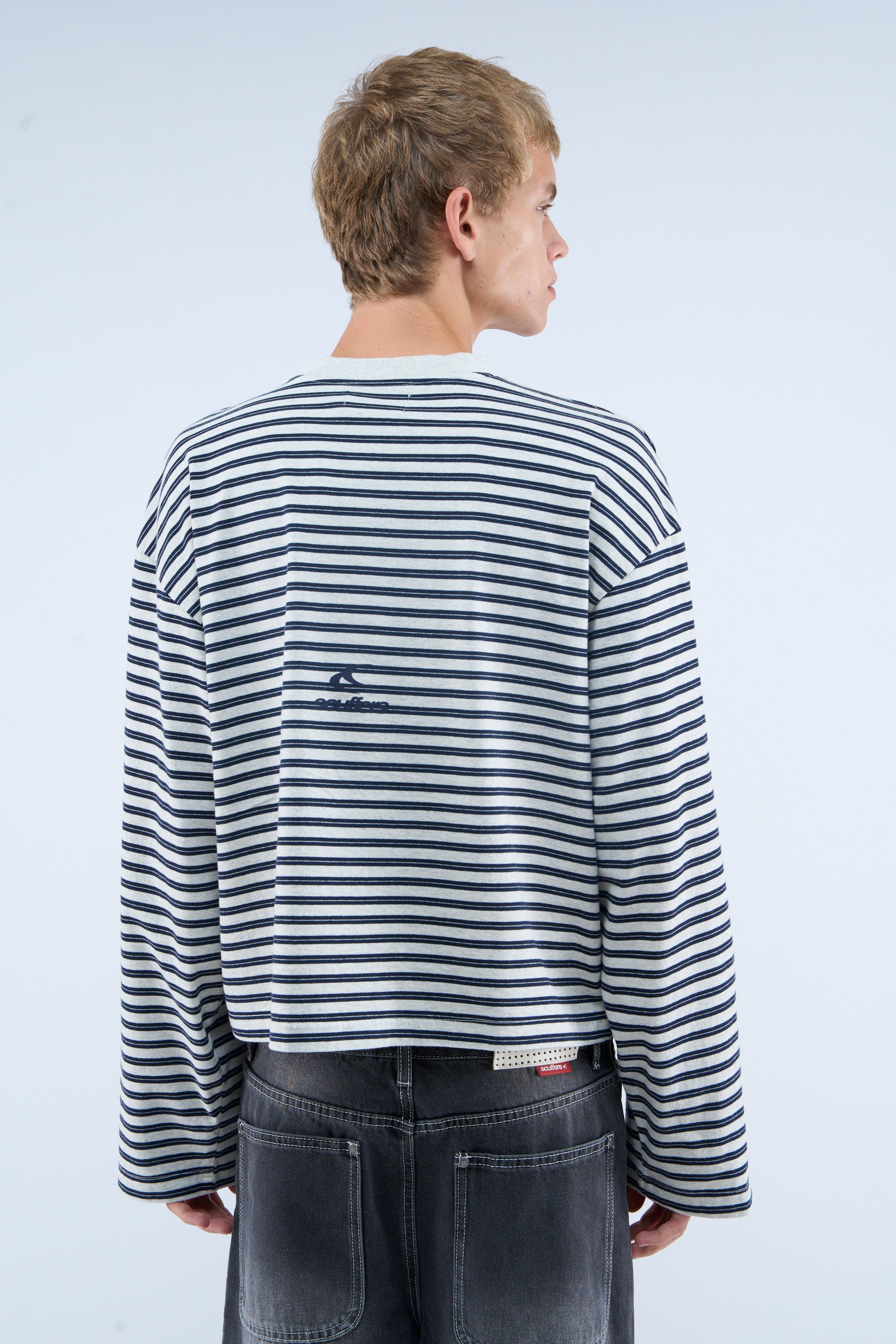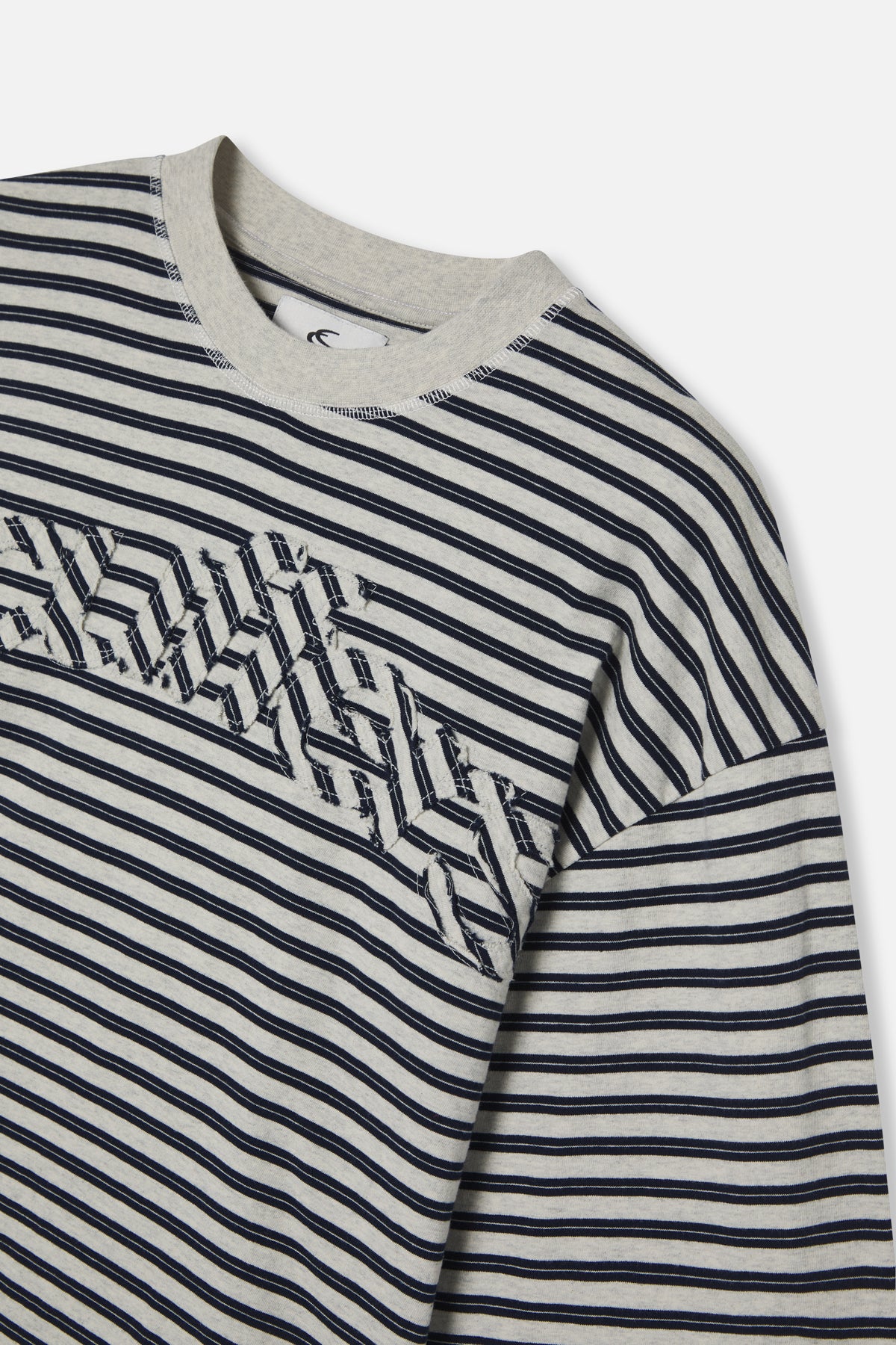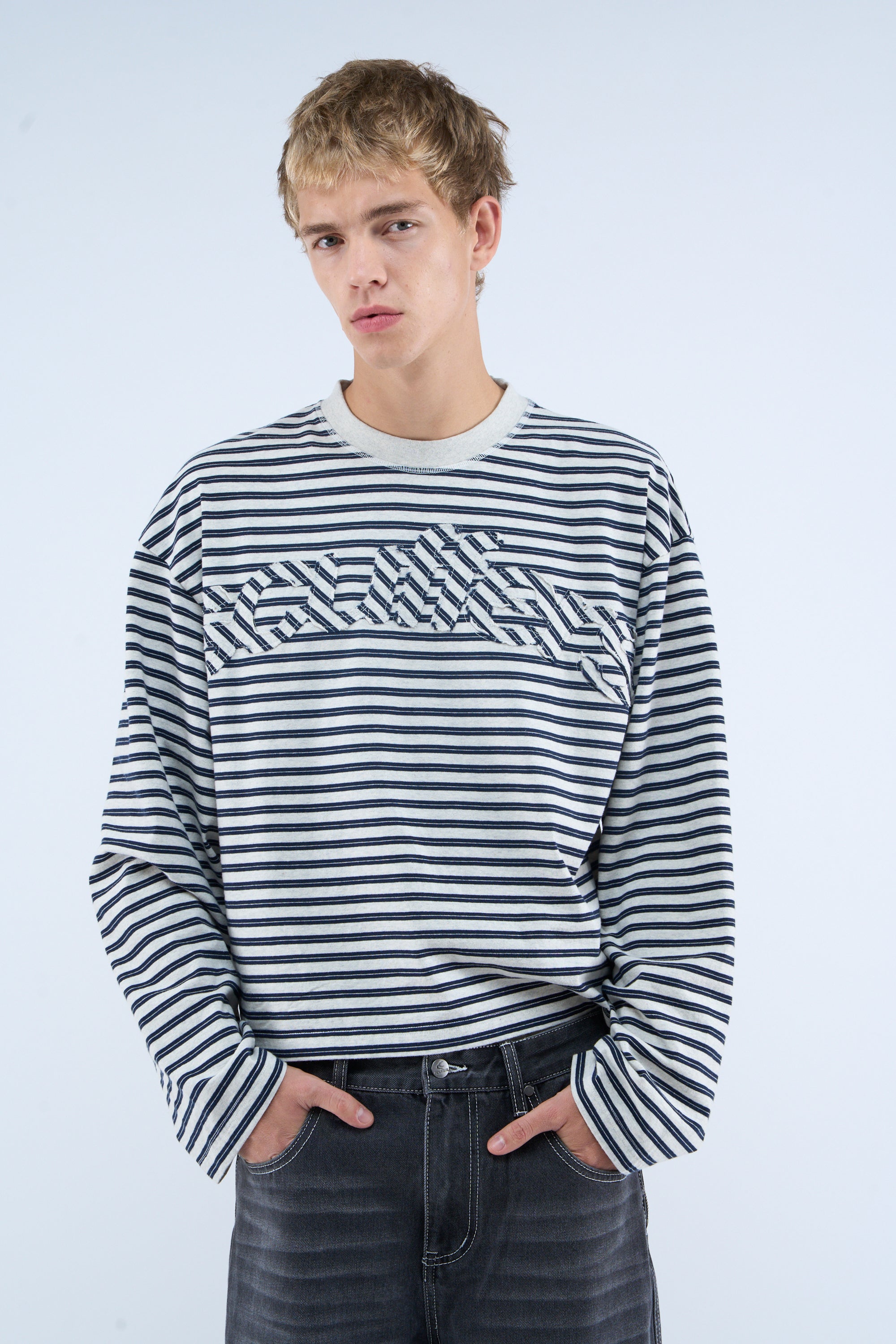 Striped Long-Sleeve T-Shirt made from soft cotton fabric. Features a relaxed fit, with horizontal navy and white stripes. The front is detailed with a "scuffers" logo in a distressed design across the chest. The back is simple with a small embroidered logo near the hem. Finished with a ribbed crew neck.