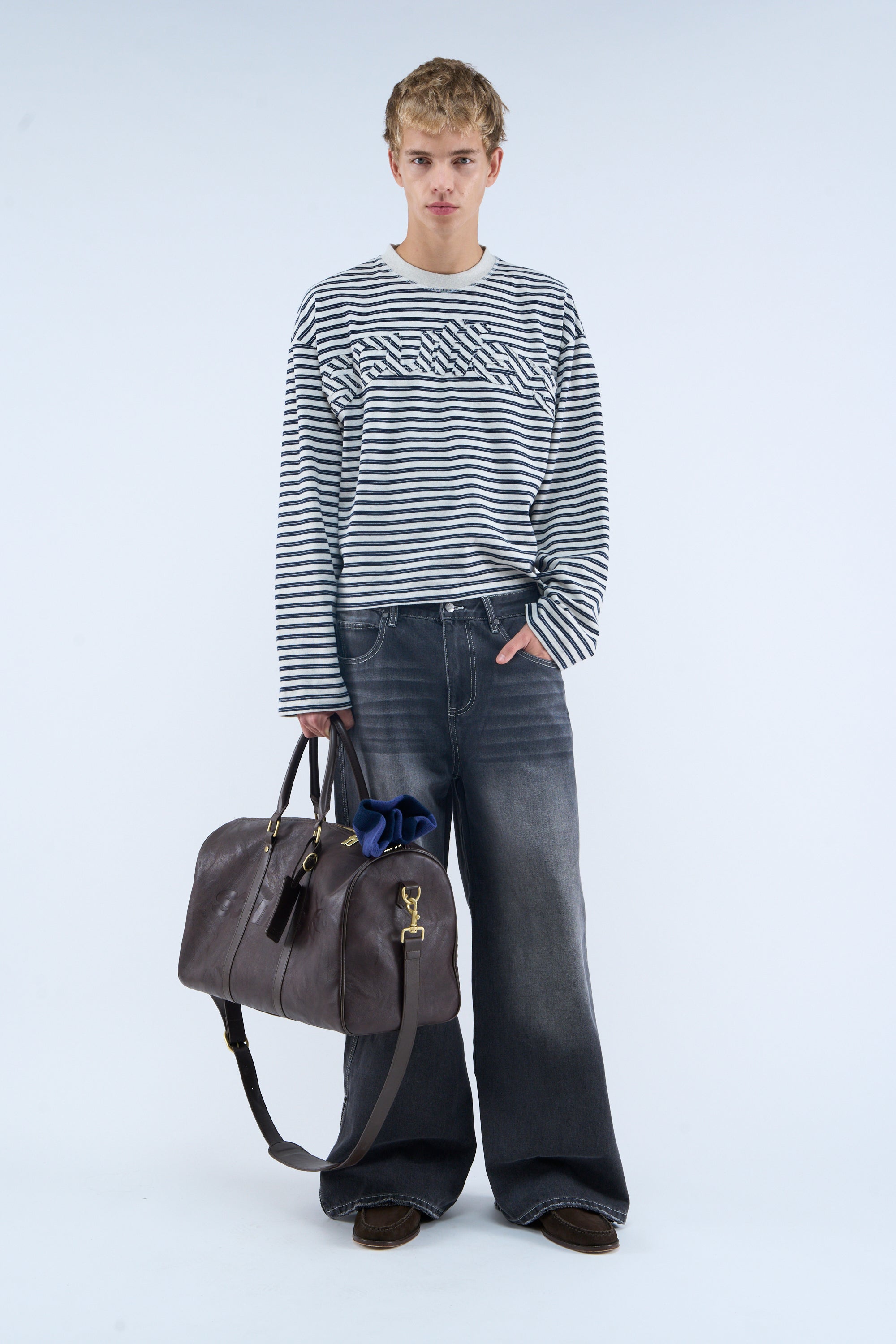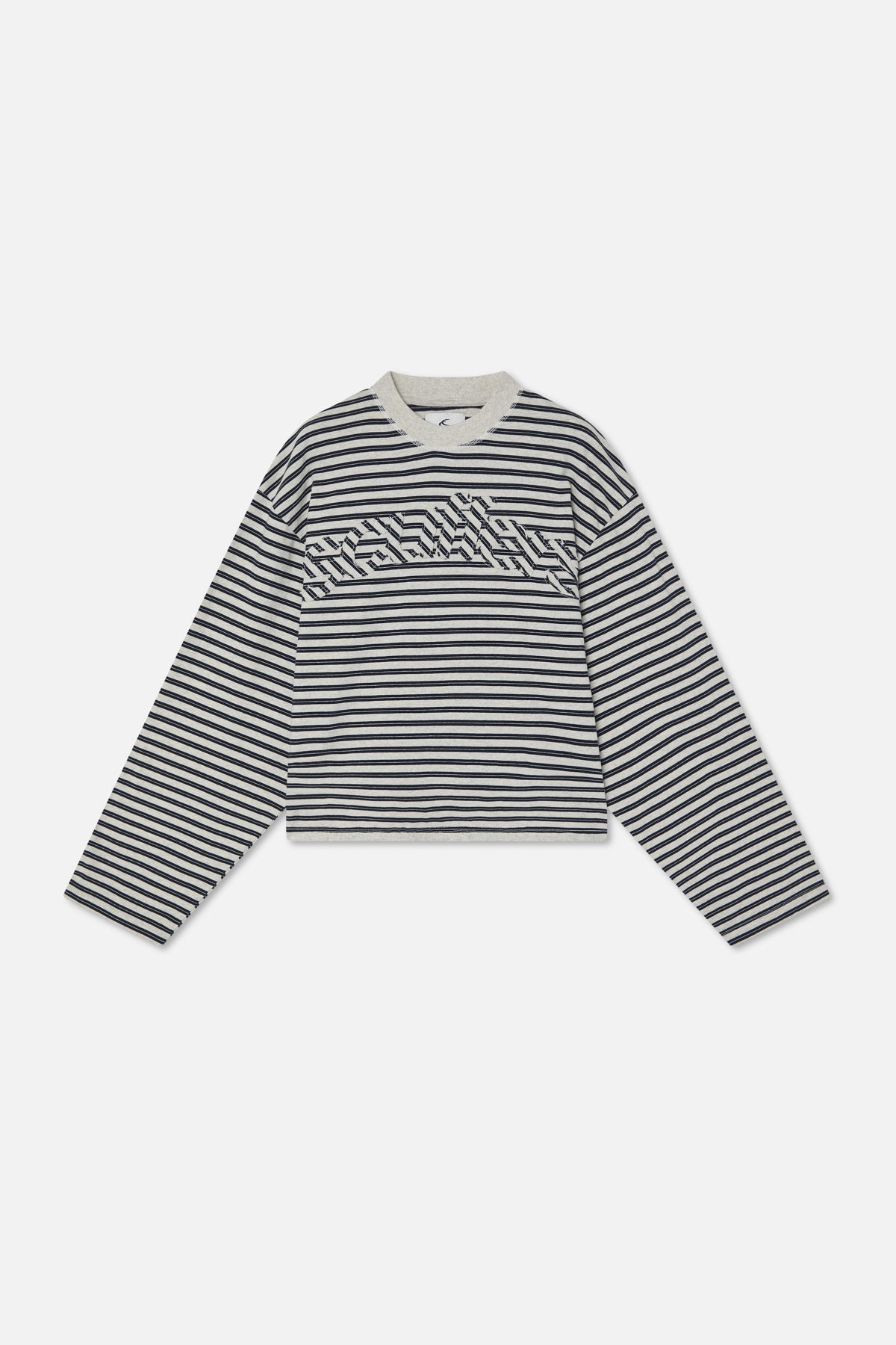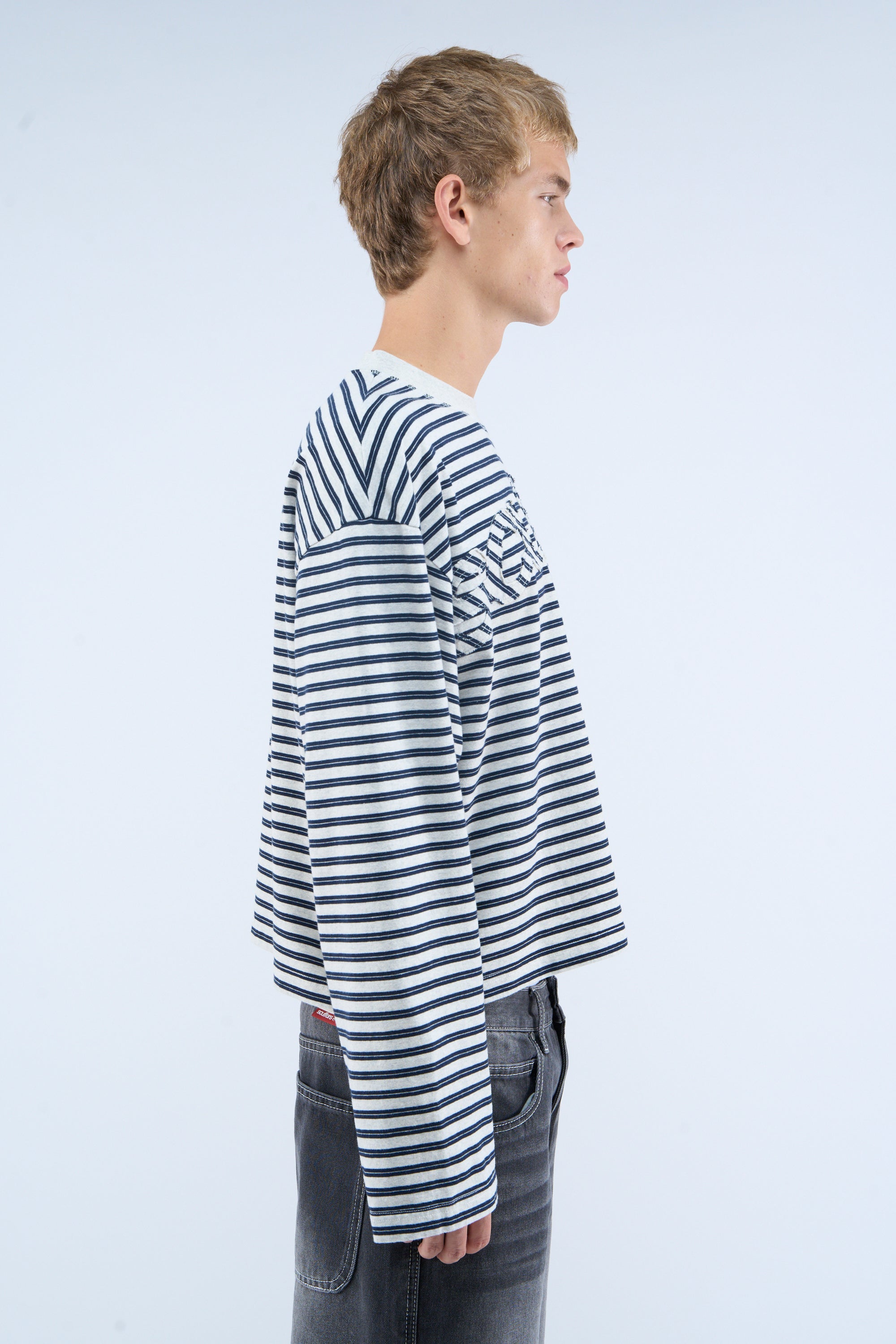 Striped Long-Sleeve T-Shirt made from soft cotton fabric. Features a relaxed fit, with horizontal navy and white stripes. The front is detailed with a "scuffers" logo in a distressed design across the chest. The back is simple with a small embroidered logo near the hem. Finished with a ribbed crew neck.