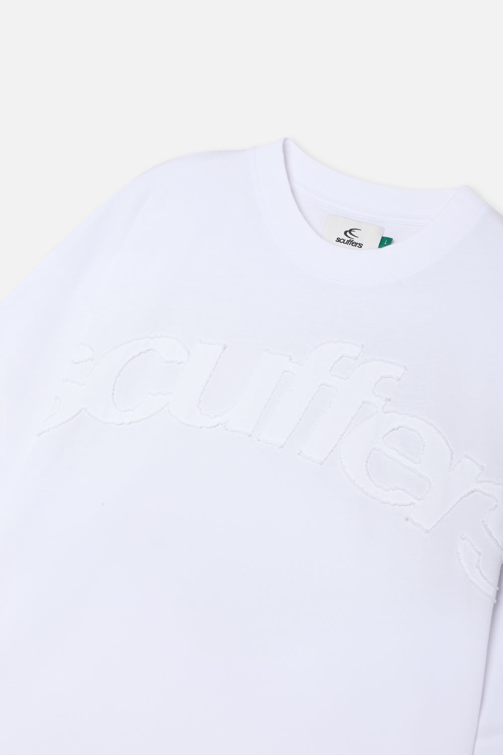 White Logo T-Shirt made from heavyweight cotton jersey with a relaxed fit. Features tonal terry-textured Scuffers logo across the chest and small printed logo on the back. Finished with a ribbed crew neckline and dropped shoulders.