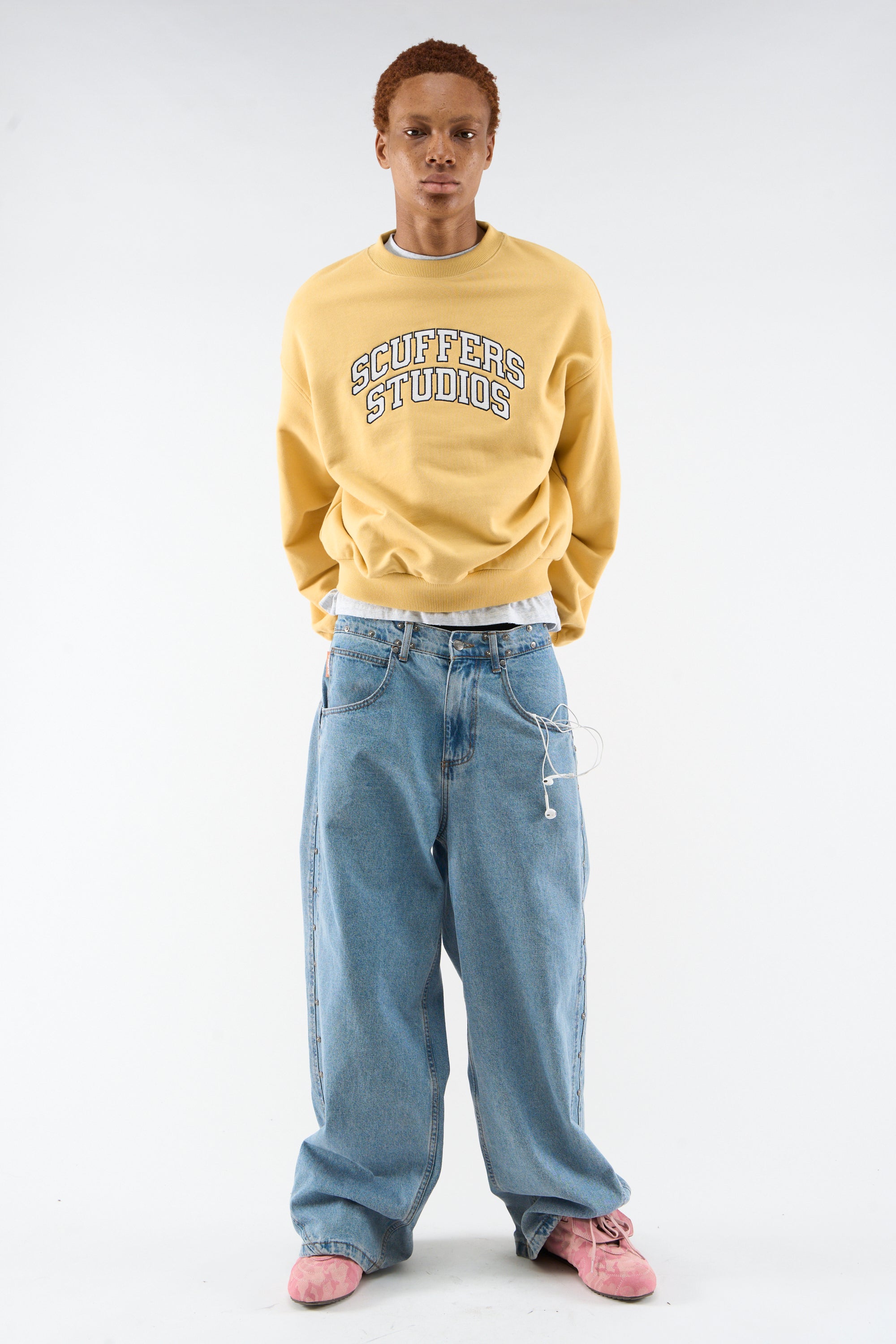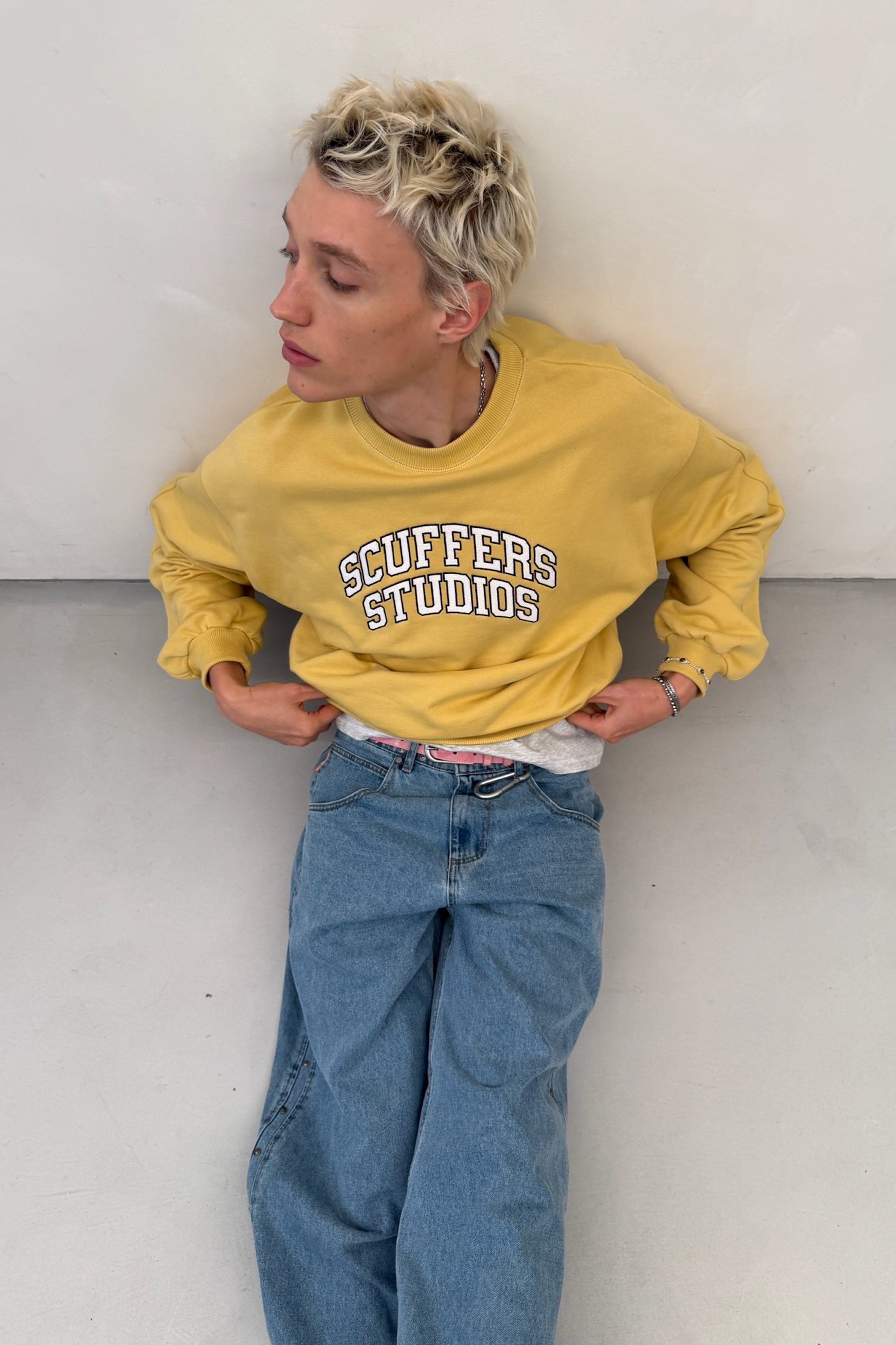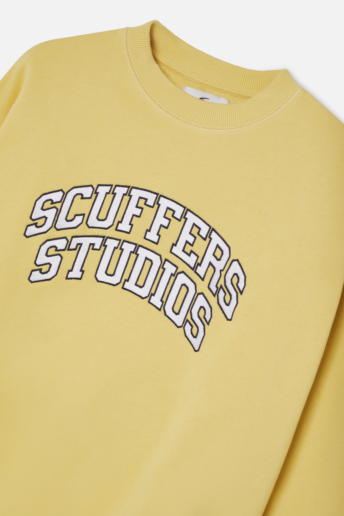Yellow Crewneck Sweatshirt with a bold "Scuffers Studios" print in a collegiate font on the front. The ribbed cuffs and hem ensure a comfortable fit, while the soft cotton fabric provides a relaxed feel. On the back, a subtle "Everyday Urban Aesthetics" logo adds an extra touch of branding. Casual, versatile, and perfect for everyday wear.