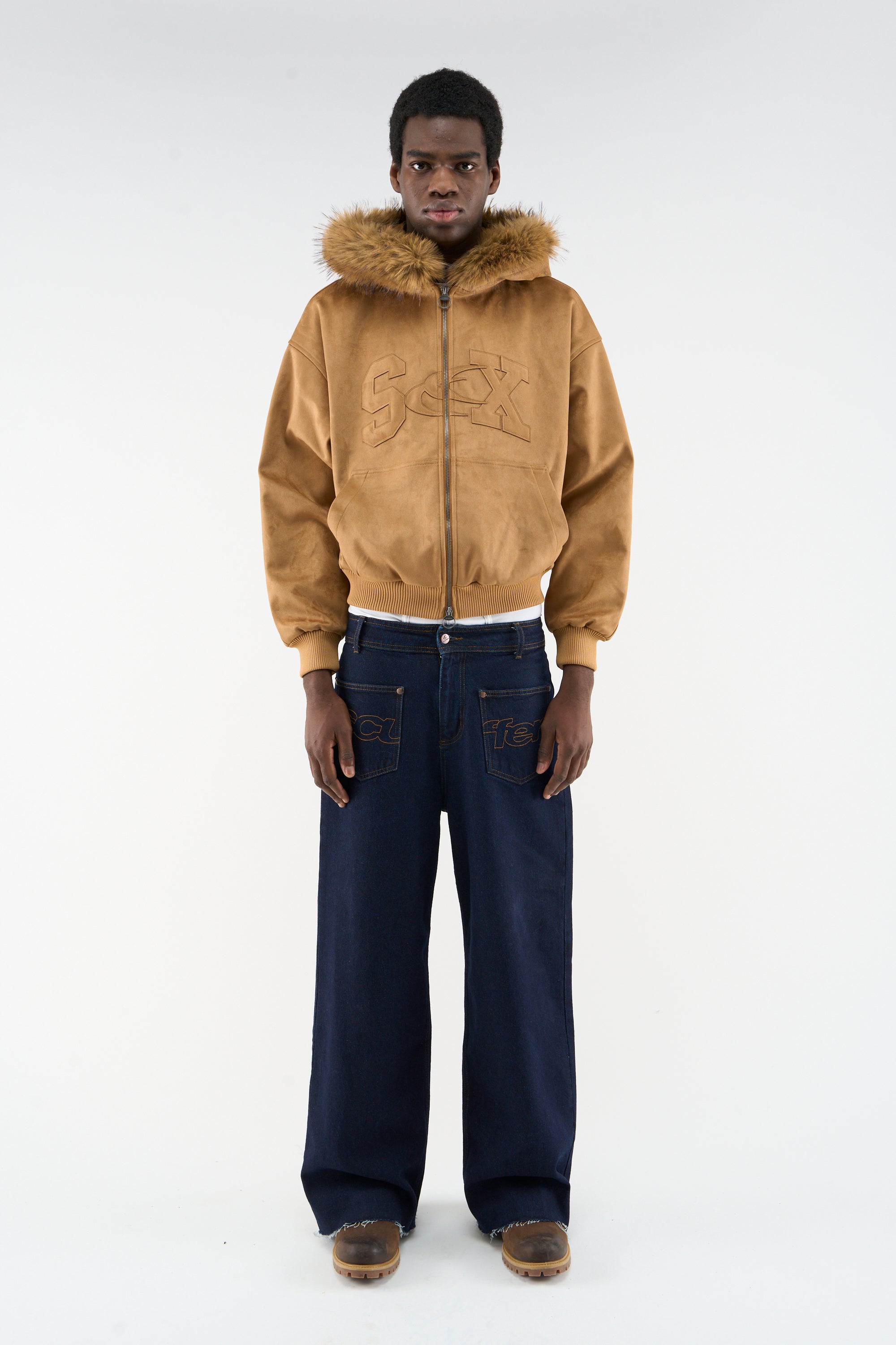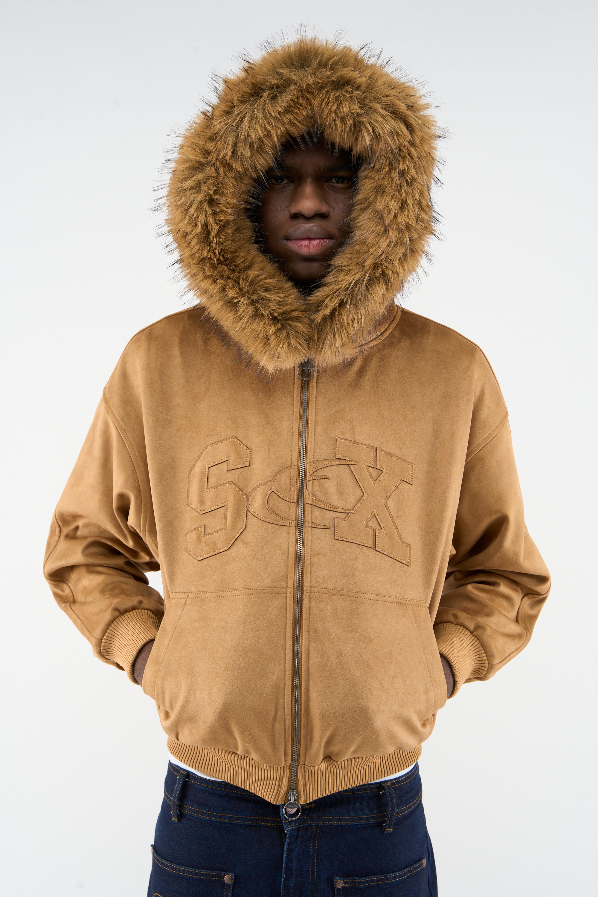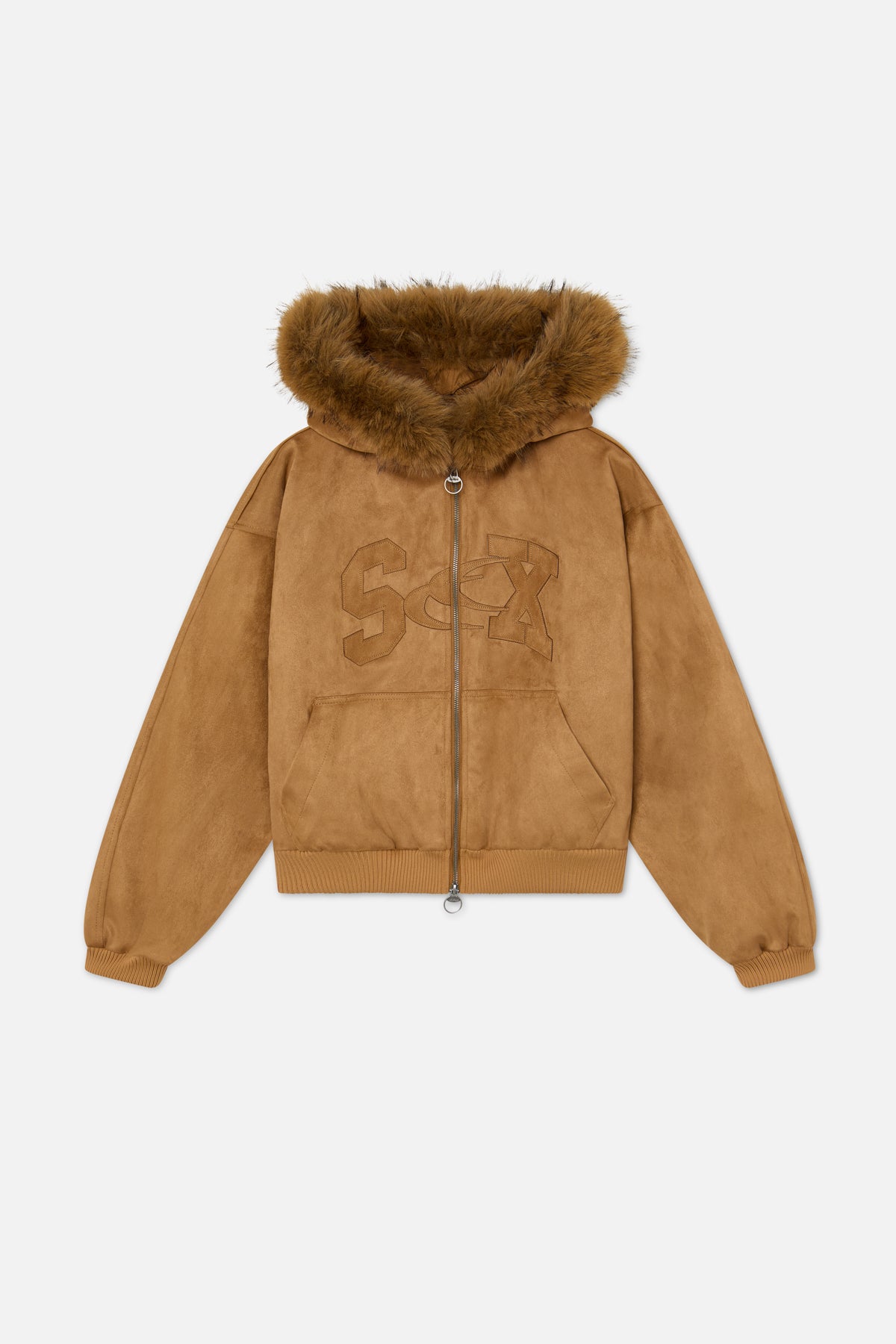 Camel Faux Suede Hoodie with oversized tonal “SCX” embroidery across the chest. Made from soft faux suede with a plush brown faux fur trim along the hood. Features a two-way metal zip closure with ring pullers, front kangaroo pocket, and ribbed cuffs and hem. Fully lined interior for added warmth and structure.