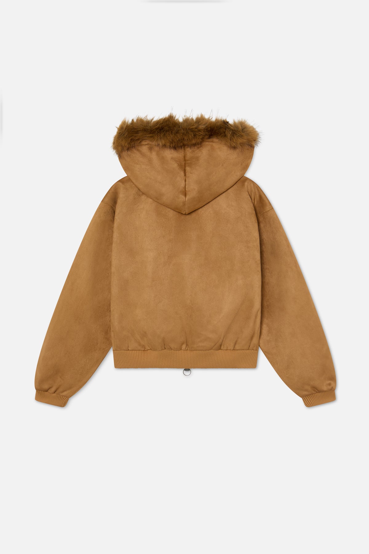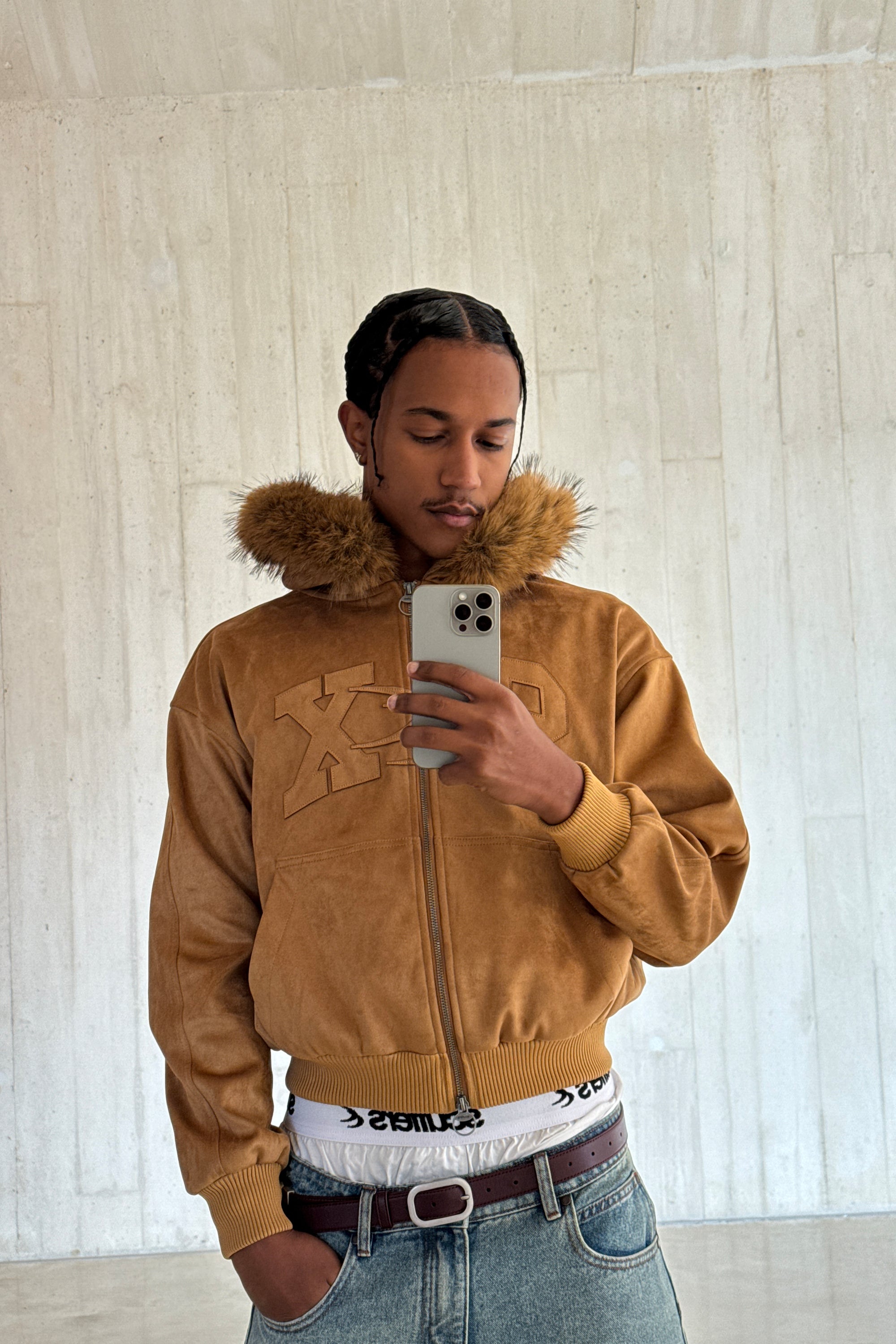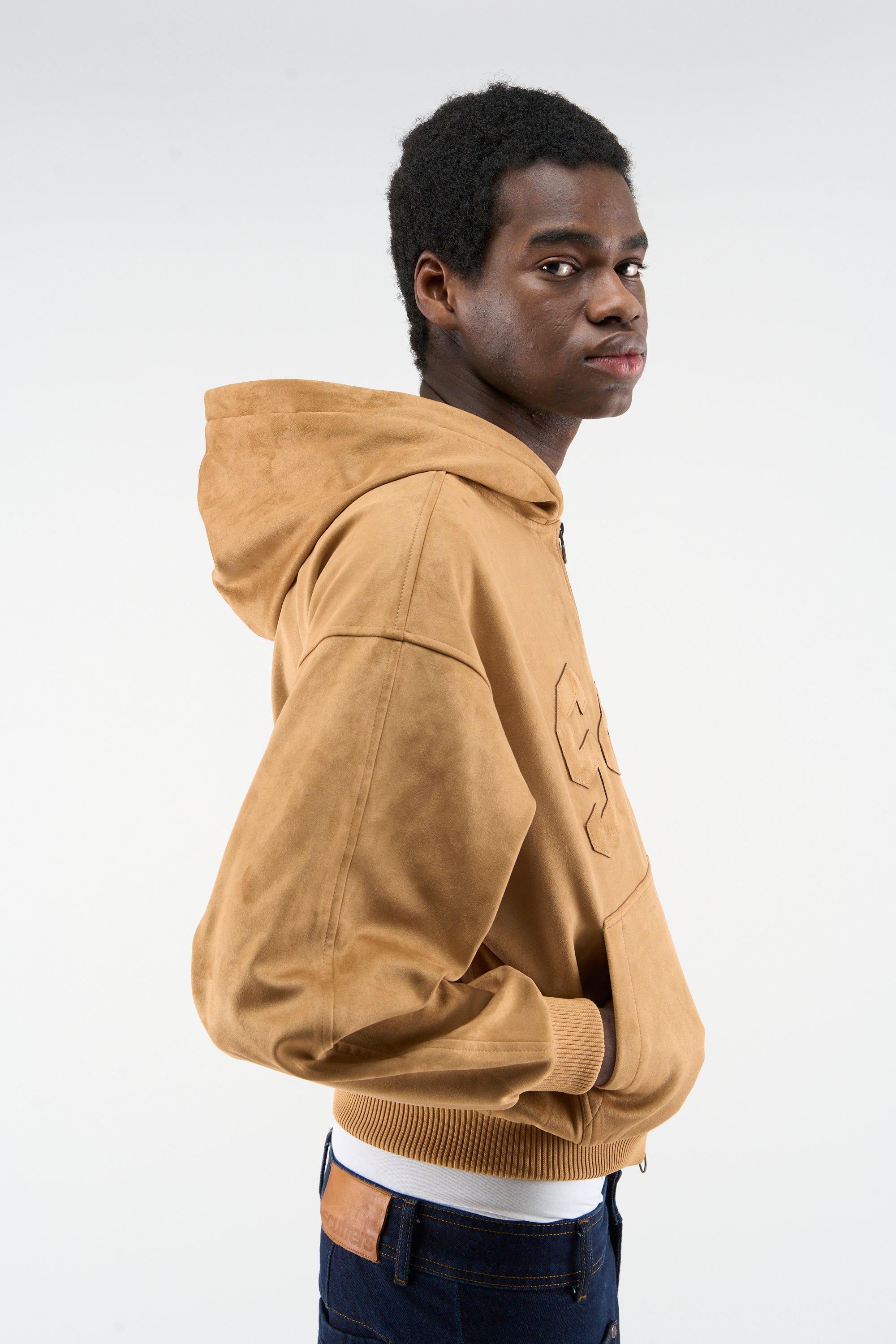 Camel Faux Suede Hoodie with oversized tonal “SCX” embroidery across the chest. Made from soft faux suede with a plush brown faux fur trim along the hood. Features a two-way metal zip closure with ring pullers, front kangaroo pocket, and ribbed cuffs and hem. Fully lined interior for added warmth and structure.