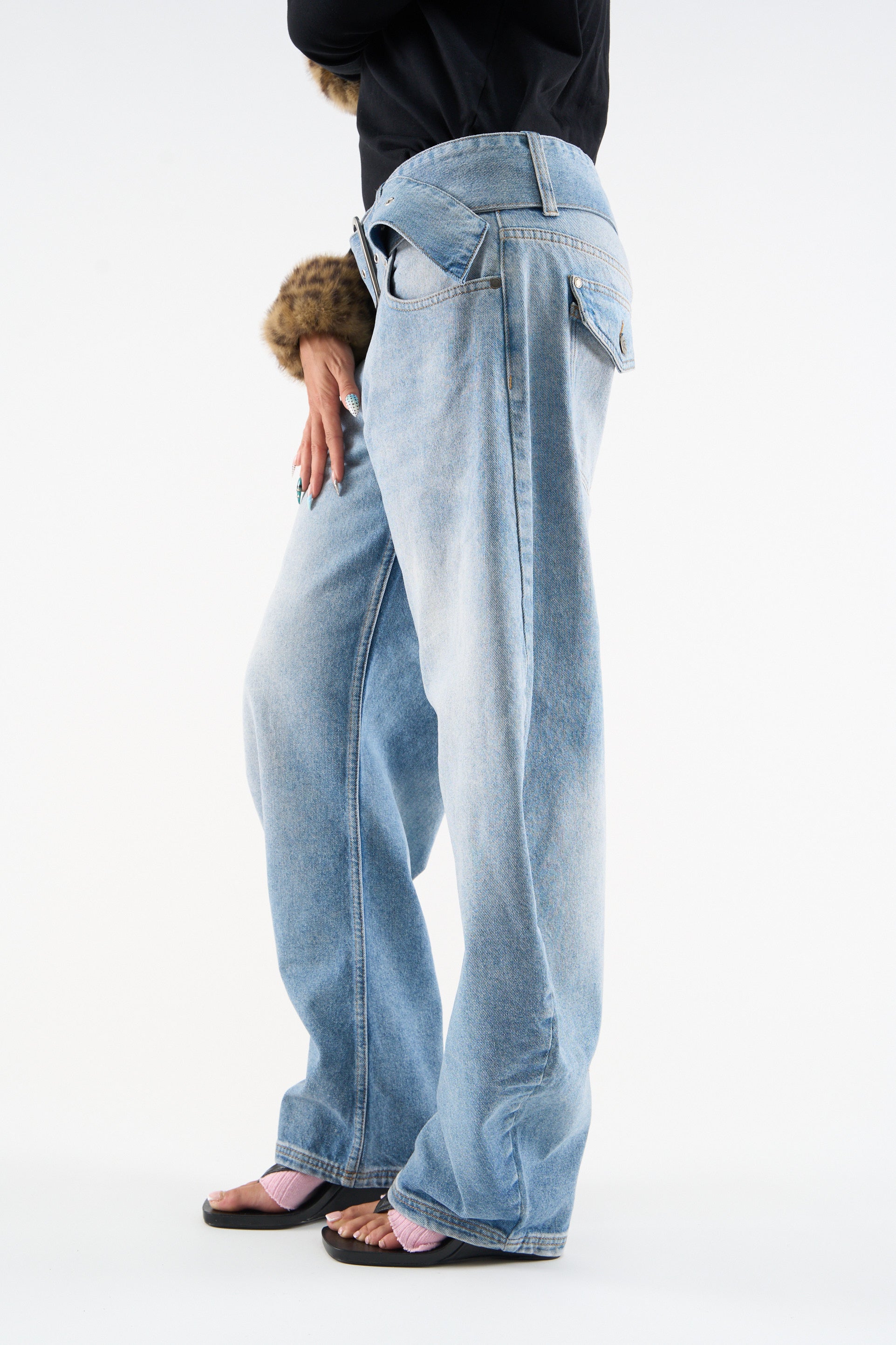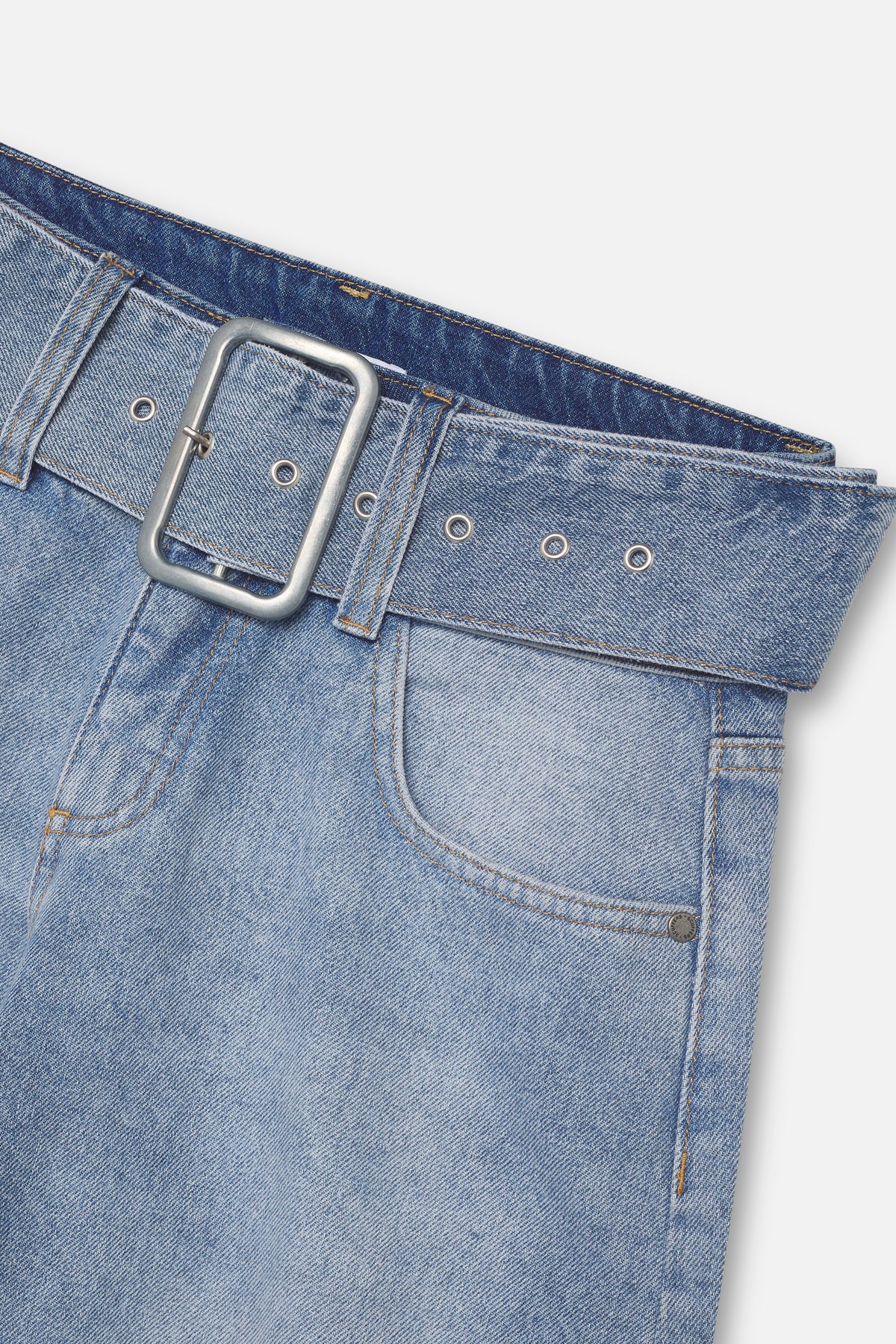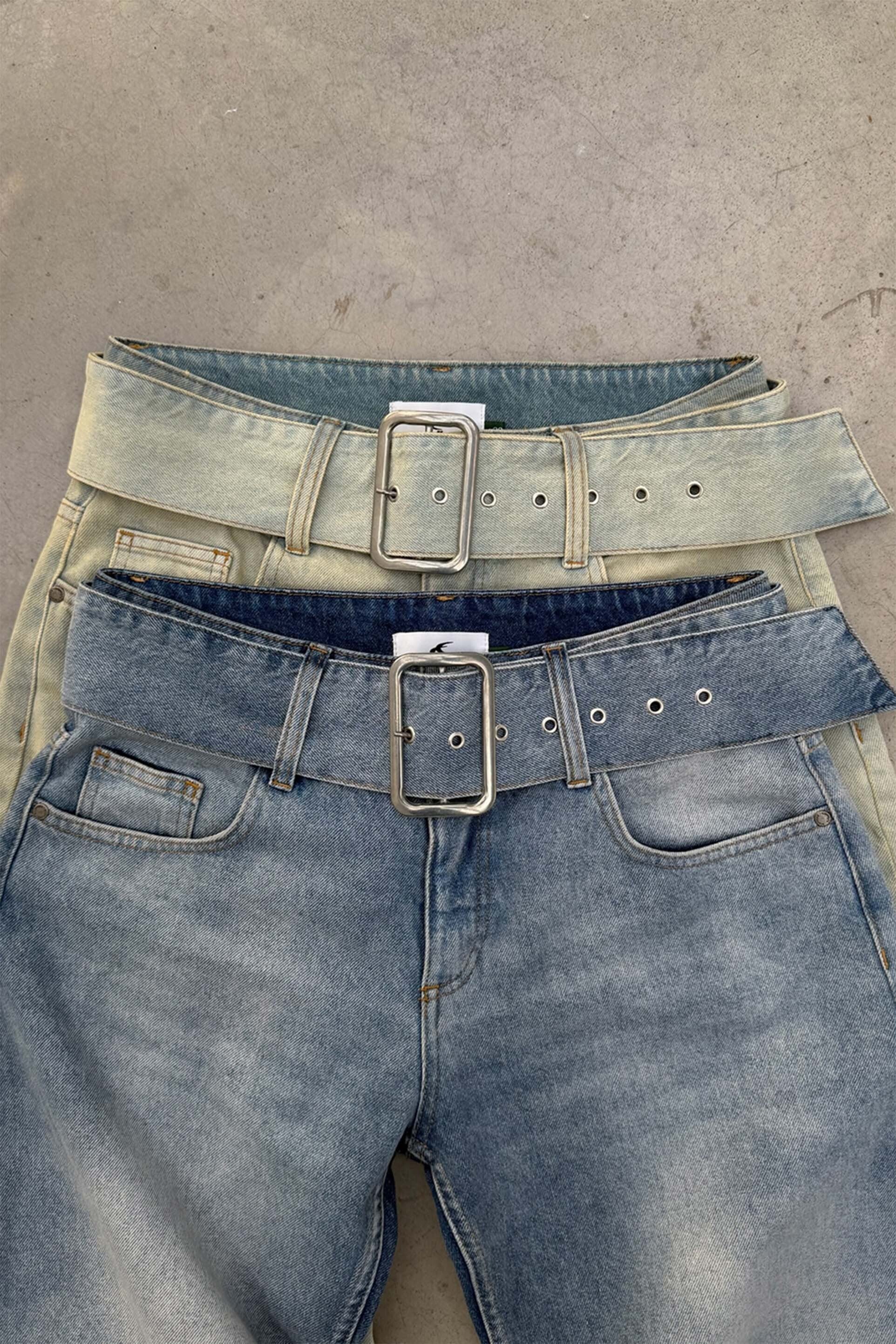 Light Blue Balloon Jeans with an exaggerated curved leg silhouette and washed finish. Comes with an integrated matching denim belt featuring a square metal buckle. Includes classic five-pocket styling, with contrast stitching, zip pocket detail on the back, and a tan leather SCU logo patch at the waistband.
