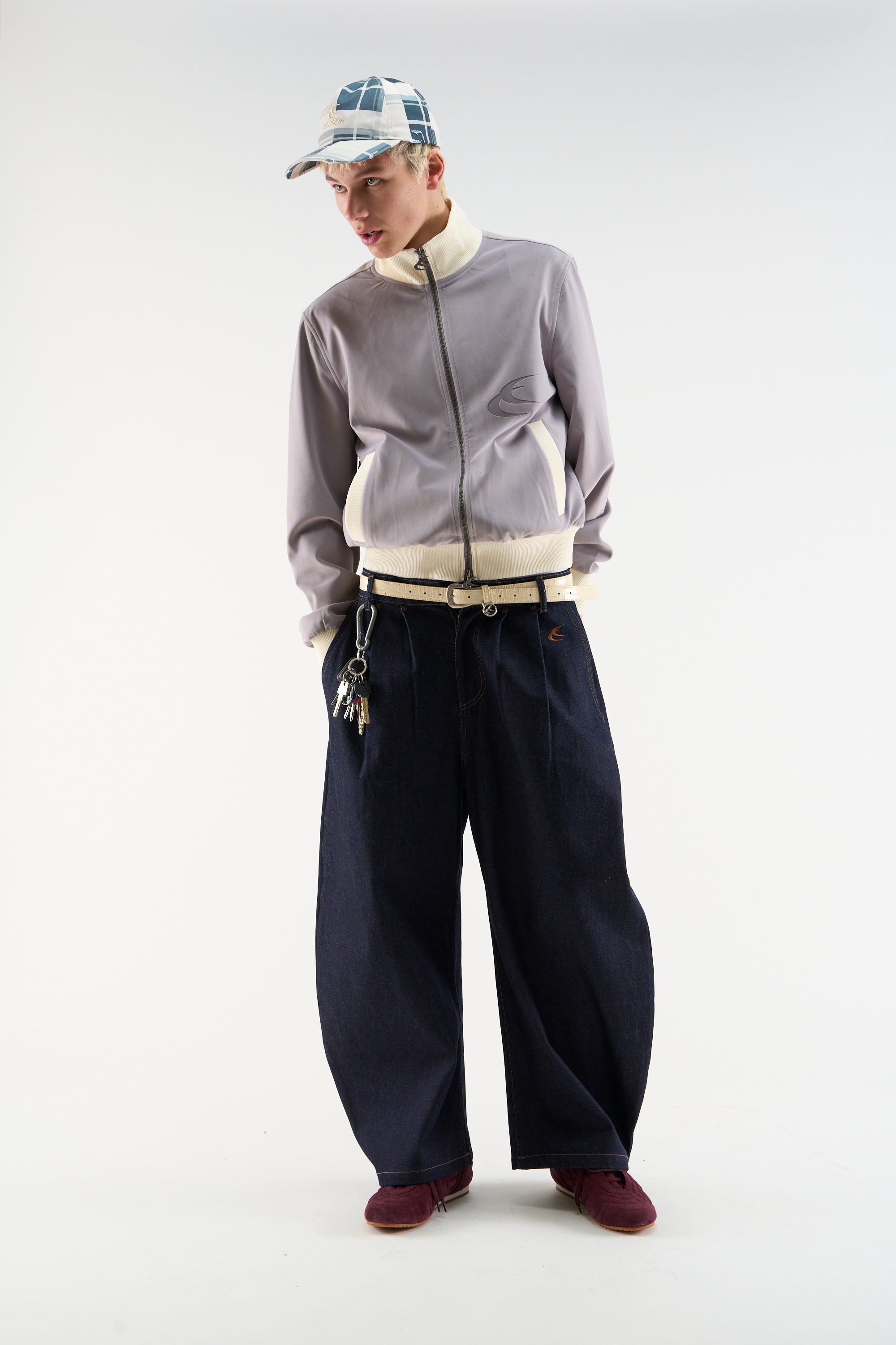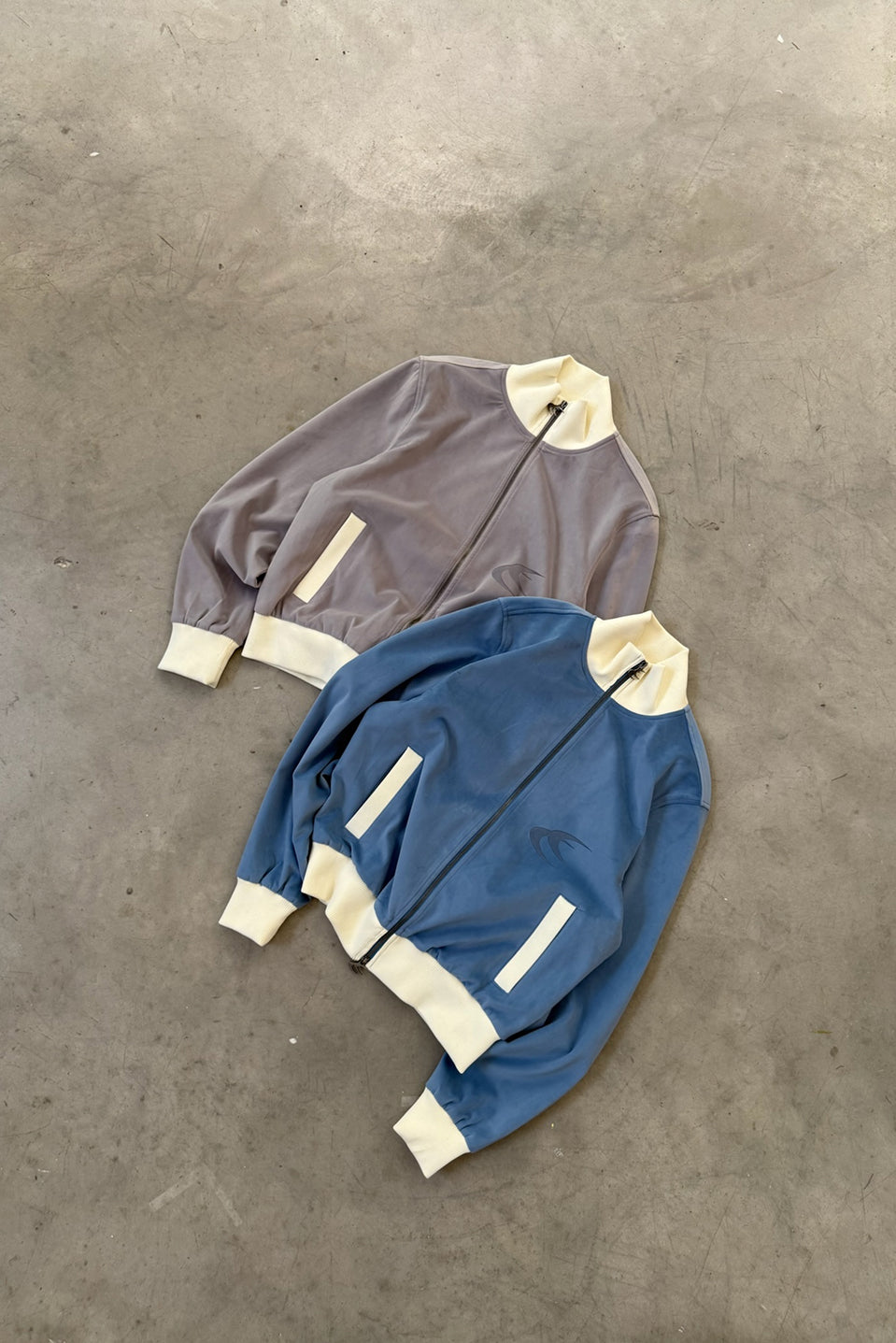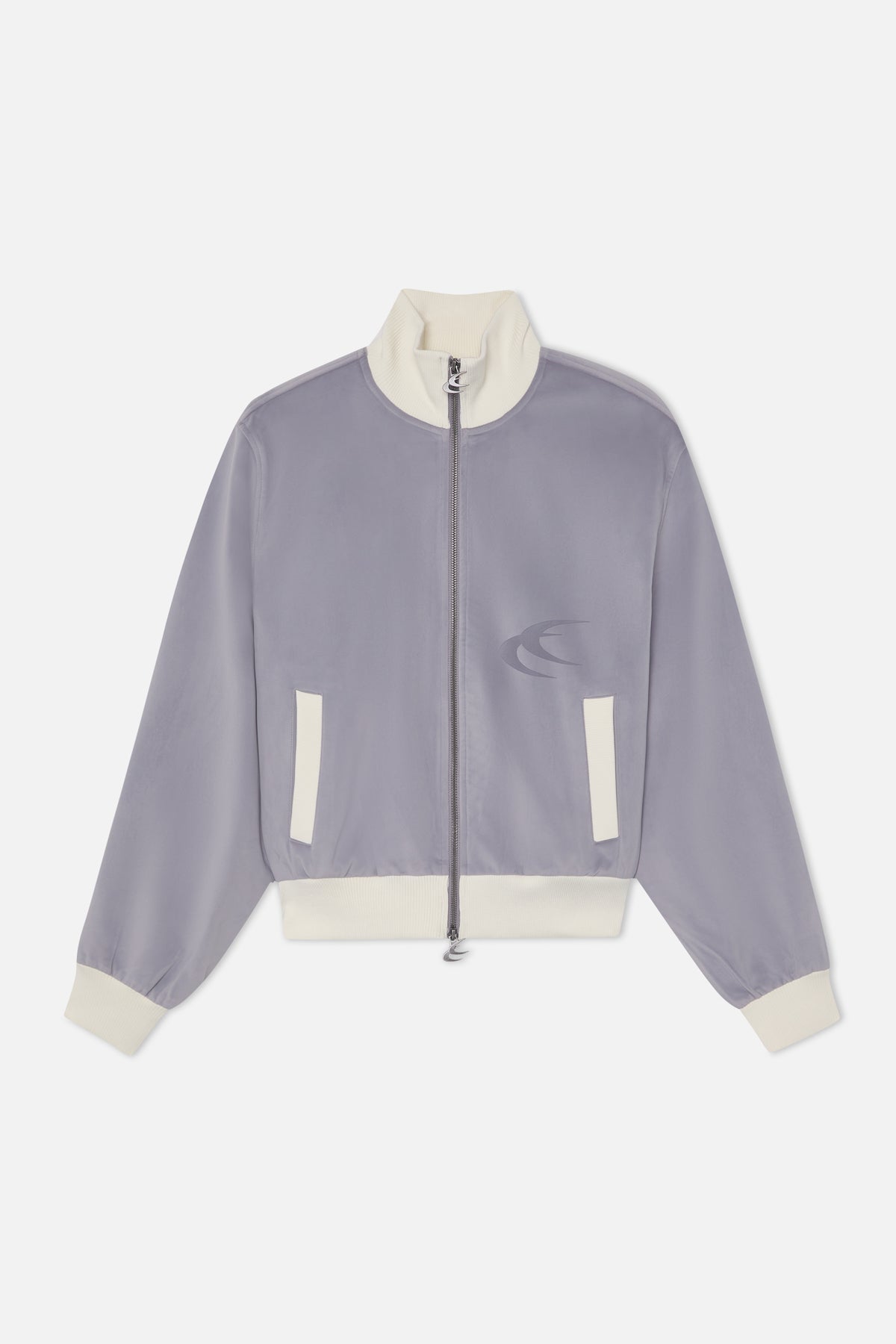 Light Grey Track Jacket in smooth technical fabric with a cropped, relaxed fit. Features contrast ribbed funnel neck, cuffs, and hem in off-white. Zip front closure with logo puller, side welt pockets, and tonal logo print on the chest.
