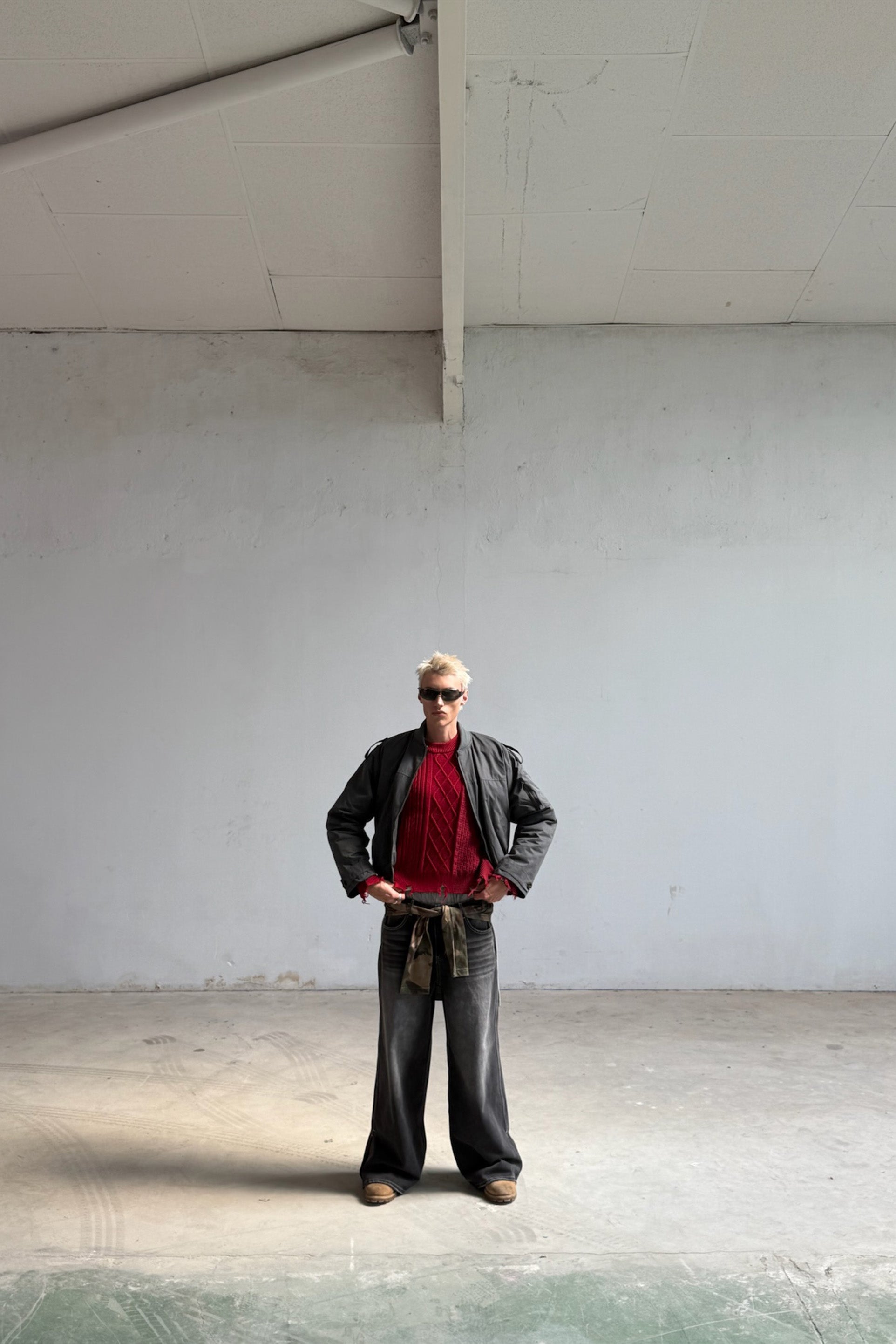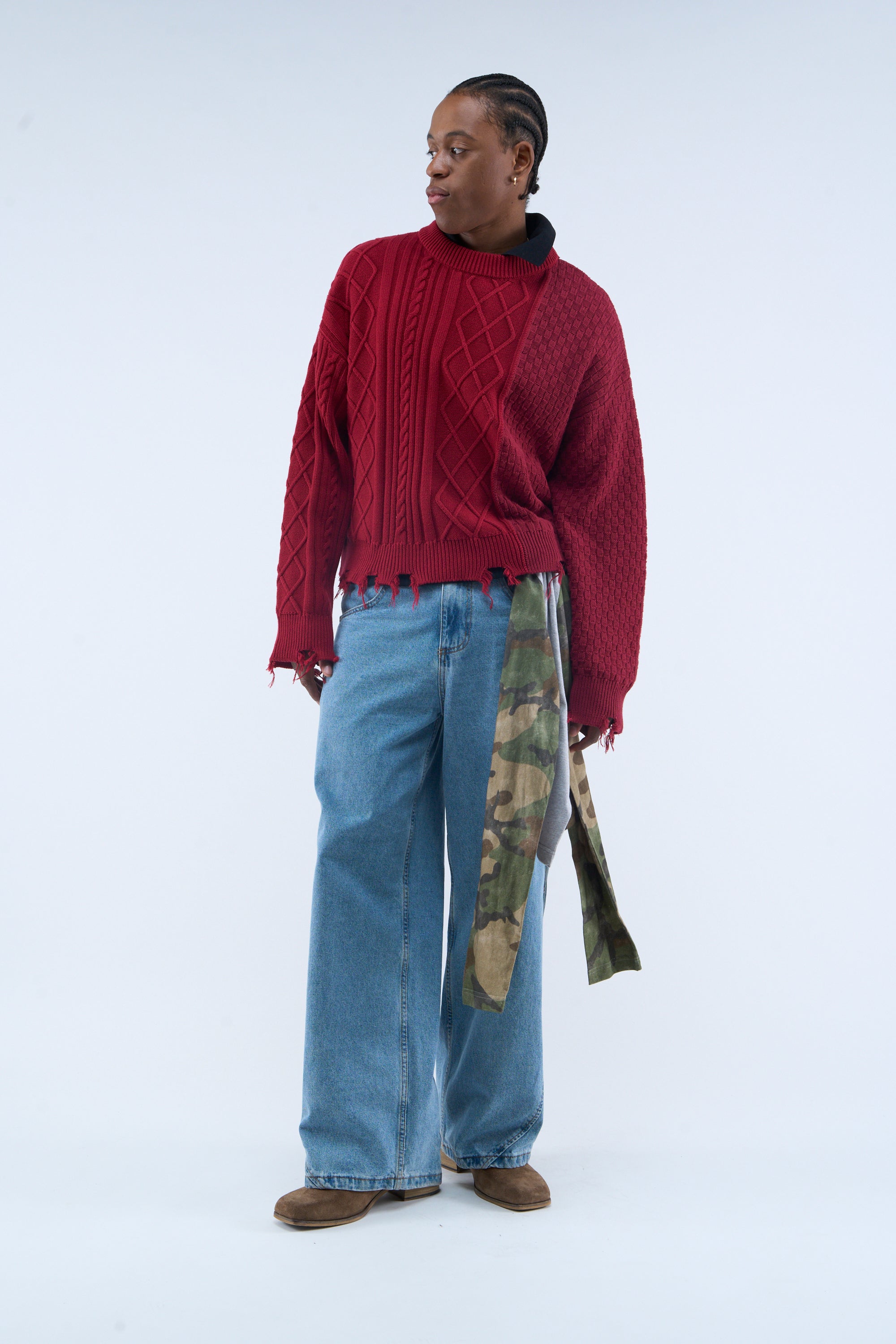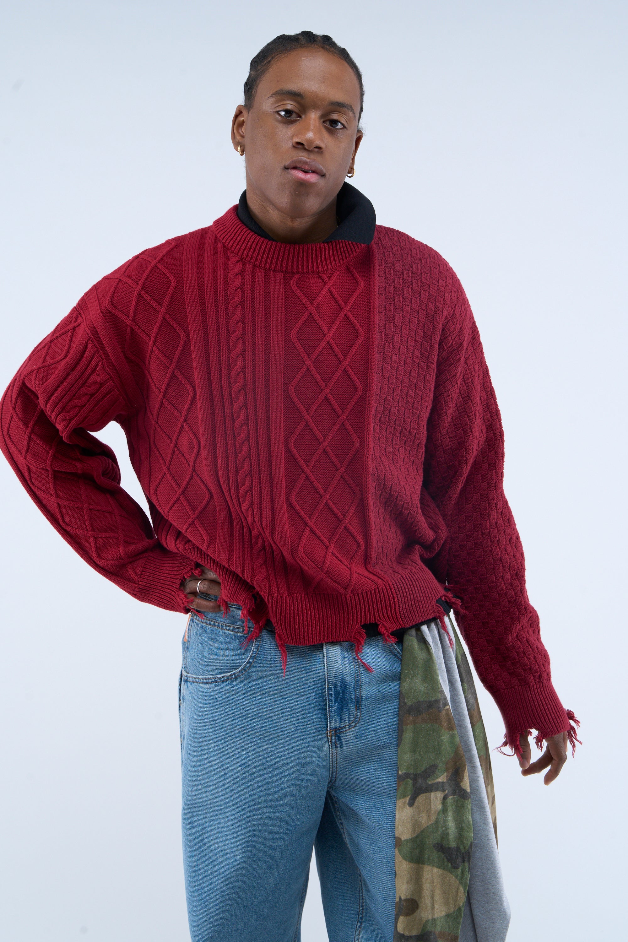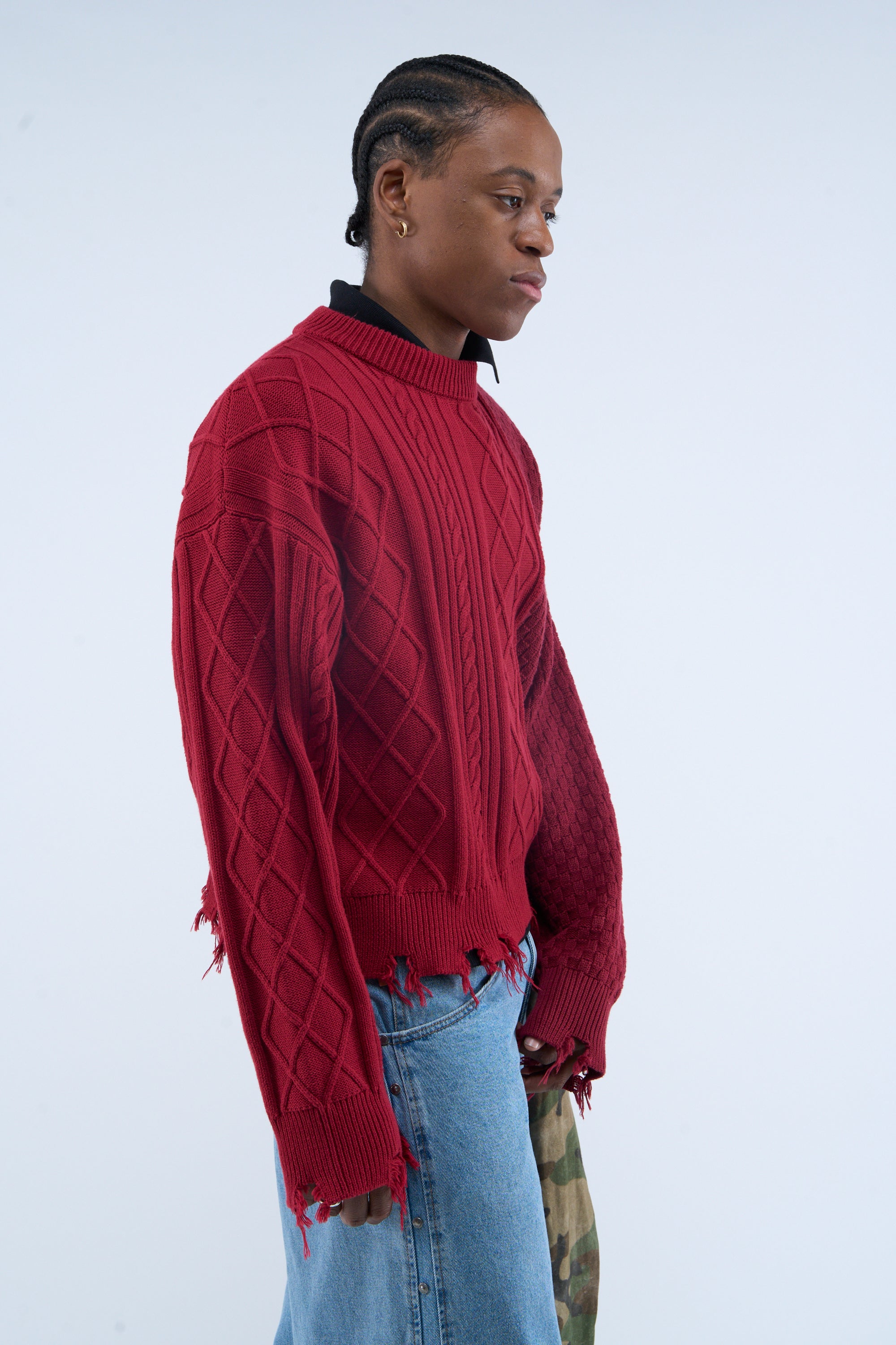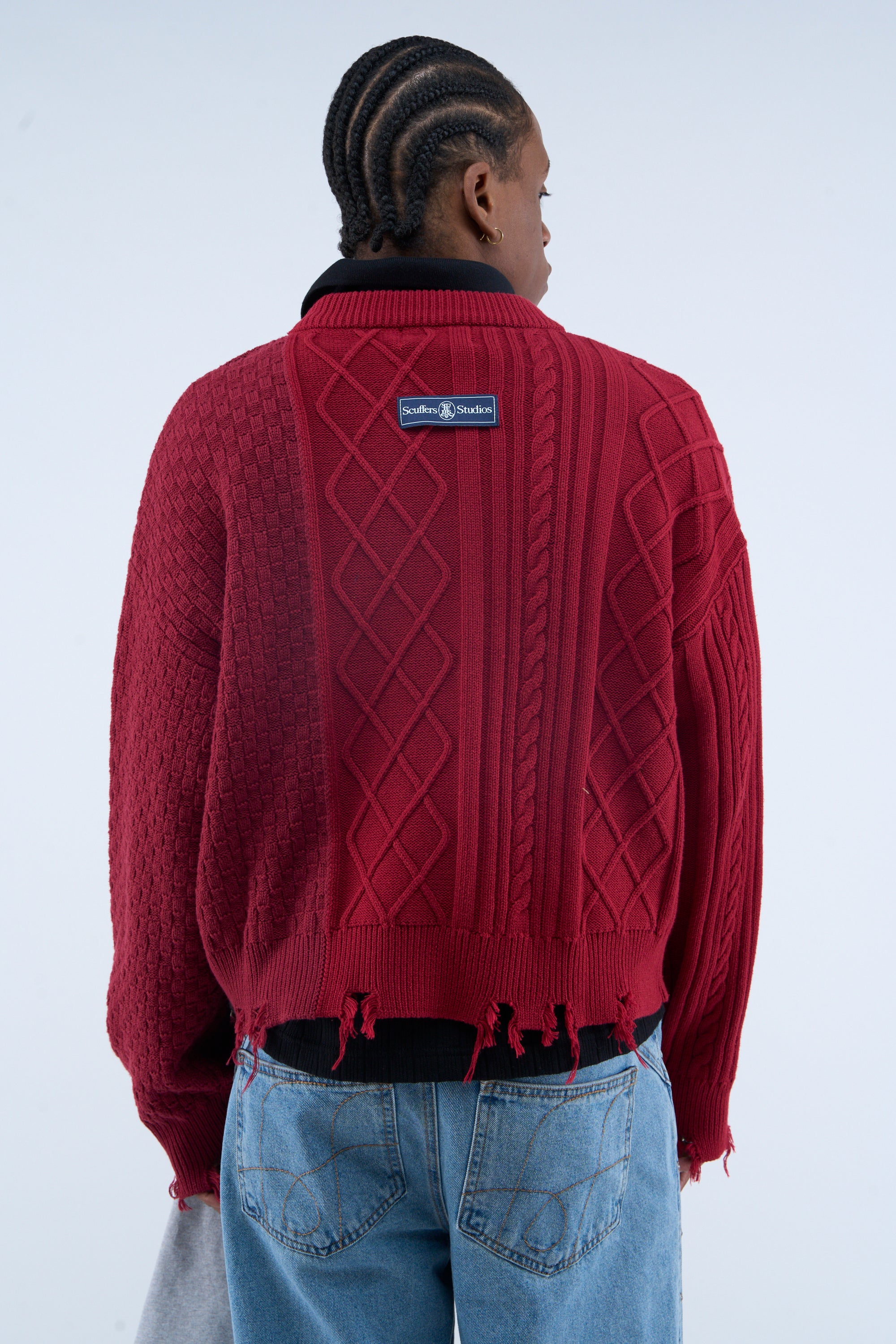 Burgundy Knit Sweater featuring a unique mix of textured cable knit patterns. The design includes a cropped fit with frayed edges at the hem and sleeves for a distressed, modern touch. One side showcases a classic diamond cable knit, while the other side has a contrasting smaller, ribbed texture, creating a visually striking asymmetry. The sweater is finished with a branded "Scuffers Studios" patch at the back neckline for subtle detailing.