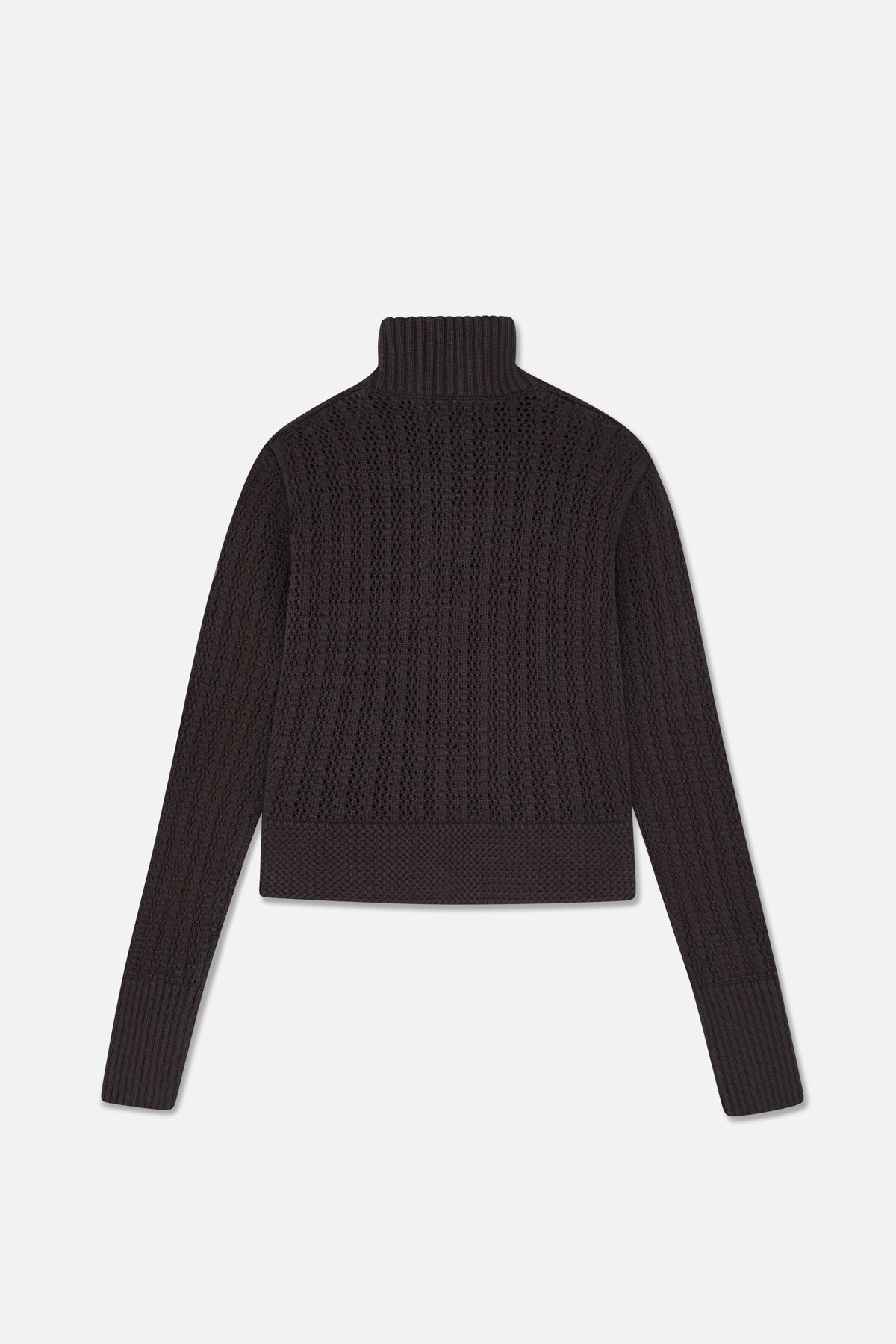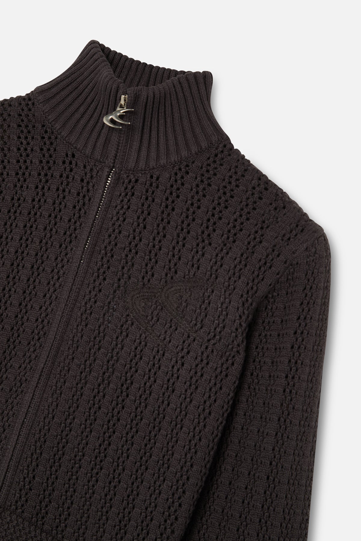 Brown Zip-Up Knit Cardigan in soft textured knit fabric. Slim fit with a cropped length. High collar with full front zip closure and metal pull detail. Ribbed cuffs and hem for structure. Subtle tonal logo detail on the chest.
