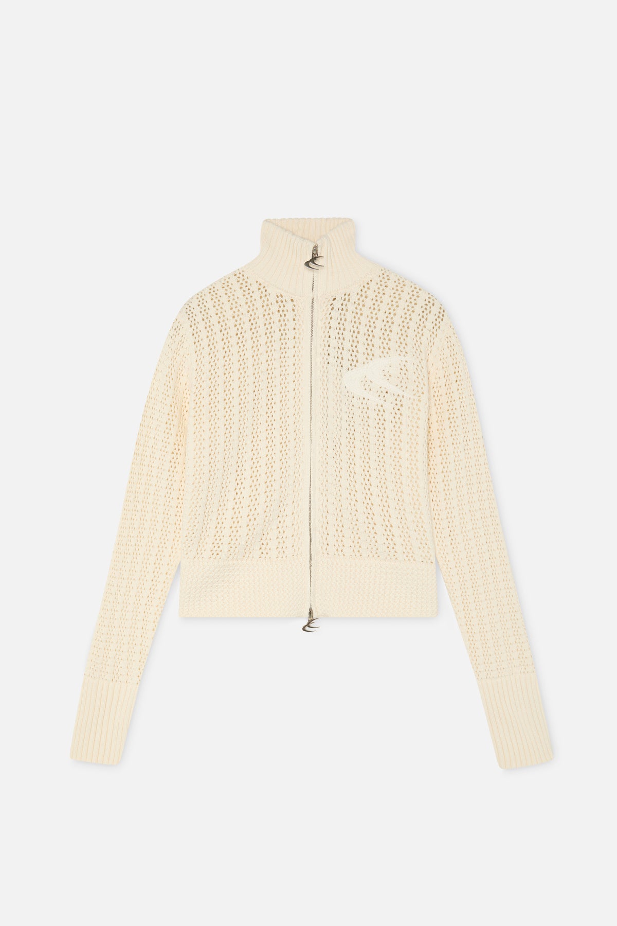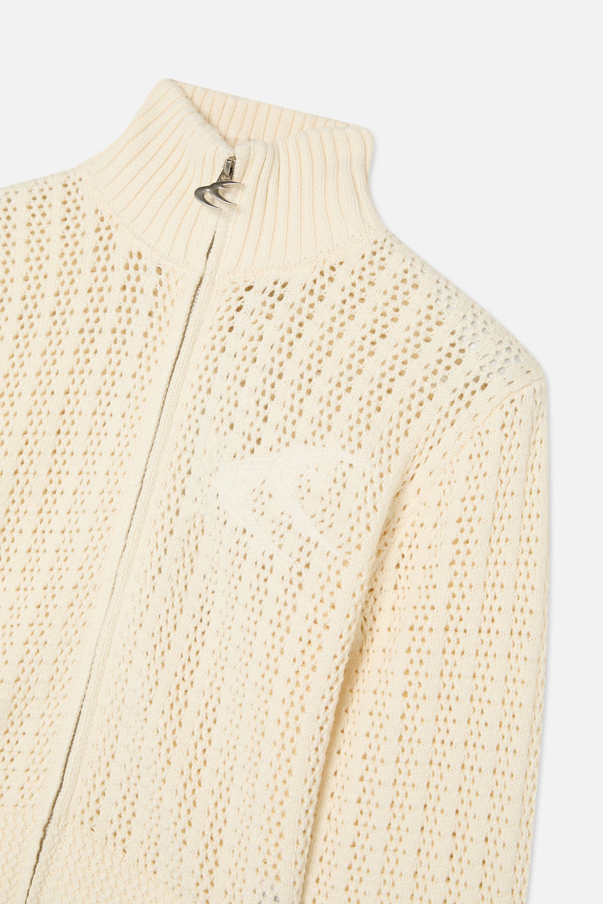 Cream Zip-Up Knit Cardigan in soft textured knit fabric. Slim fit with a cropped length. High collar with full front zip closure and metal pull detail. Ribbed cuffs and hem for structure. Subtle tonal logo detail on the chest.