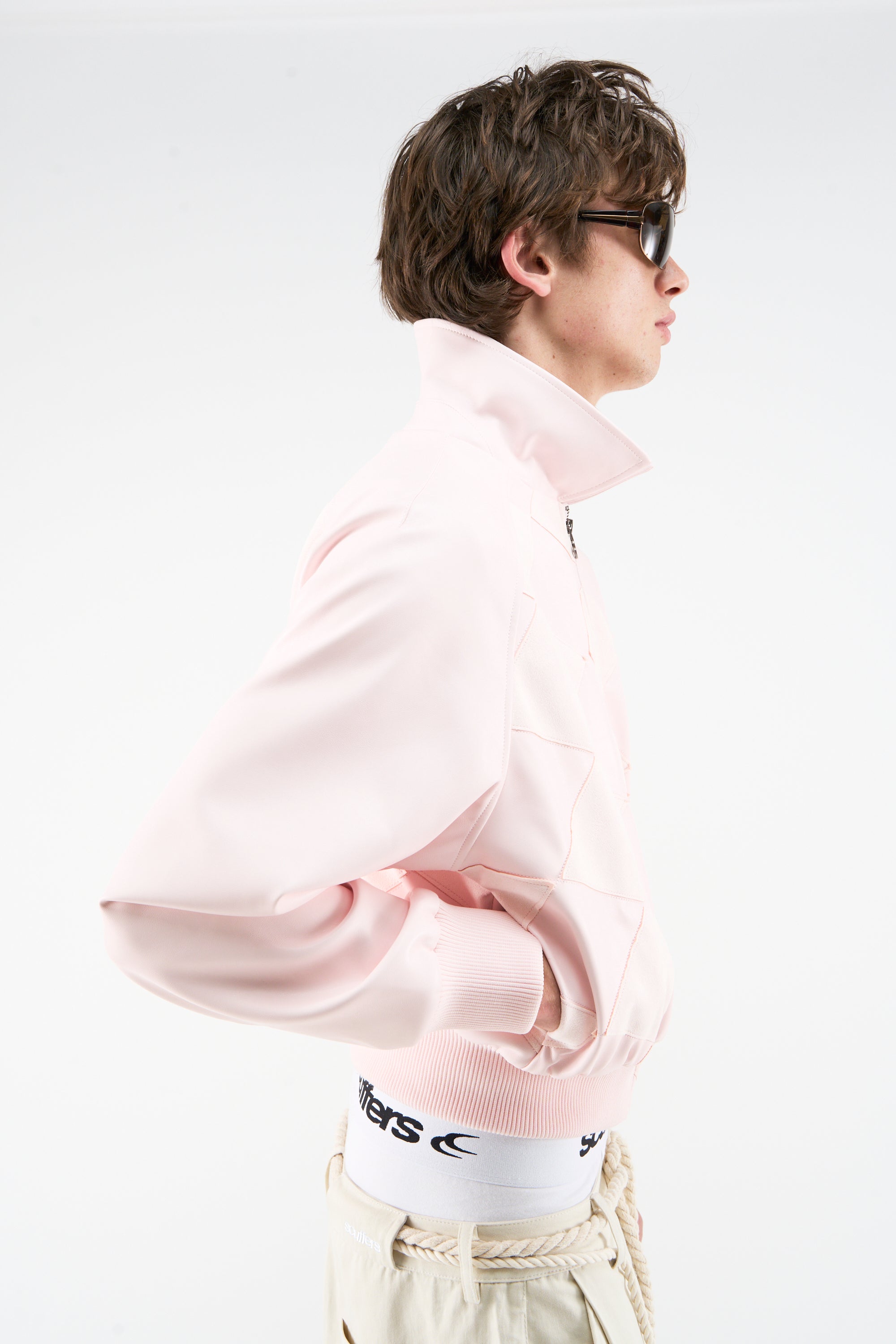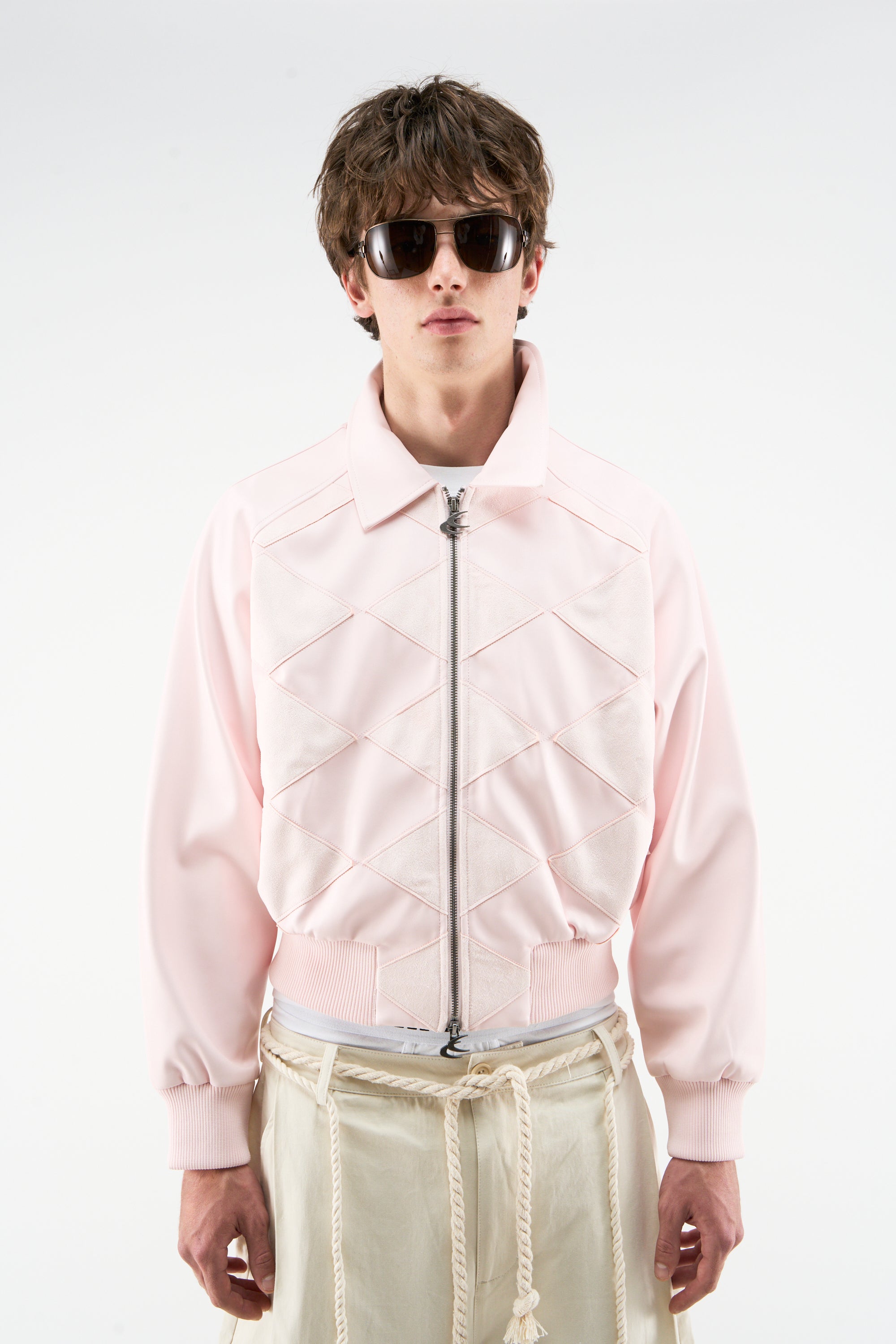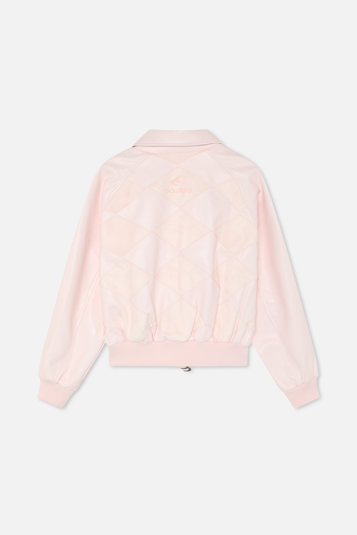 Pink faux-leather bomber jacket with contrast suede diamond patchwork across the front and back. Cropped, relaxed fit with a stand collar, full zip closure, and ribbed hem and cuffs. Back finished with Scuffers logo print at the upper panel.