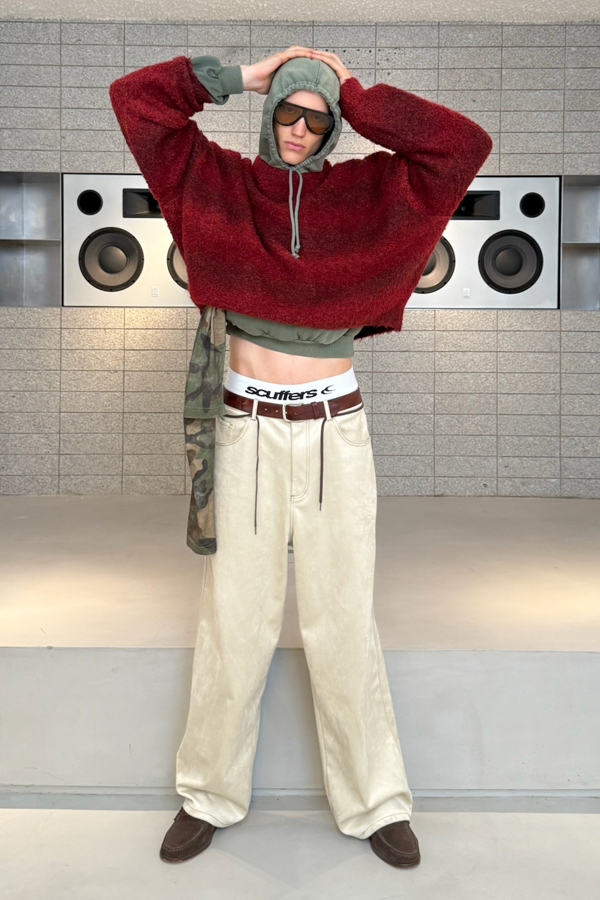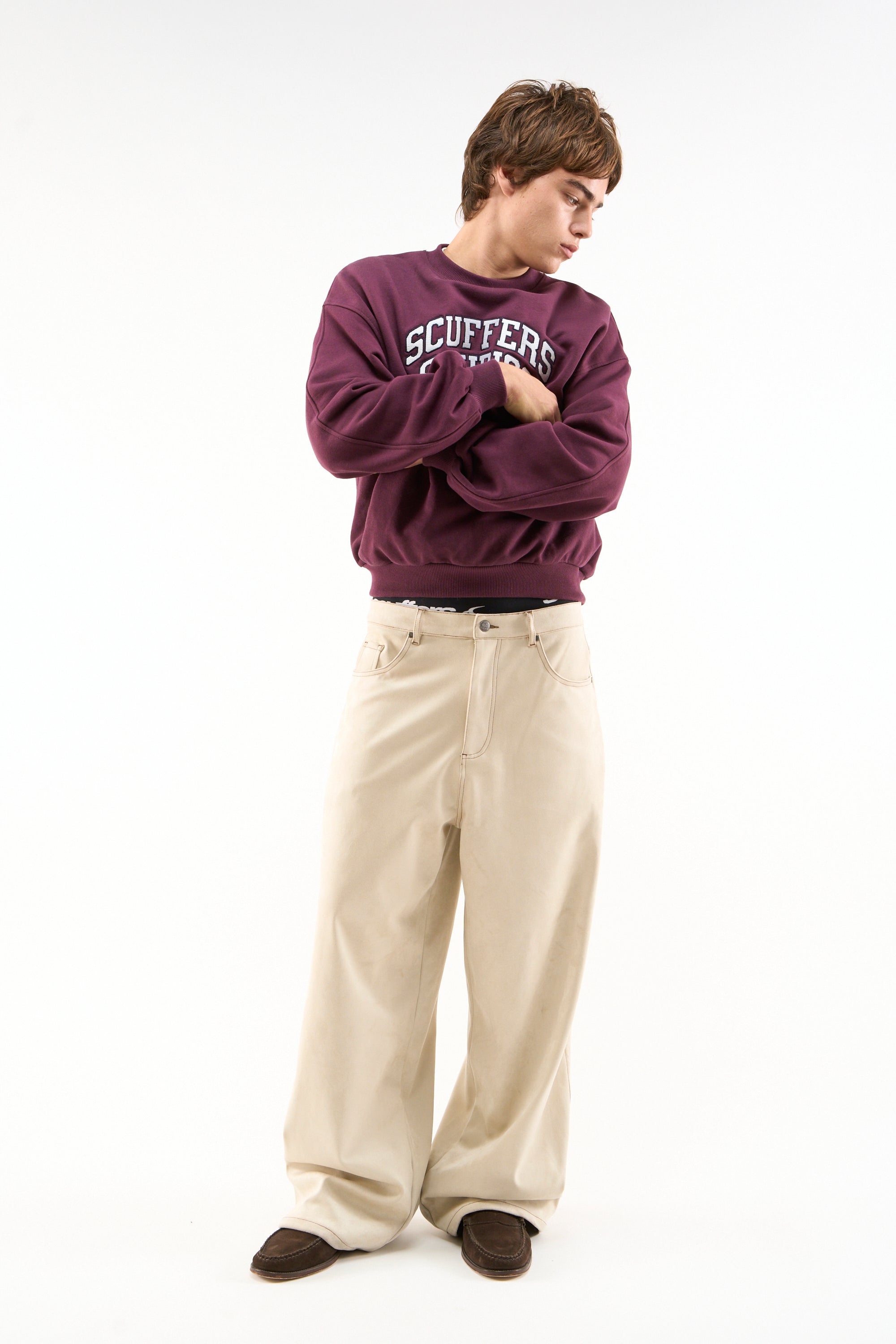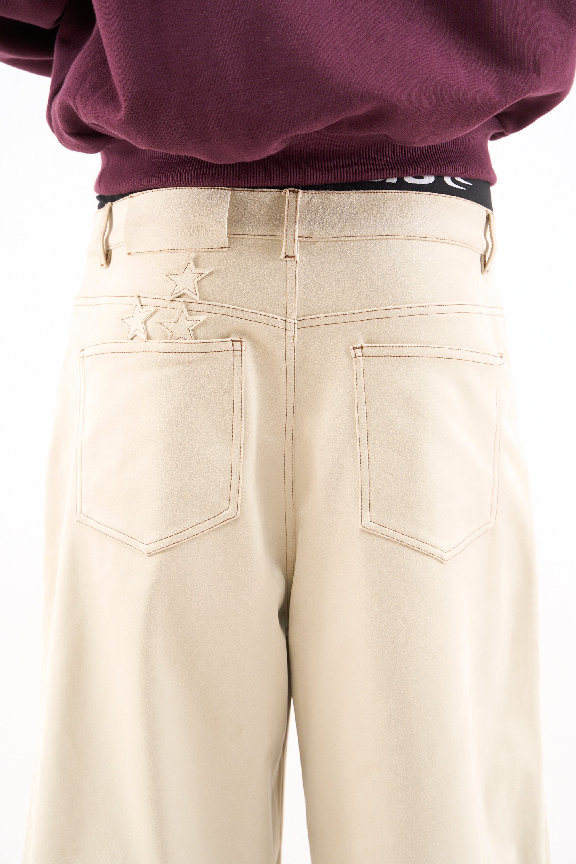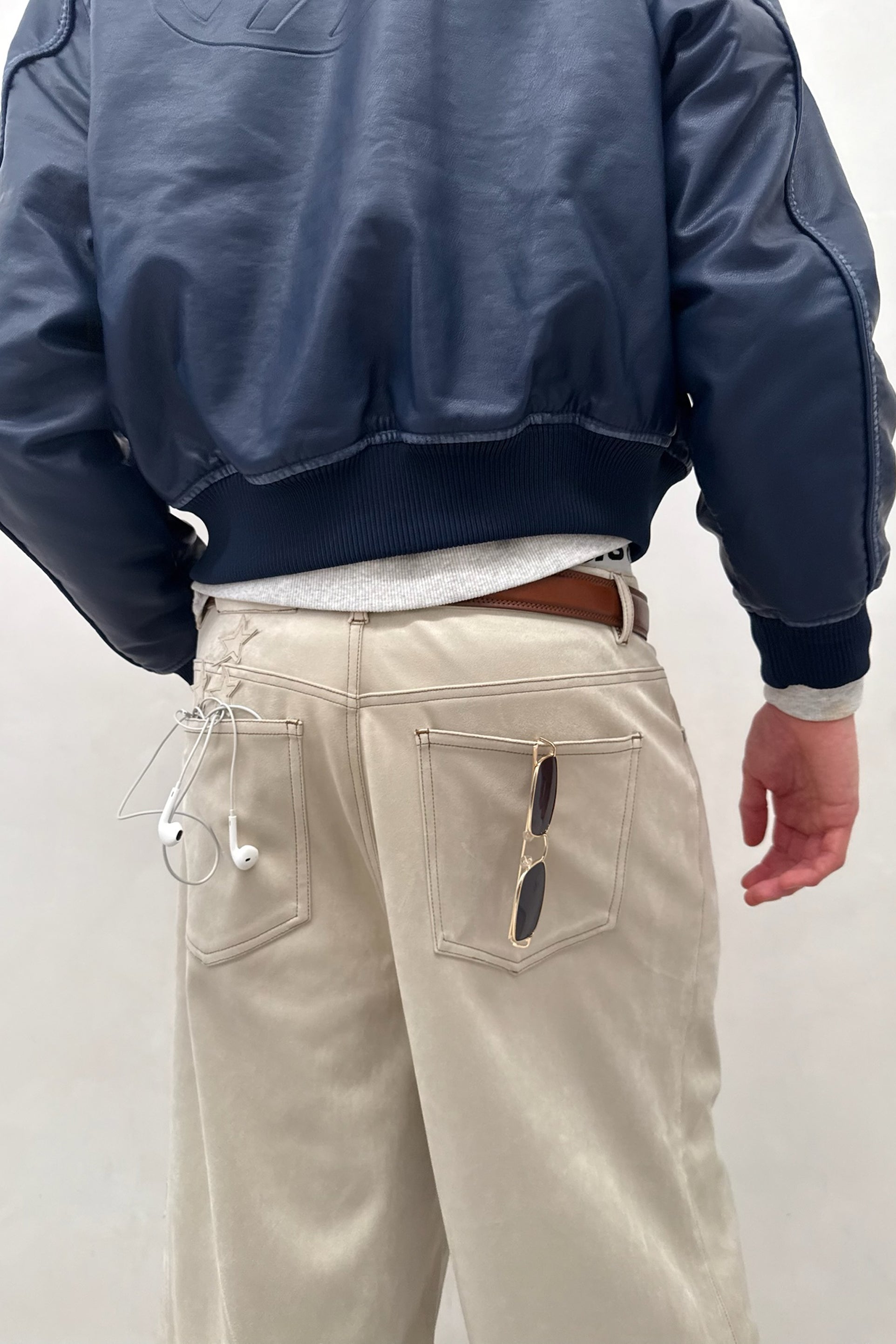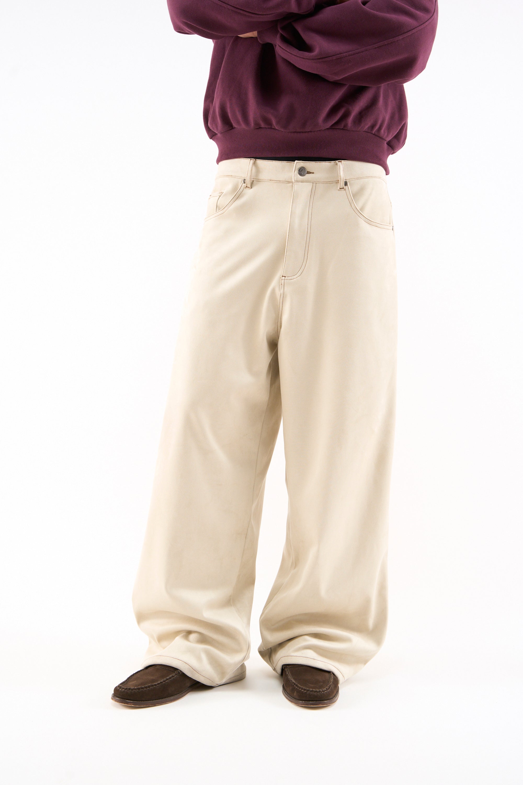 Suede Grey Jumbo Pants featuring a wide-leg fit with classic five-pocket styling. The pants have a high waist and button-up closure with yellow contrast stitching that adds a subtle pop of color. Embossed stars detail the back, giving them a unique and bold look. Perfect for a relaxed yet stylish vibe.