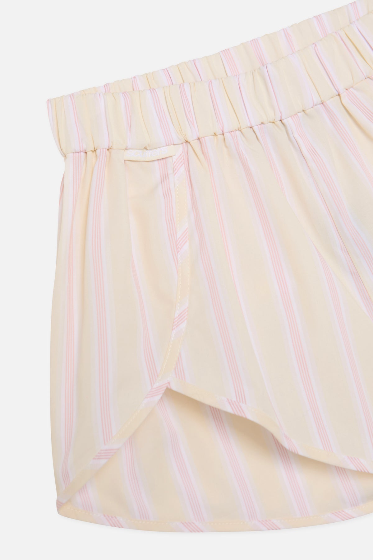 Striped Runner Shorts in Yellow made from lightweight cotton fabric with a soft feel. Features an elasticated waistband, curved hems with binding, and side pockets. Subtle Scuffers branding on front tag. Relaxed fit with a short inseam.