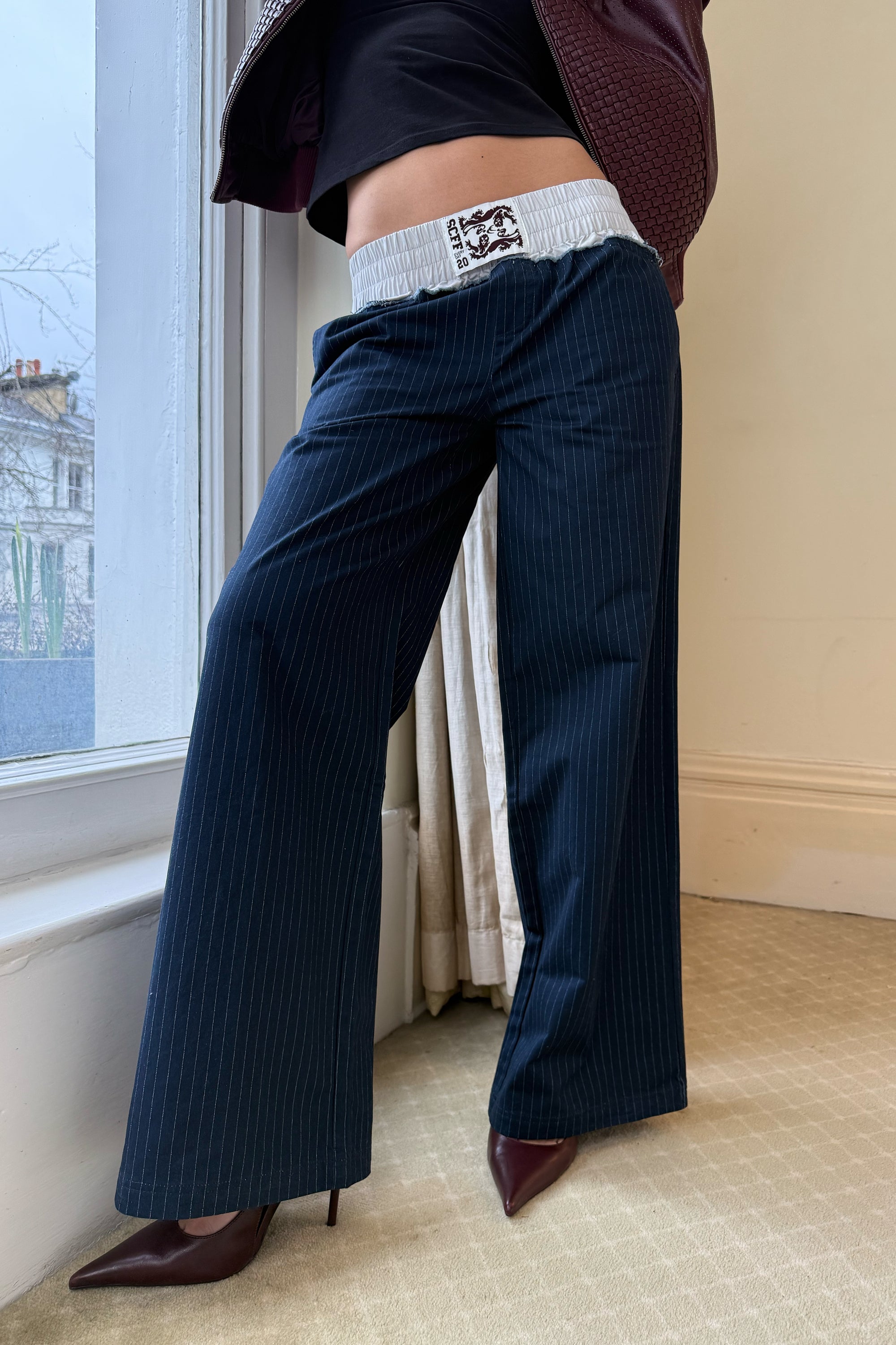 Navy Pinstripe Trousers with a hybrid layered waistband. Relaxed straight-leg fit with pressed front pleats. Elasticated contrast top waist with raw-edge seam detail and printed Scuffers graphic at back. Side pockets and single back welt pocket.