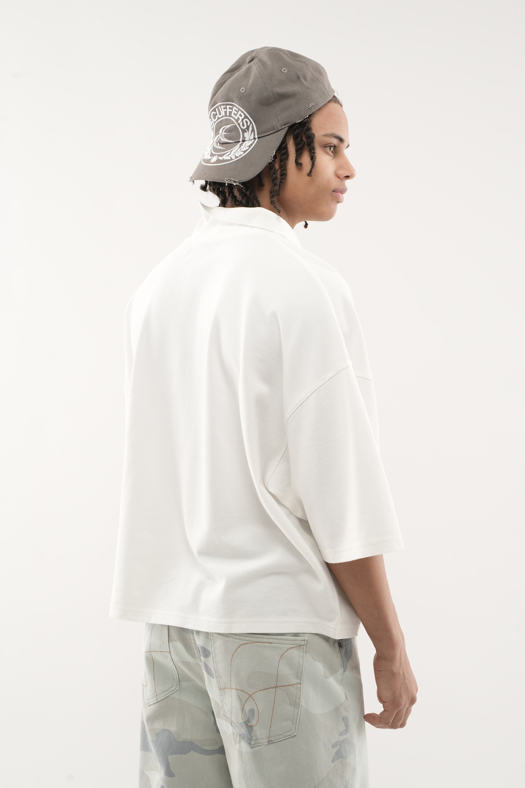 Ecru Polo Shirt in midweight cotton piqué with relaxed, boxy fit. Features embroidered Scuffers logo and repeated horse rider graphic across chest. Classic polo collar with three-button placket and dropped shoulders.