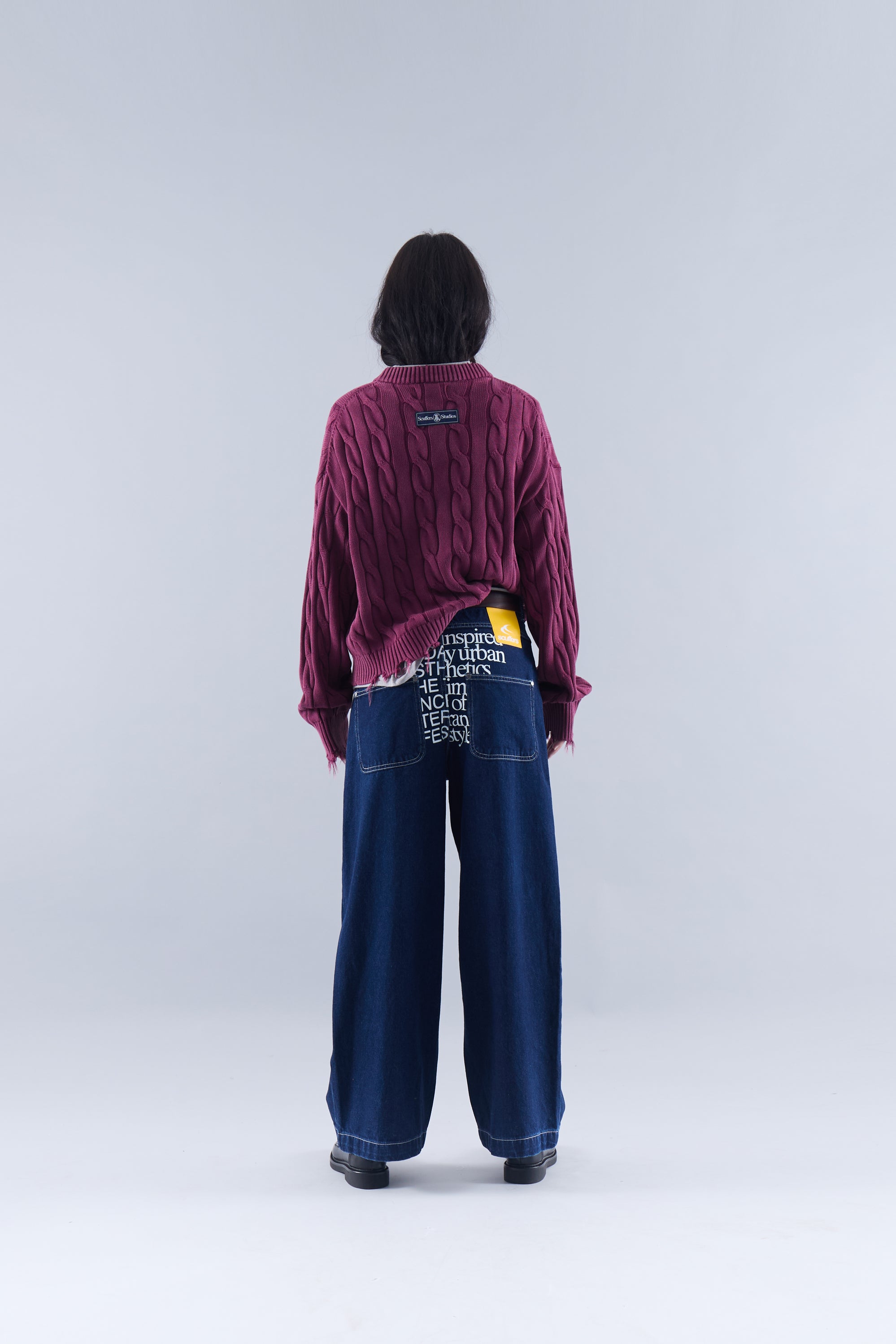 Oversized burgundy cable knit sweater.  'Scuffers Studios' label on the back. Ripped effect details on the sleeves, waistband and collar.
